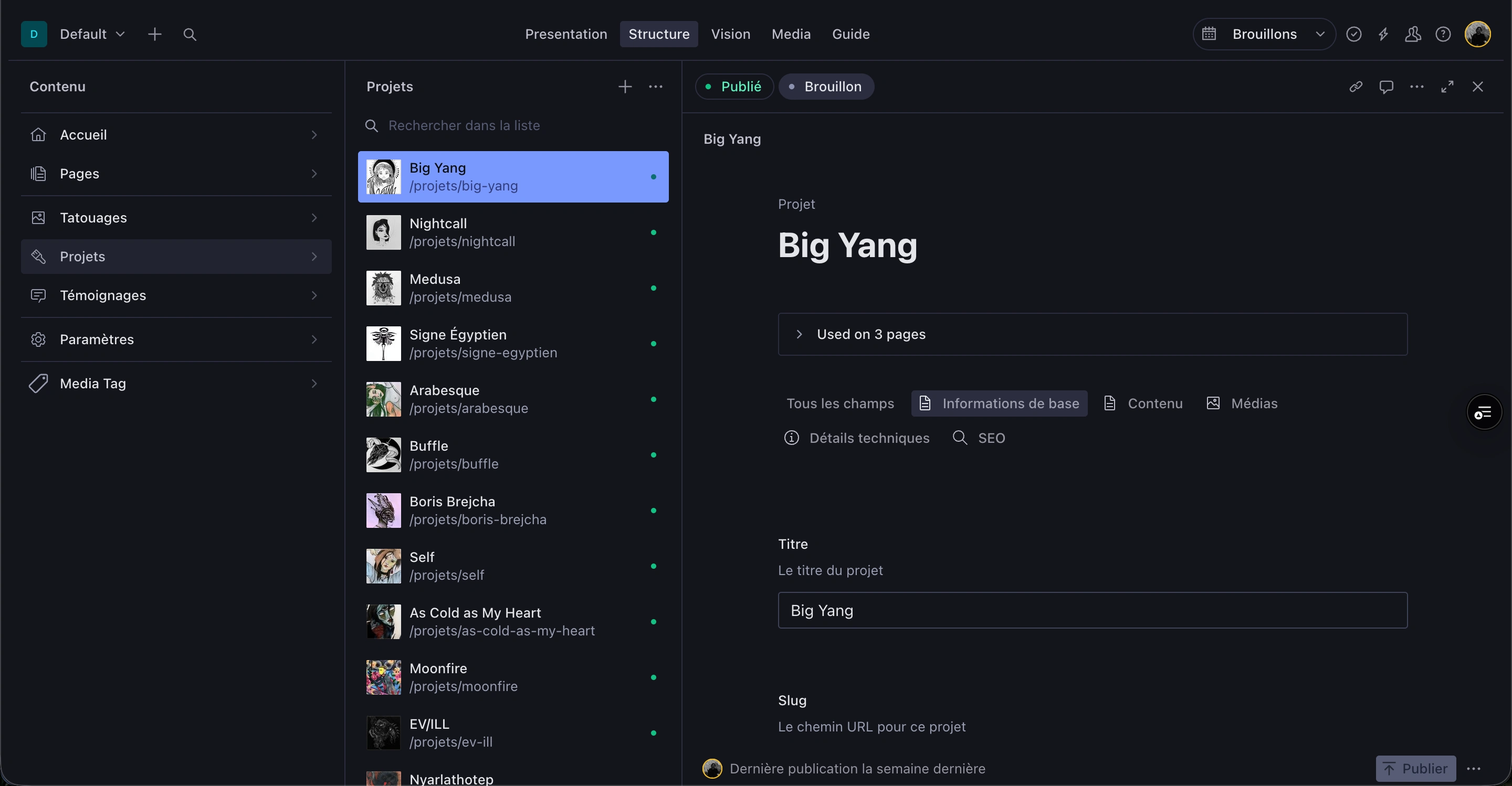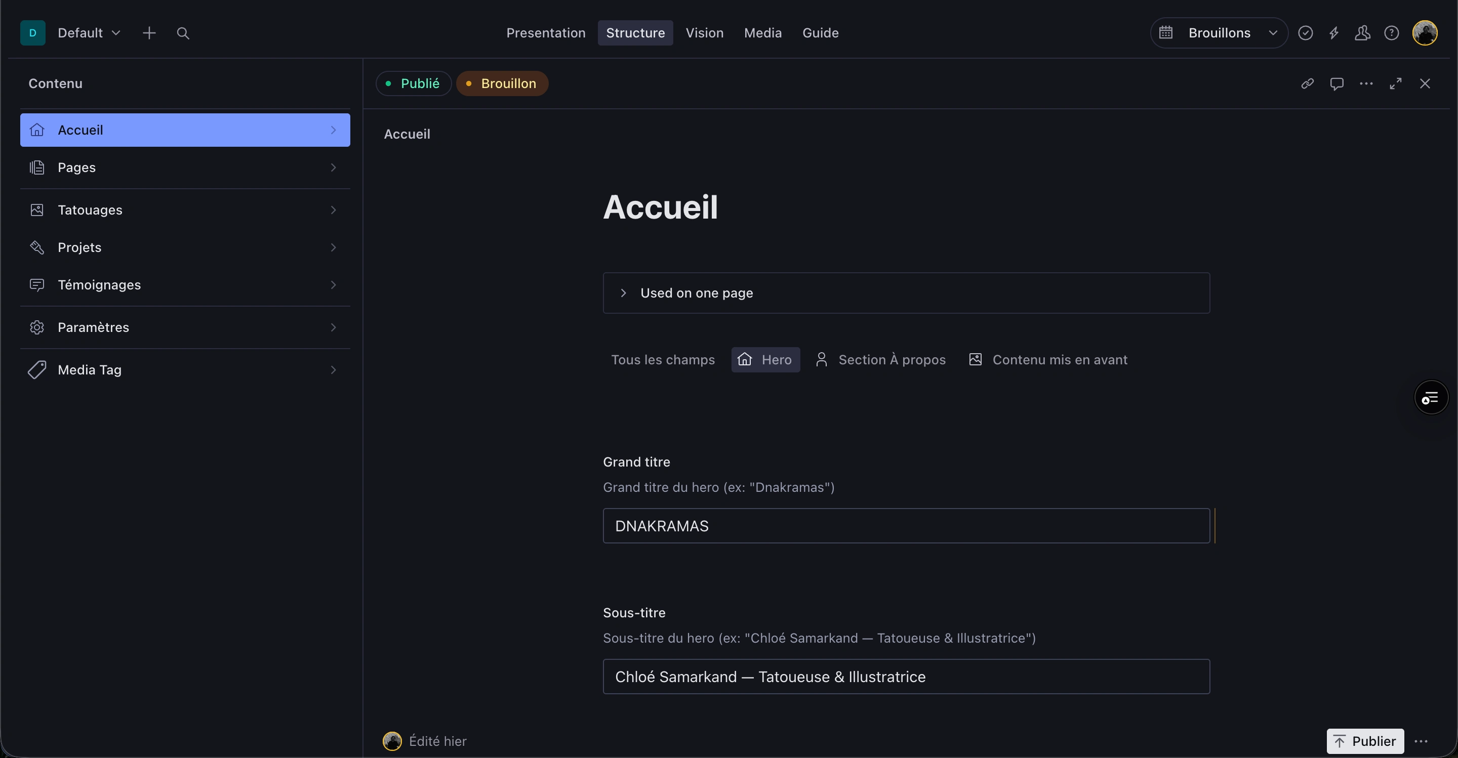 Chloé manages all her own content: tattoo galleries, illustration case studies, studio info, FAQ, aftercare, legal pages, booking URL, footer Instagram feed, and global SEO defaults — without any developer dependency after handoff.