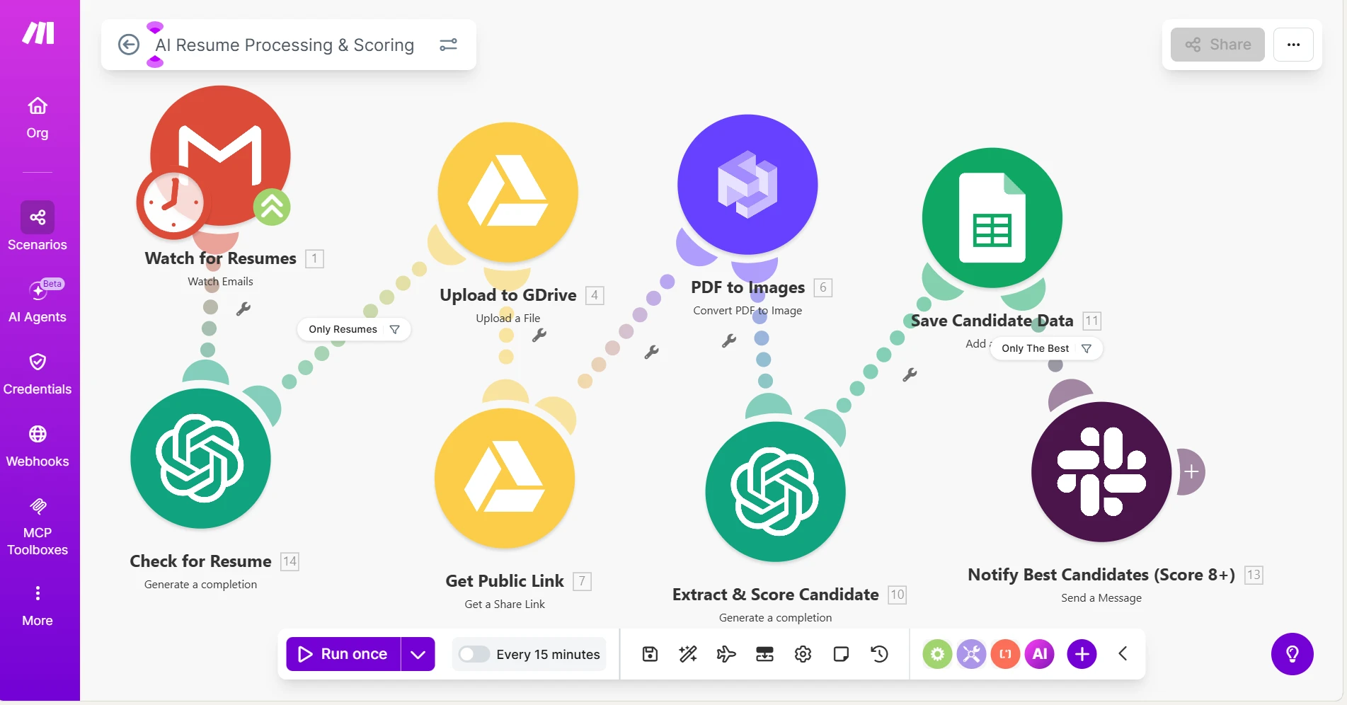 An automated hiring pipeline that reads every CV the moment it arrives, scores candidates against the job requirements, ranks them, etc....