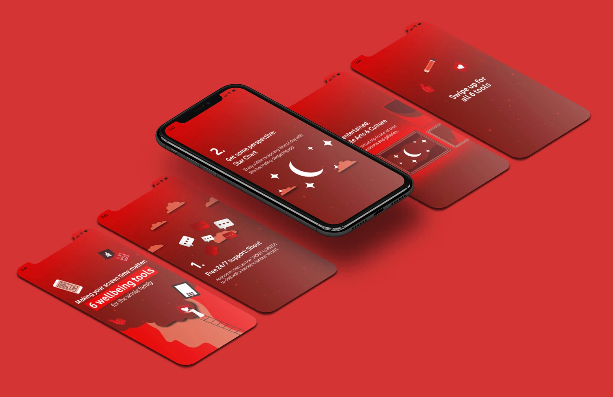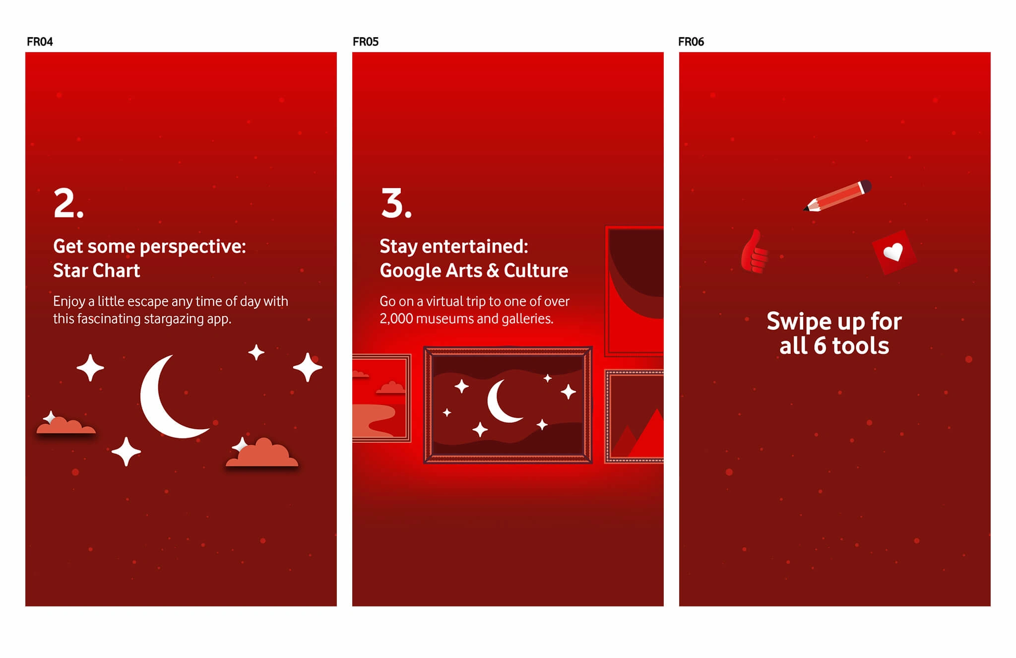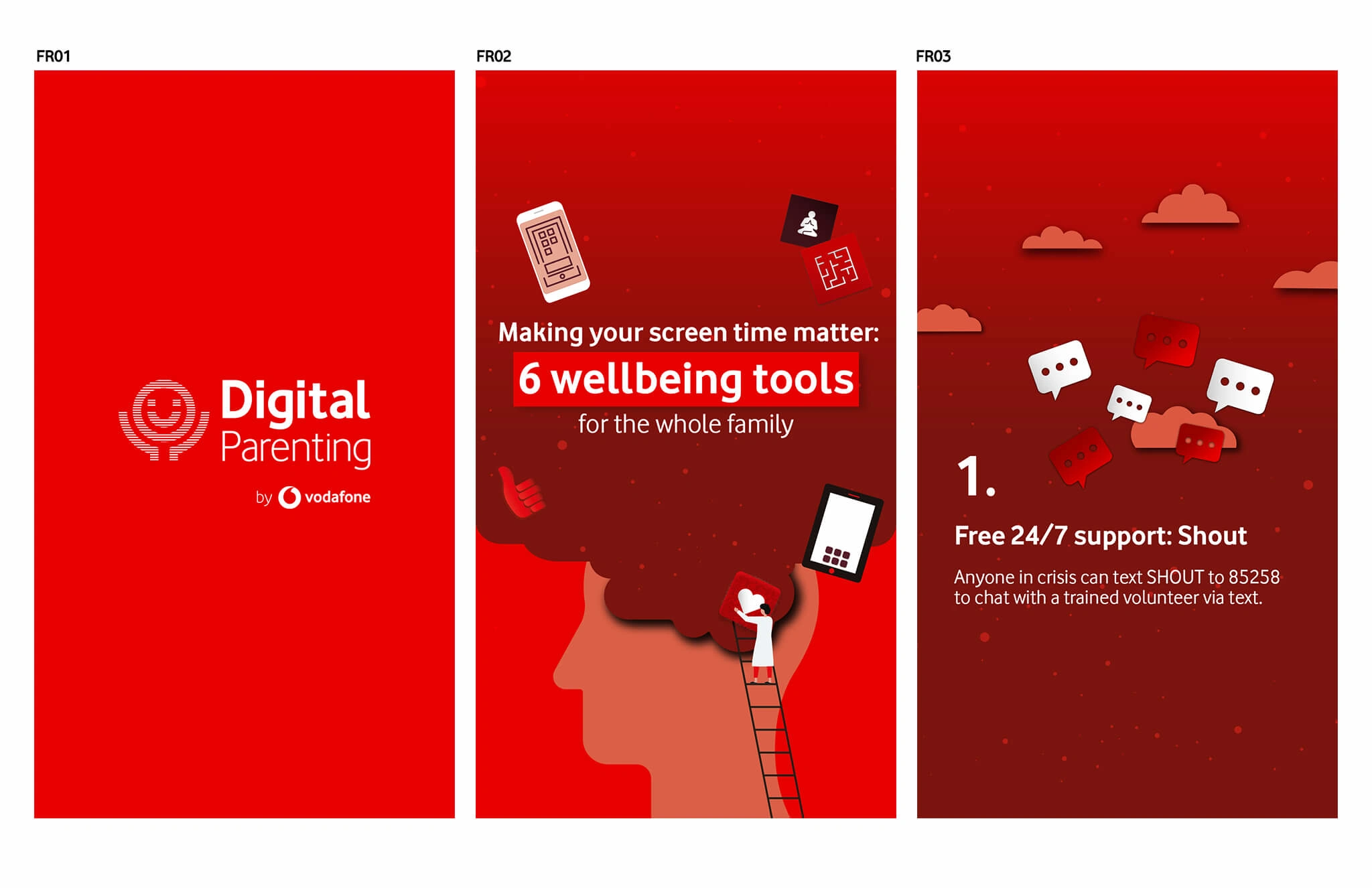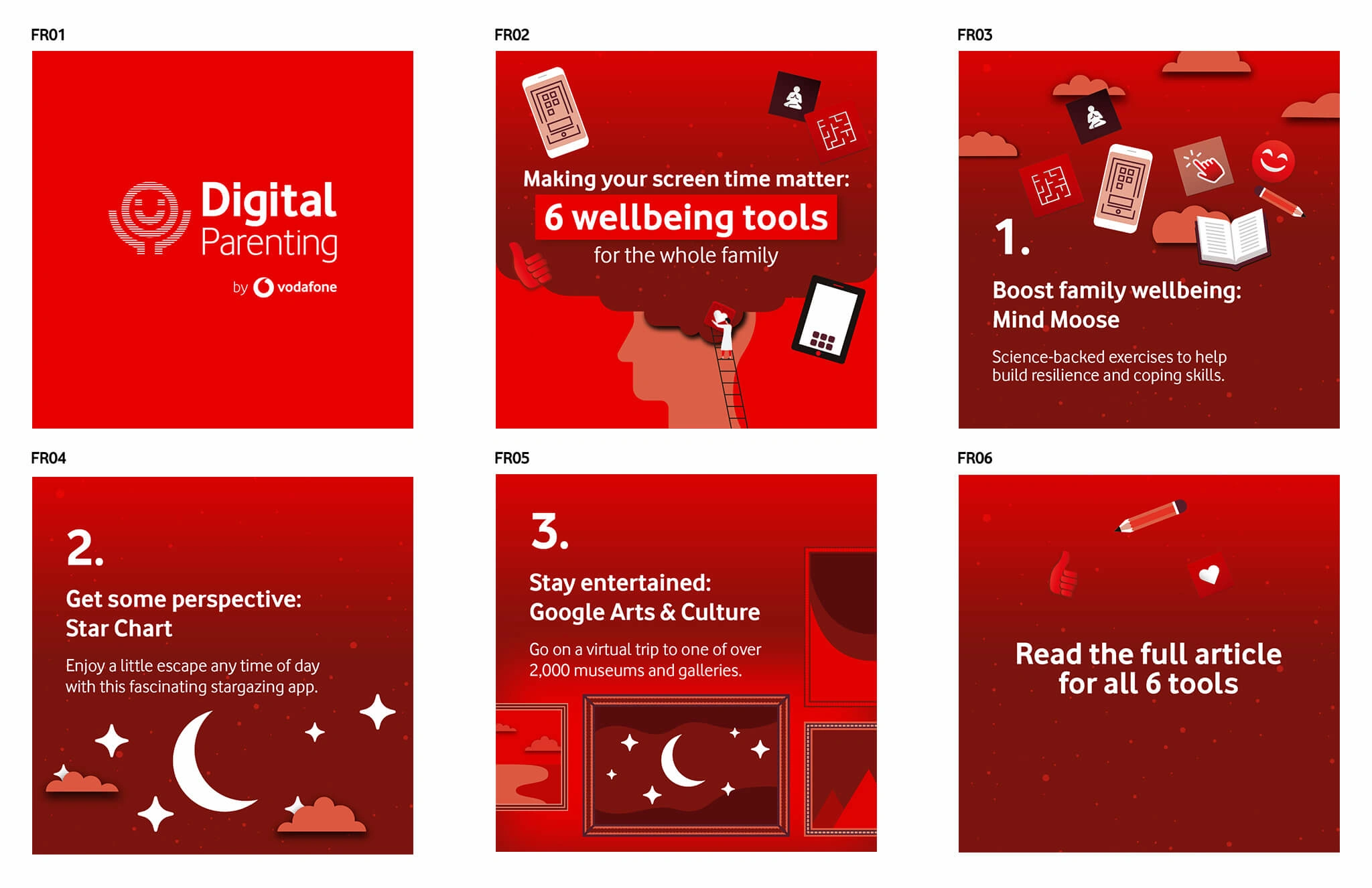 Design visually engaging animations that effectively showcase Vodafone’s mental health tools. The animations needed to be clear, accessible, and compelling, ensuring they captured attention and encouraged users to explore the full toolset.