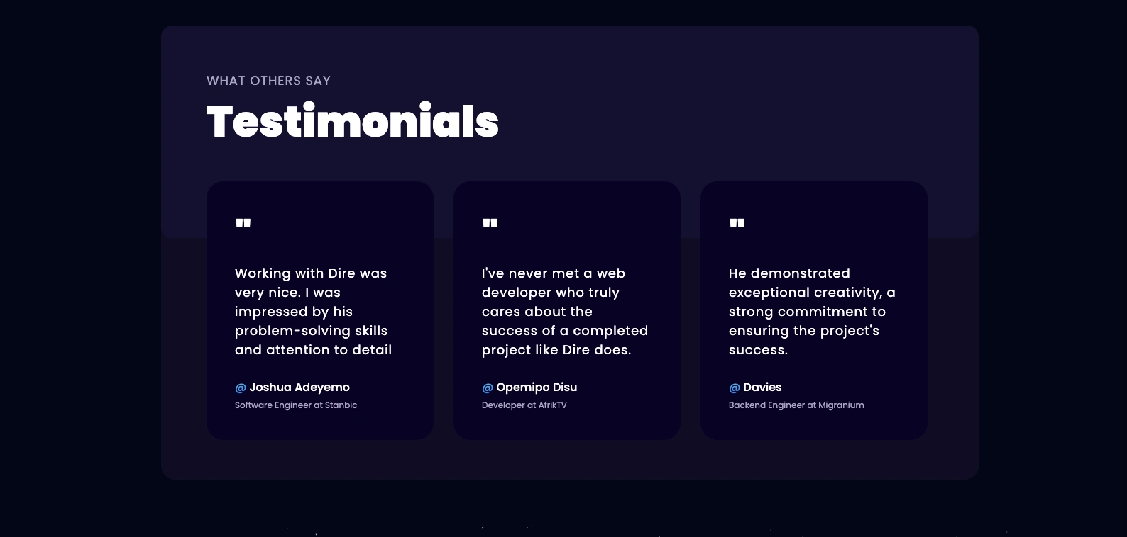 I’m Temidire, a front-end engineer with a strong interest in building thoughtful, user-focused web experiences. I enjoy turning ideas into clean, functional interfaces and using code as a tool to solve practical problems. This website is a space where I share my work, experiment with new technologies, and refine my approach to building modern web products. I’m constantly learning, exploring better ways to design and develop, and pushing myself to create experiences that feel simple, useful, and well-crafted.