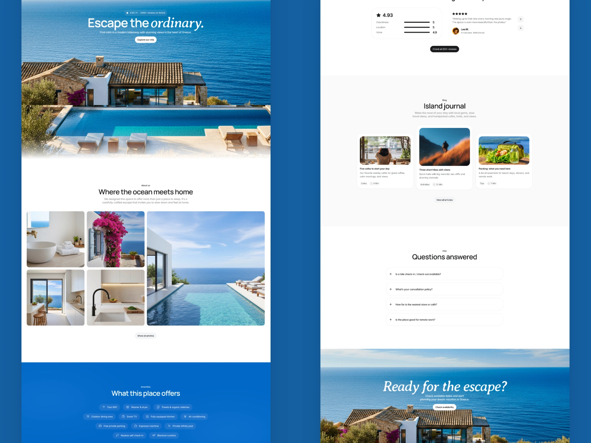 The Stay is a clean, modern Framer website template designed for vacation rentals, boutique villas, and Airbnb listings. Built for fast, beautiful publishing, it includes all the essentials — a hero section, booking CTAs, property highlights, image galleries, testimonials, FAQs, and even a blog section for local tips or slow-living inspiration.