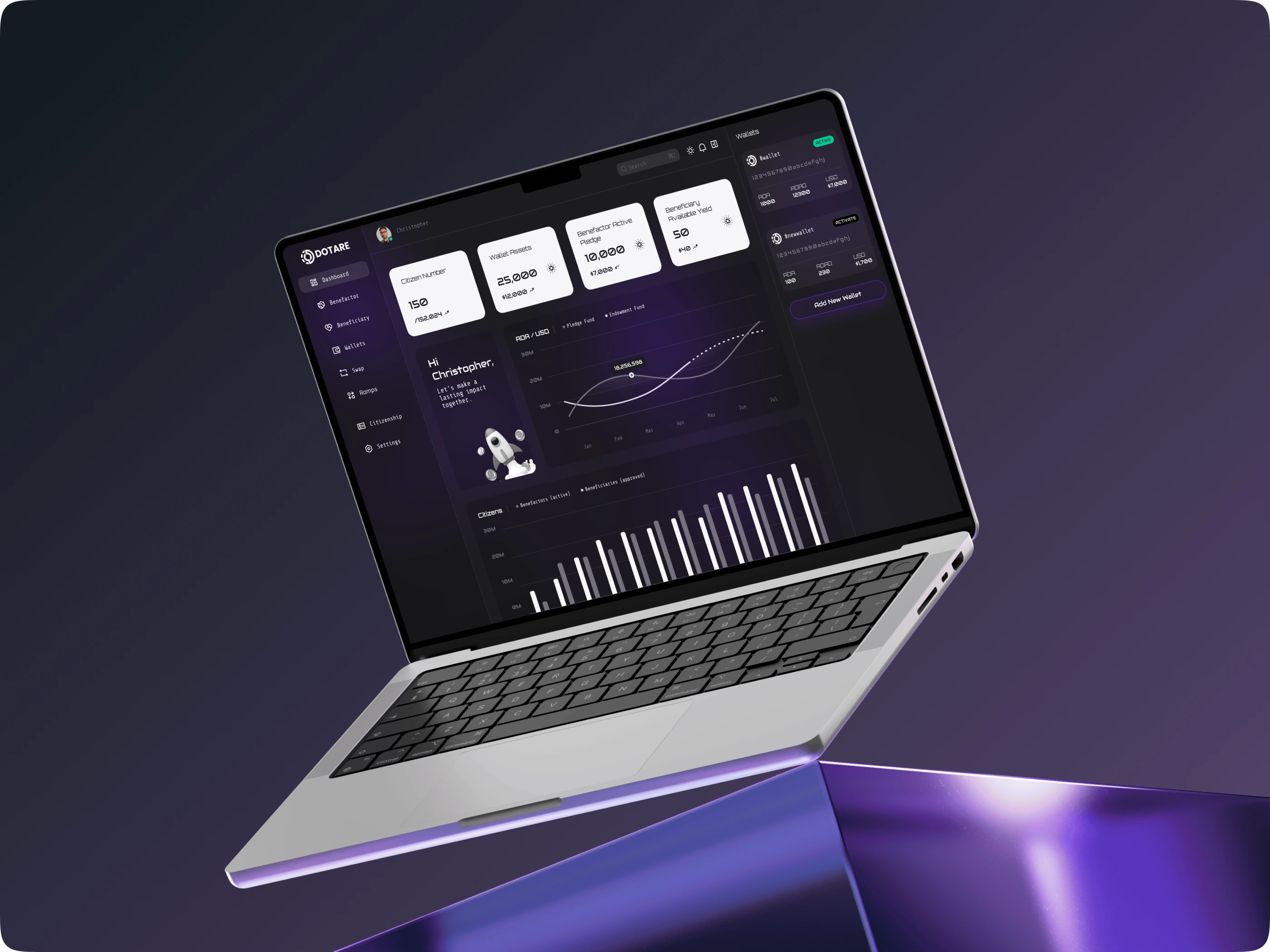Traditional DeFi and philanthropy platforms often overwhelm users with dense data, cryptic navigation, and a lack of personalization, leading to high drop-off rates. For DOTARE, we needed to address intimidation from blockchain jargon, ensure seamless responsiveness across devices, and highlight "impact" in a visually engaging way—without gimmicks. Research from 15 user interviews and competitor benchmarks (like Uniswap and Gitcoin) revealed that 70% of users craved simpler flows for pledges and yields, while personas like benefactor Christopher sought motivational elements to feel their contributions matter.