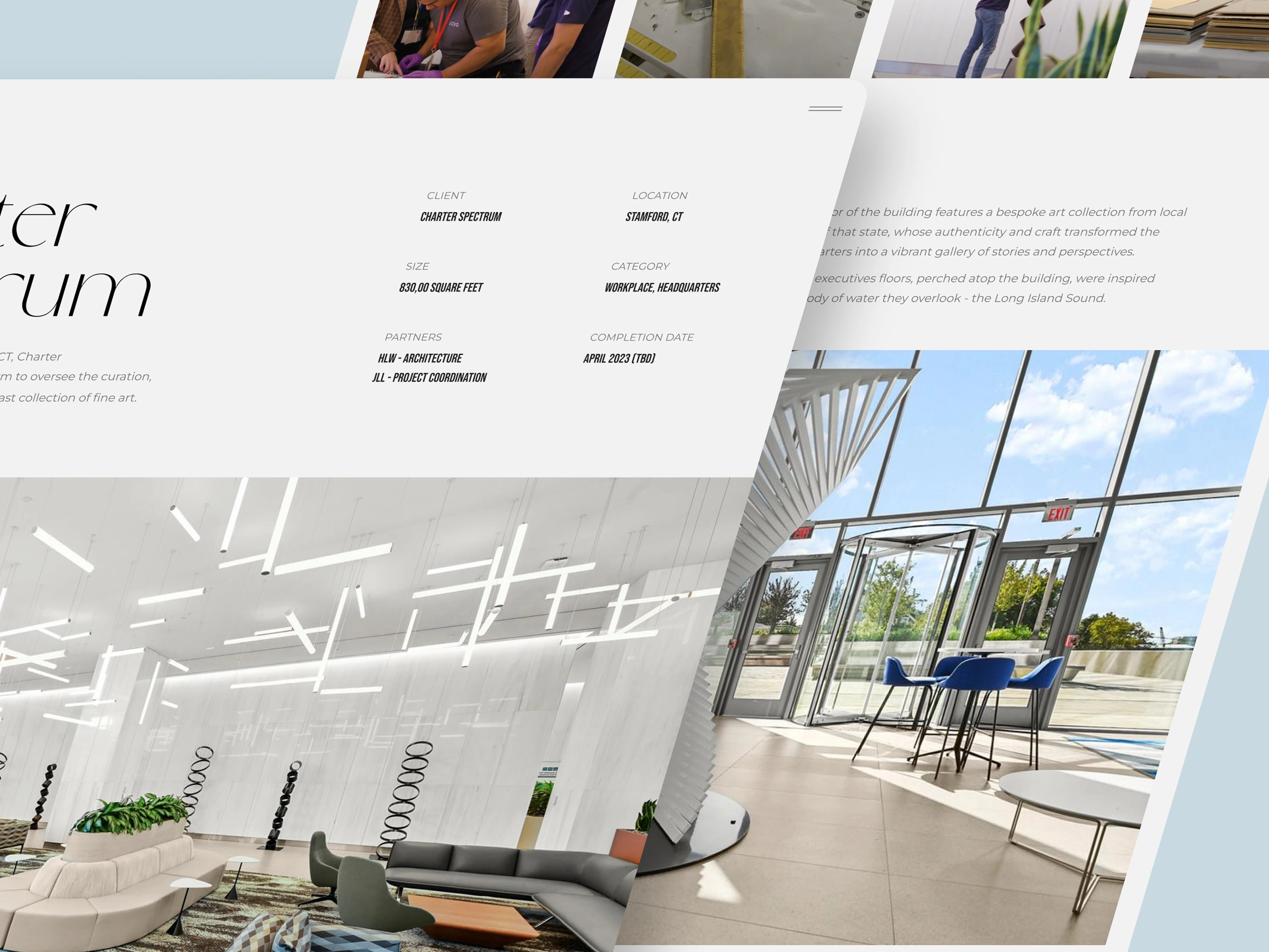 Project description: I designed and developed a website for Indiewalls' Charter Communications Headquarters project in Stamford, CT, highlighting the project's scope, art collections, and curated pieces.