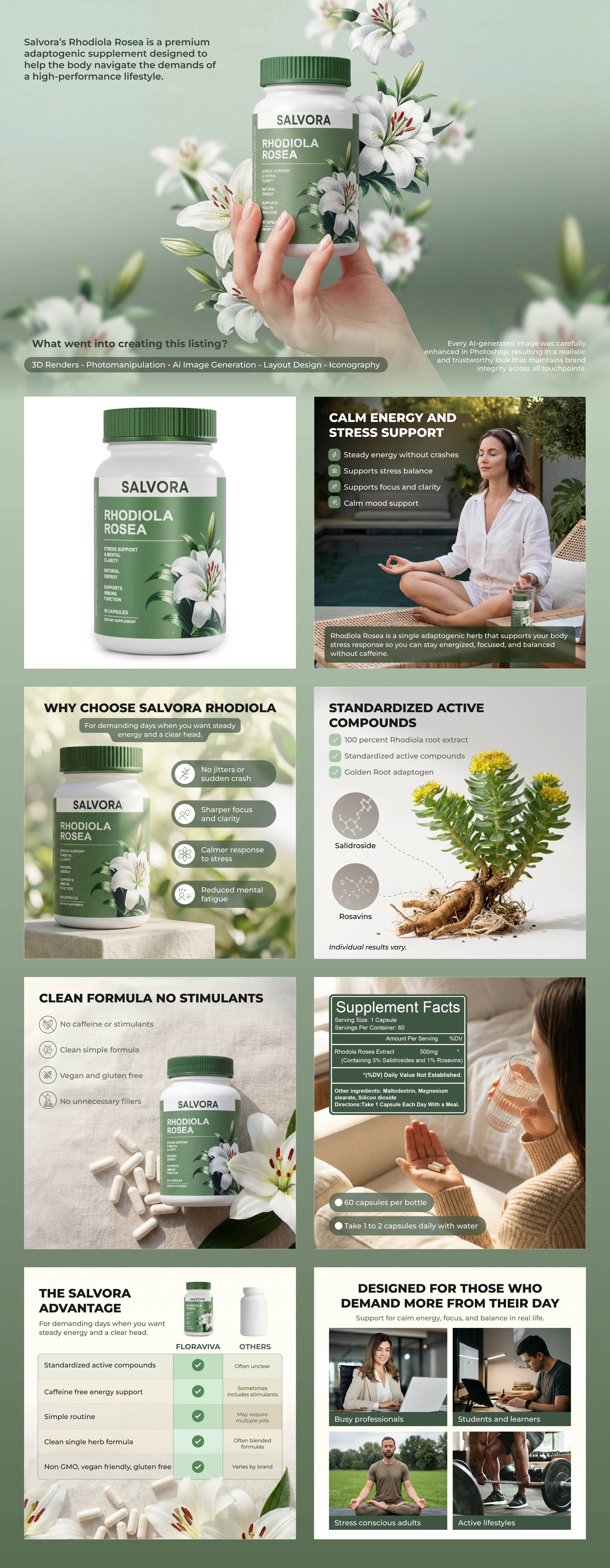 This project balances high-quality product mockups with lifestyle imagery and educational blocks to create a compelling Amazon presence.