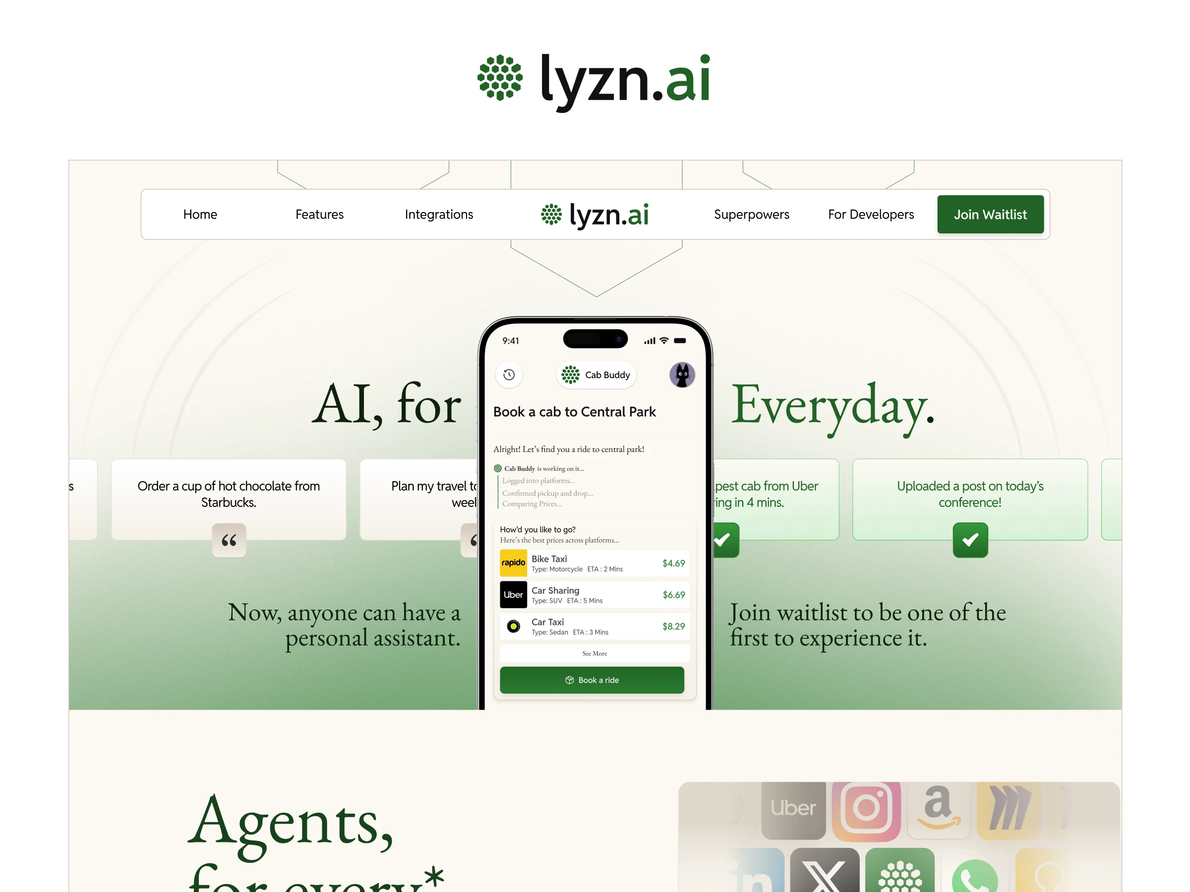 Led the entire design cycle of branding, product, landing page, to marketing materials for Lyzn, an AI marketplace of agents allowing users to automate tasks.