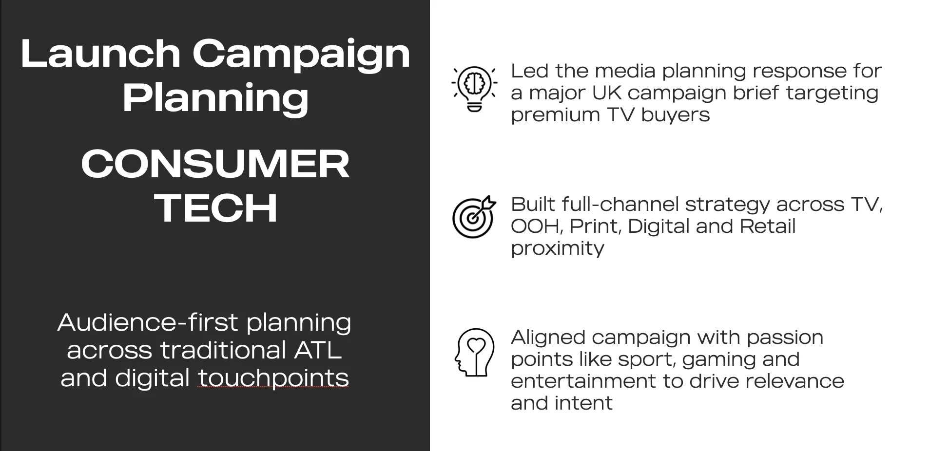 Developed audience-led media plan for a Global premium tech brand in the UK. While performance is confidential, the strategy shaped the full campaign approach.