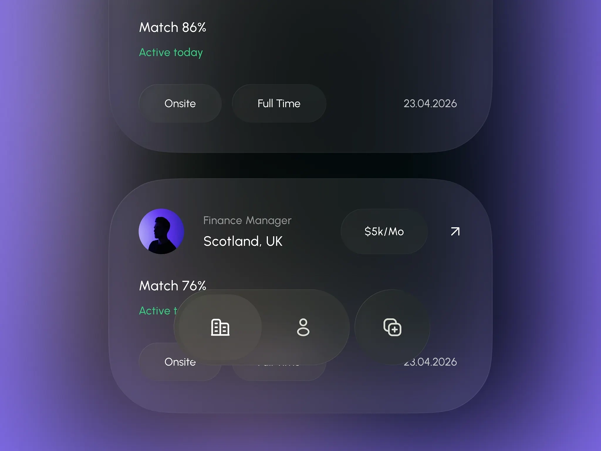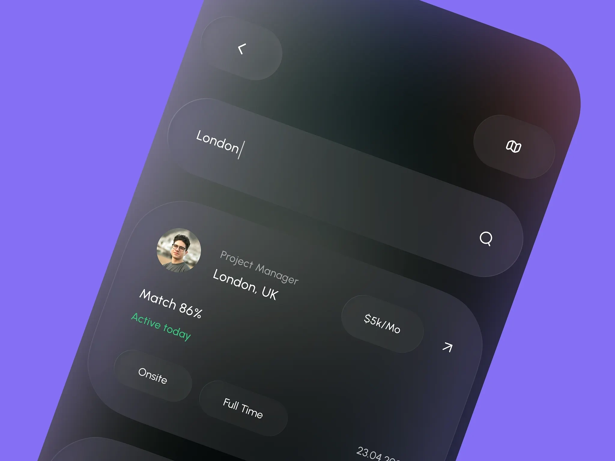 A sleek HR tech app that visualizes people on a map, helping teams quickly see and explore talent distribution across regions with a clean, dark UI and subtle purple accents.
