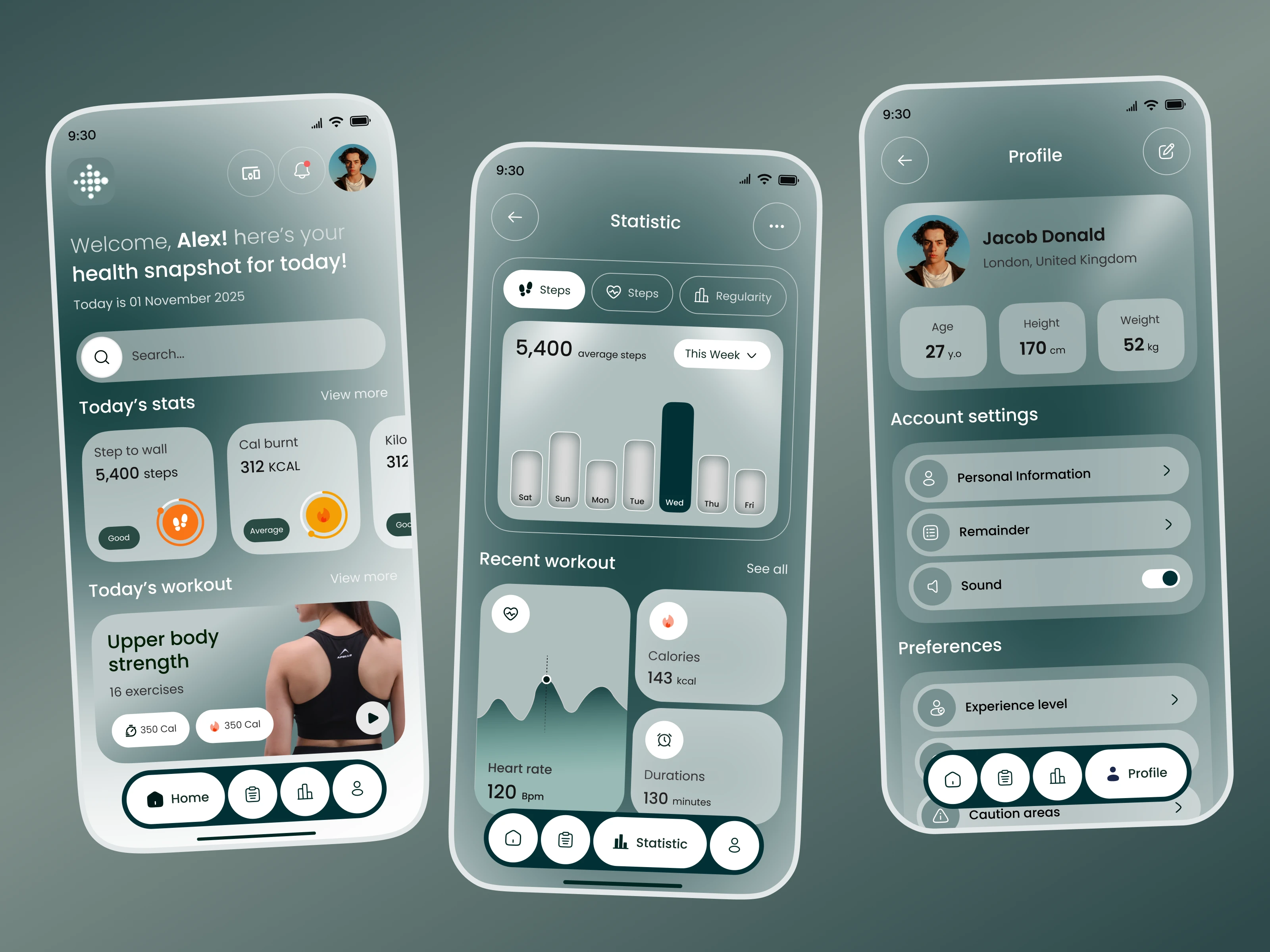 This concept showcases a modern fitness and health tracking mobile app designed to help users monitor daily activity, workouts, and wellness data with clarity and ease. The interface focuses on a clean dashboard experience, presenting key metrics like steps, calories burned, heart rate, and workout statistics in a simple, visual-first layout.
