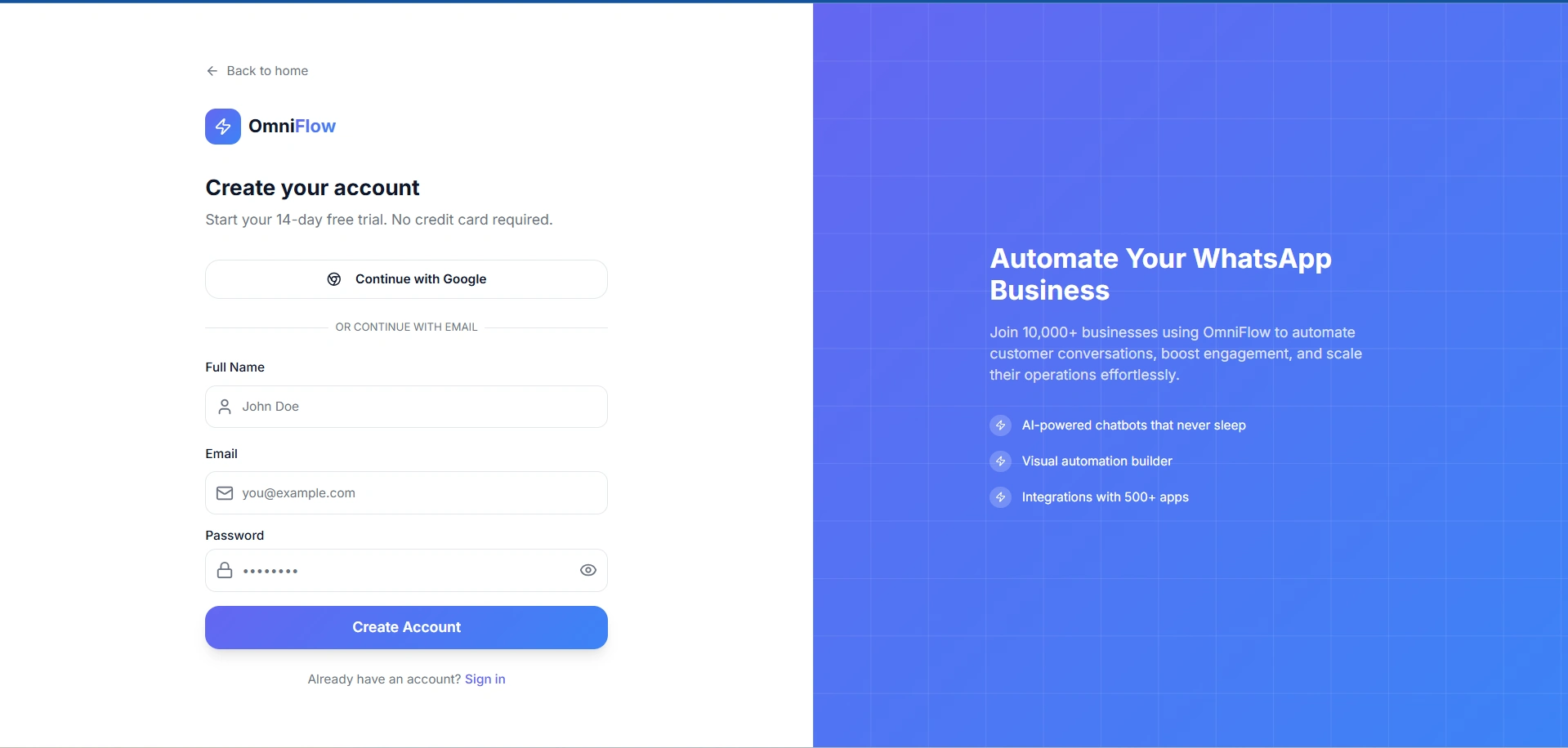 Optimized SaaS sign-up screen for conversion and speed.