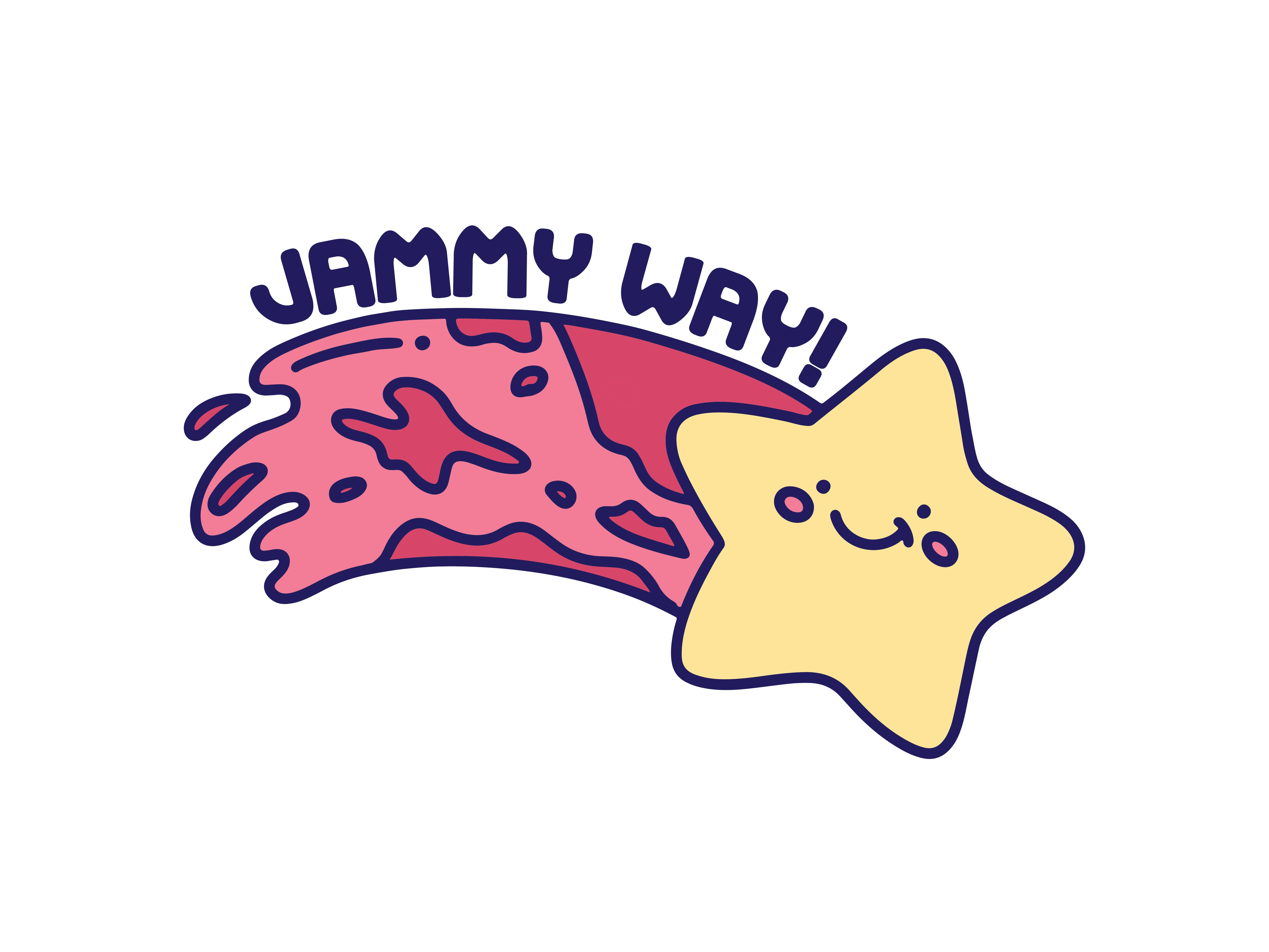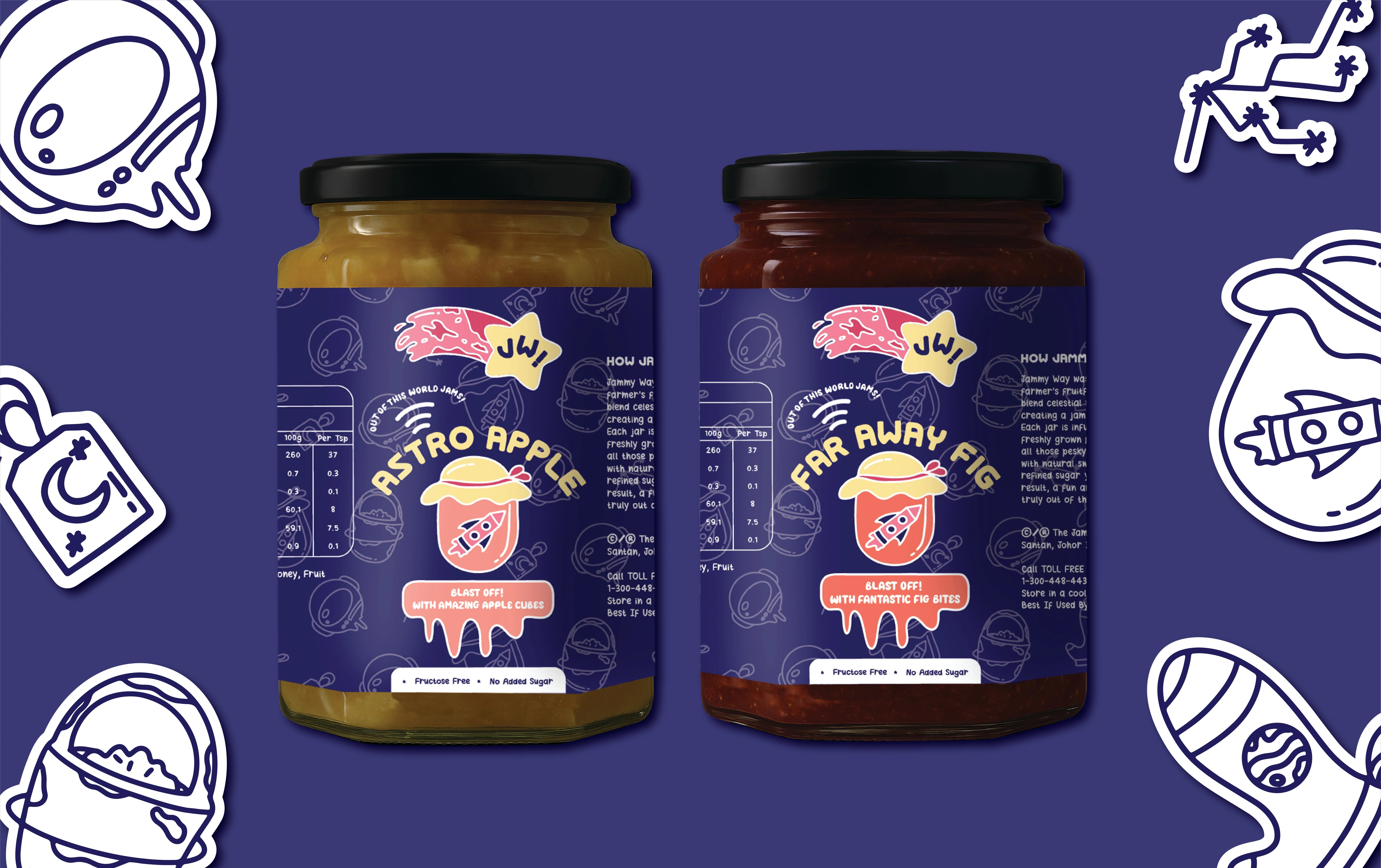 A complete brand identity design concept for a space themed jam business. The approach is playful and bright with cosmic elements and a font kit that matches the theme.