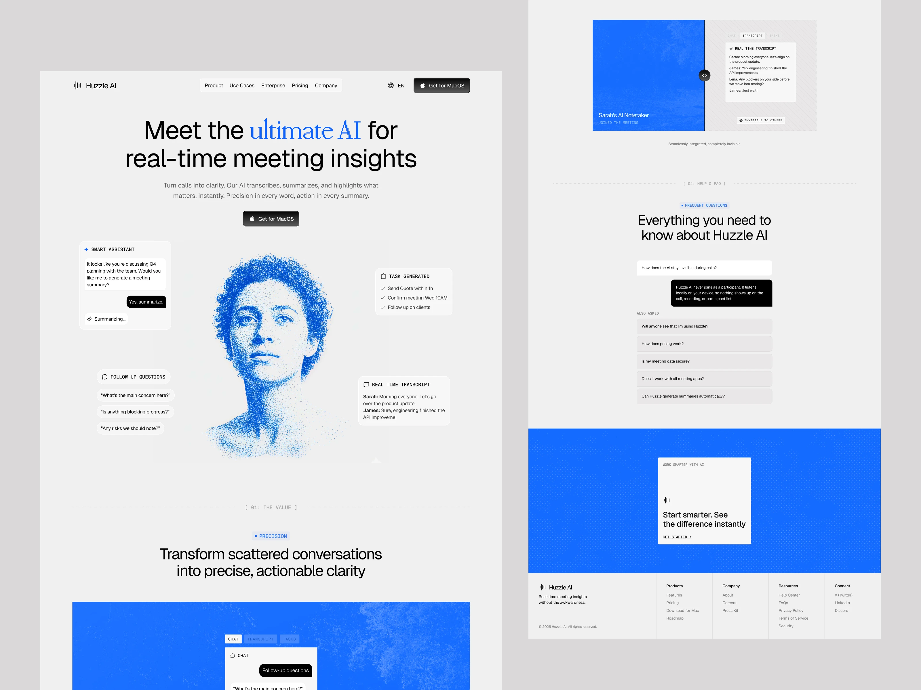 Hazzle AI is a modern meeting assistant designed to bring speed, clarity, and intelligence into every conversation. Built with a functional SaaS layout and a distinctive blue–halftone visual identity, the landing page communicates precision through a clean interface, modular components, and real-time UI moments.
