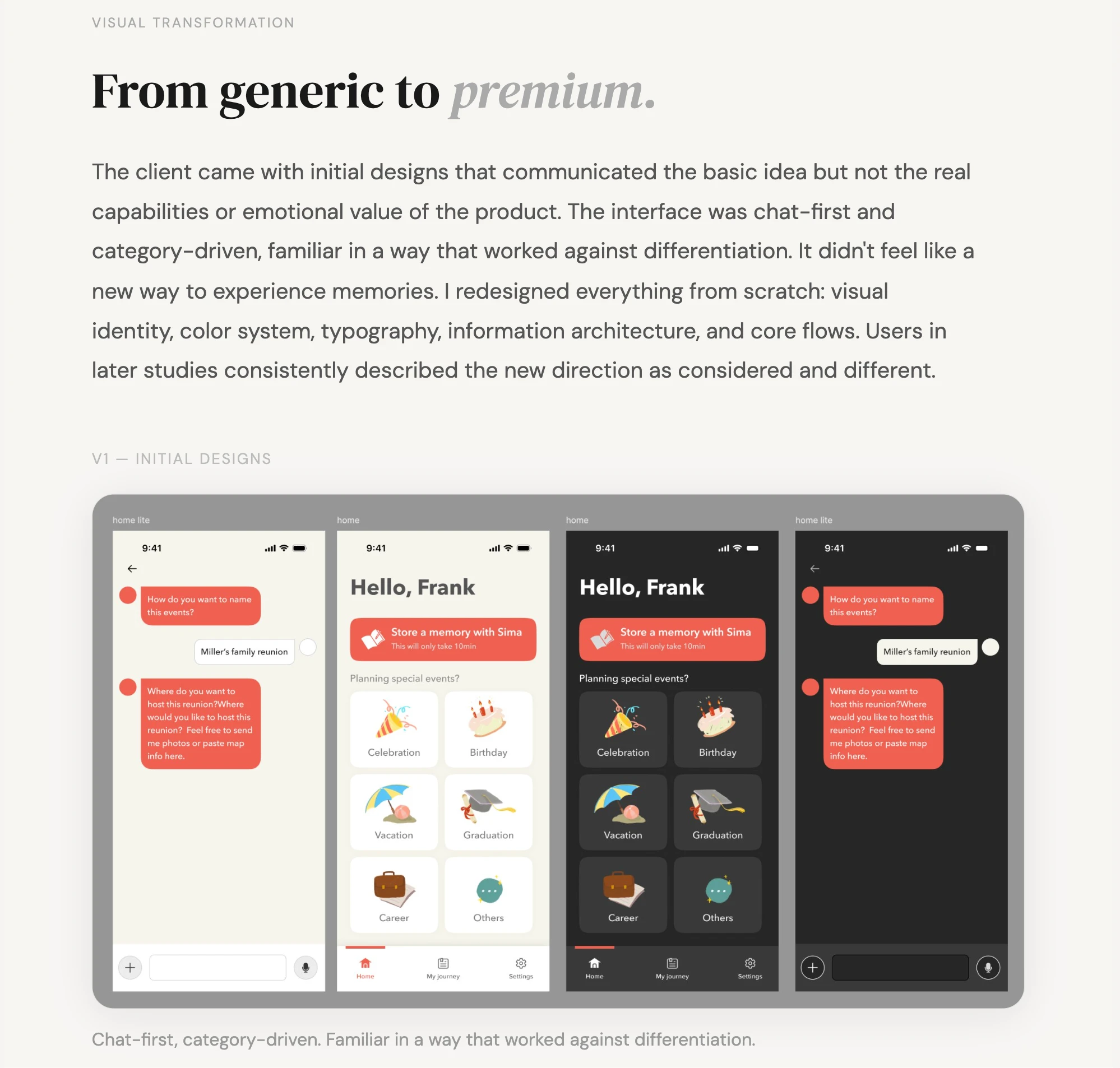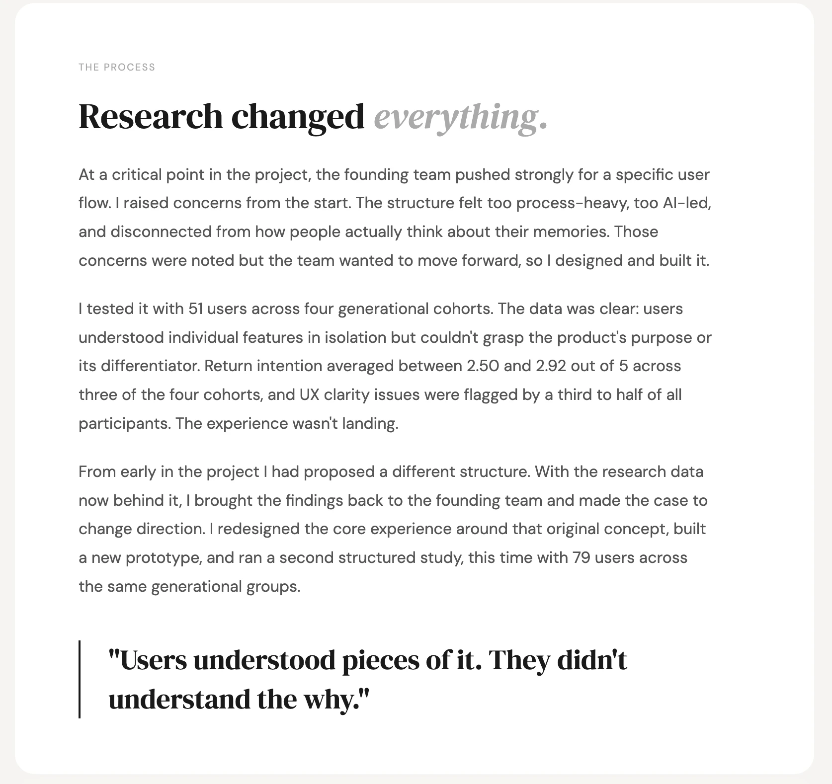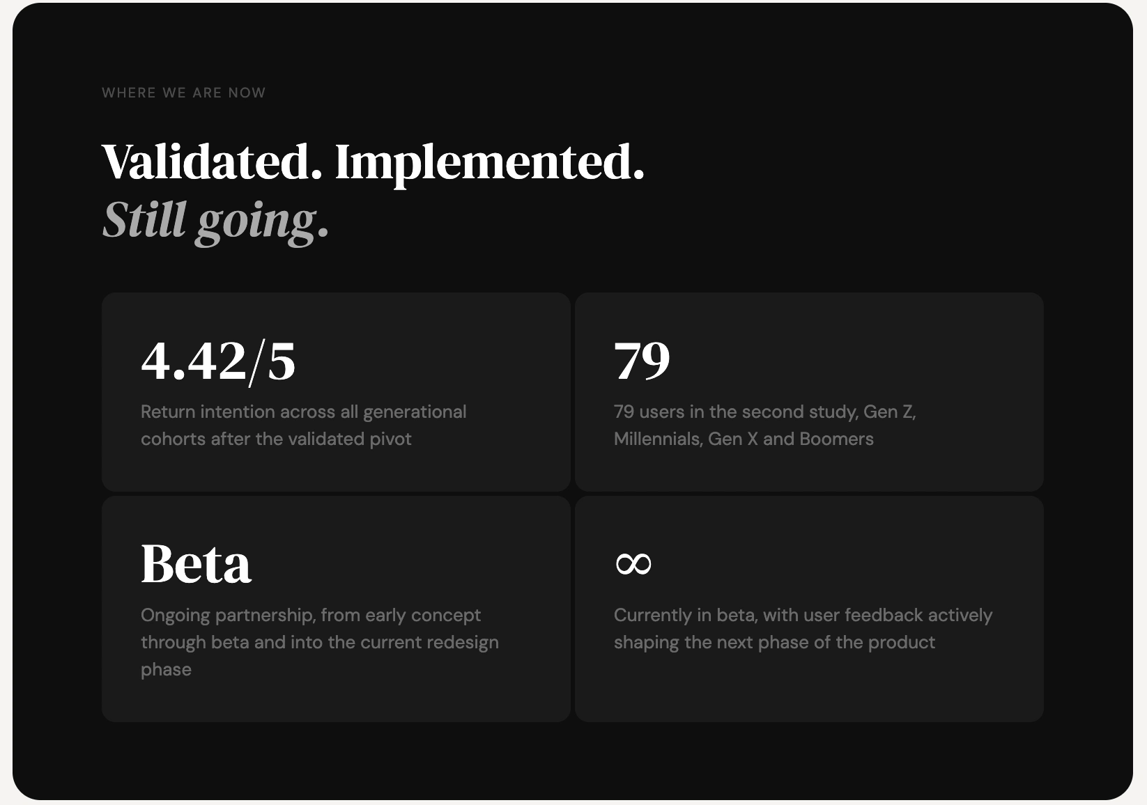 2-year design partnership on a consumer mobile app in beta. Led UX strategy, research, prototype validation and UI design. Worked embedded with founders, PM and engineering from early concept to launch.