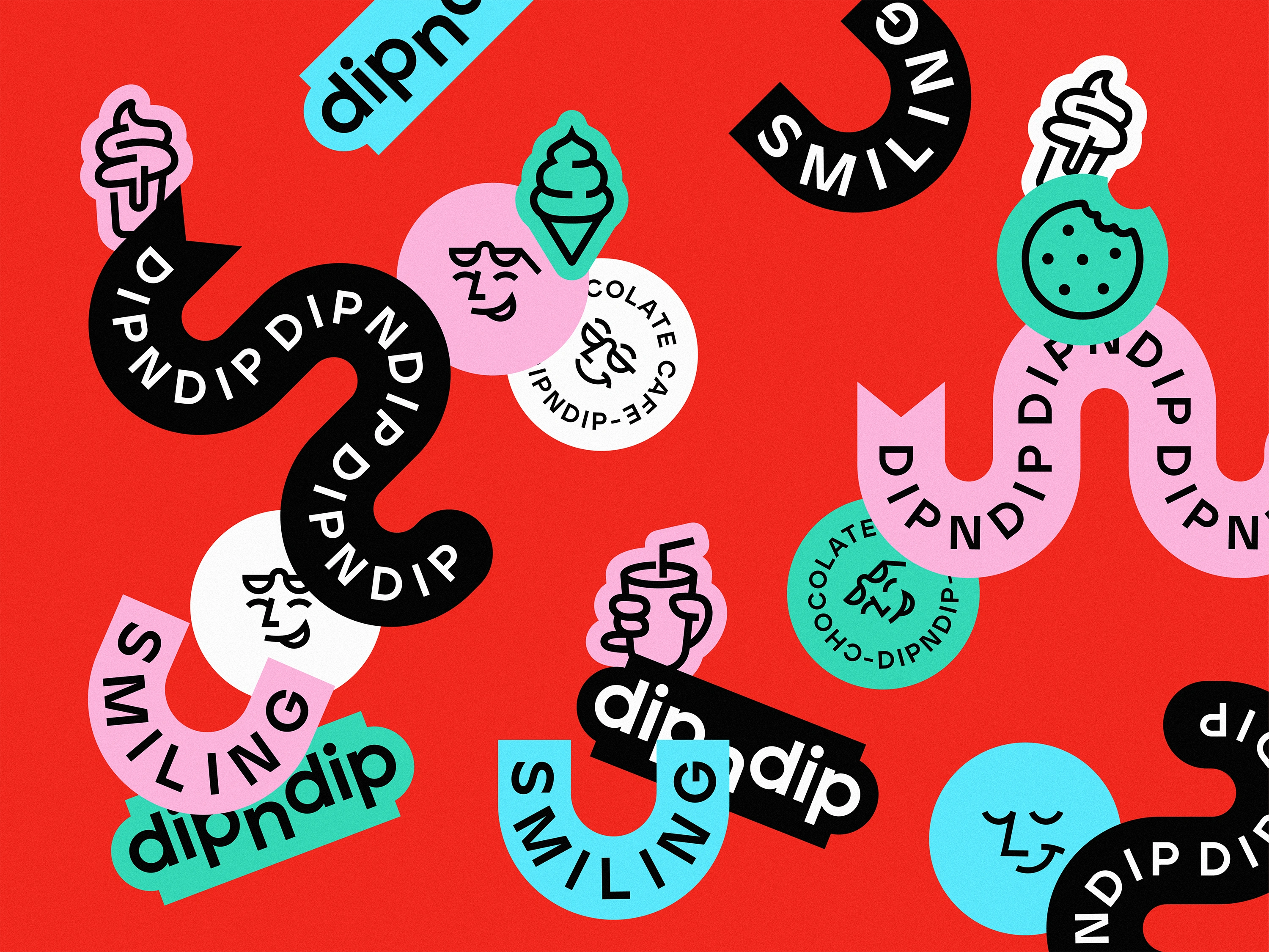 dipndip is a playful rebranding project for a chocolate café concept, combining a minimalistic design approach with bold, expressive energy. I reimagined the logo and introduced a system of smiling face icons, vibrant sticker-like graphics, and slogan-driven elements to create a more engaging and upbeat brand presence. While the design remains clean and minimal, the use of bright red as the core color, paired with high-energy accent tones, adds warmth, personality, and a distinct visual punch.