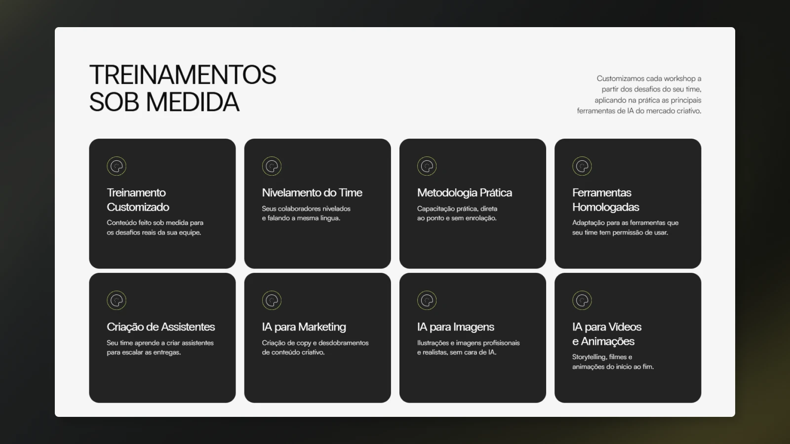 Clear articulation of what Human delivers for companies: upskilling teams, leadership training in AI, strategic initiatives, scalable formats.