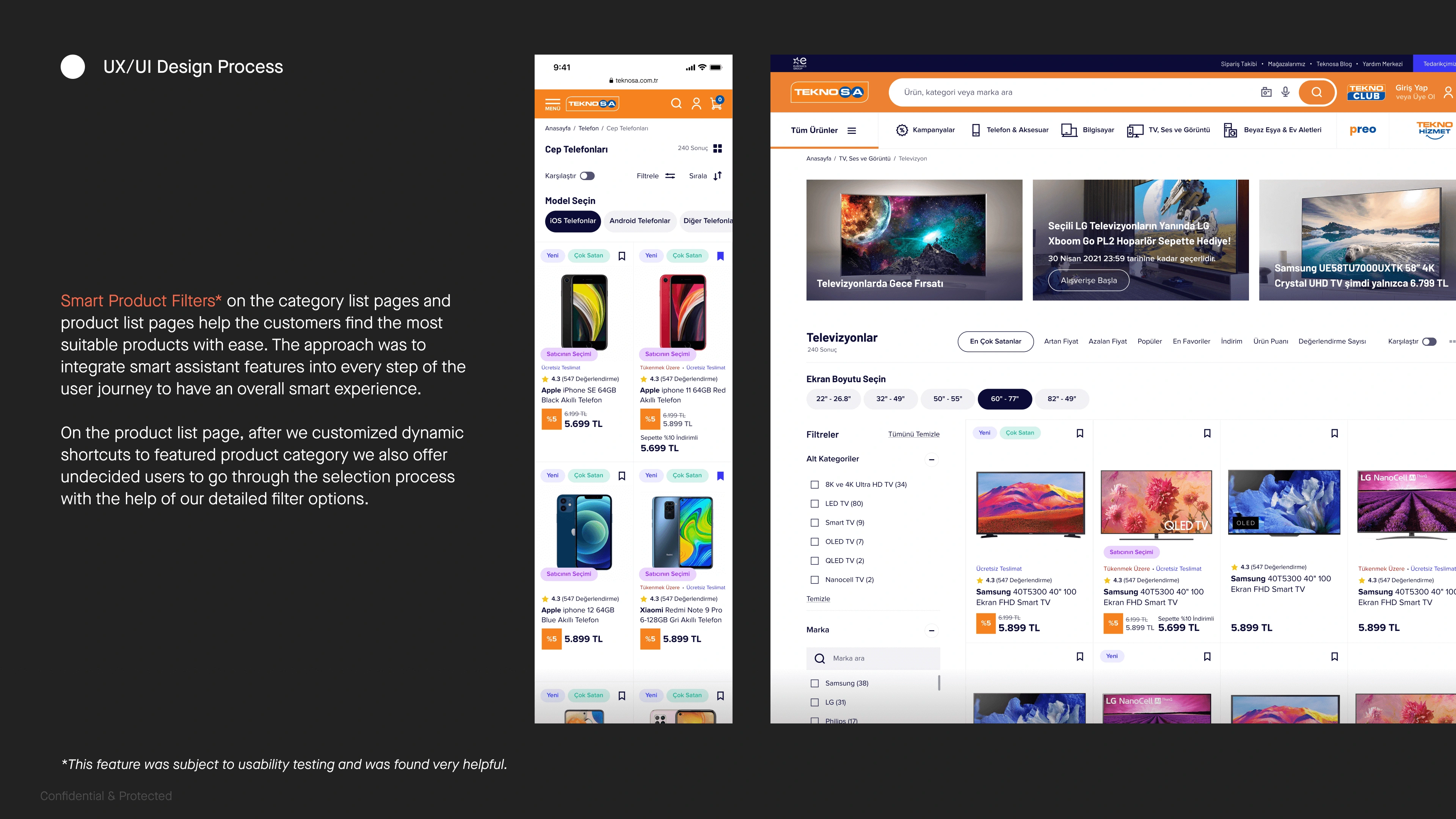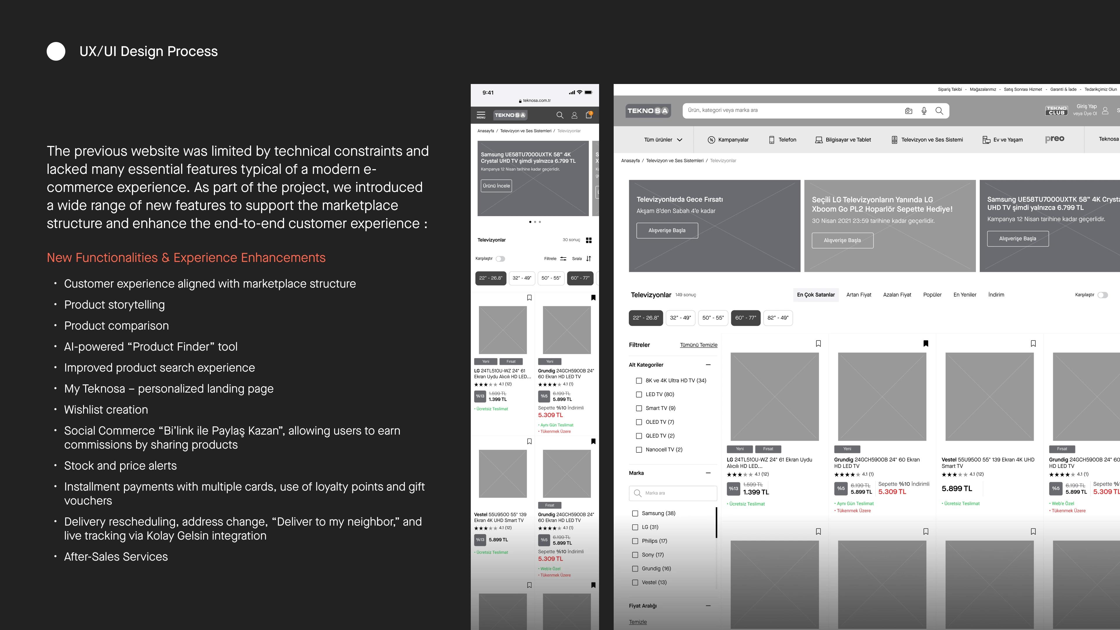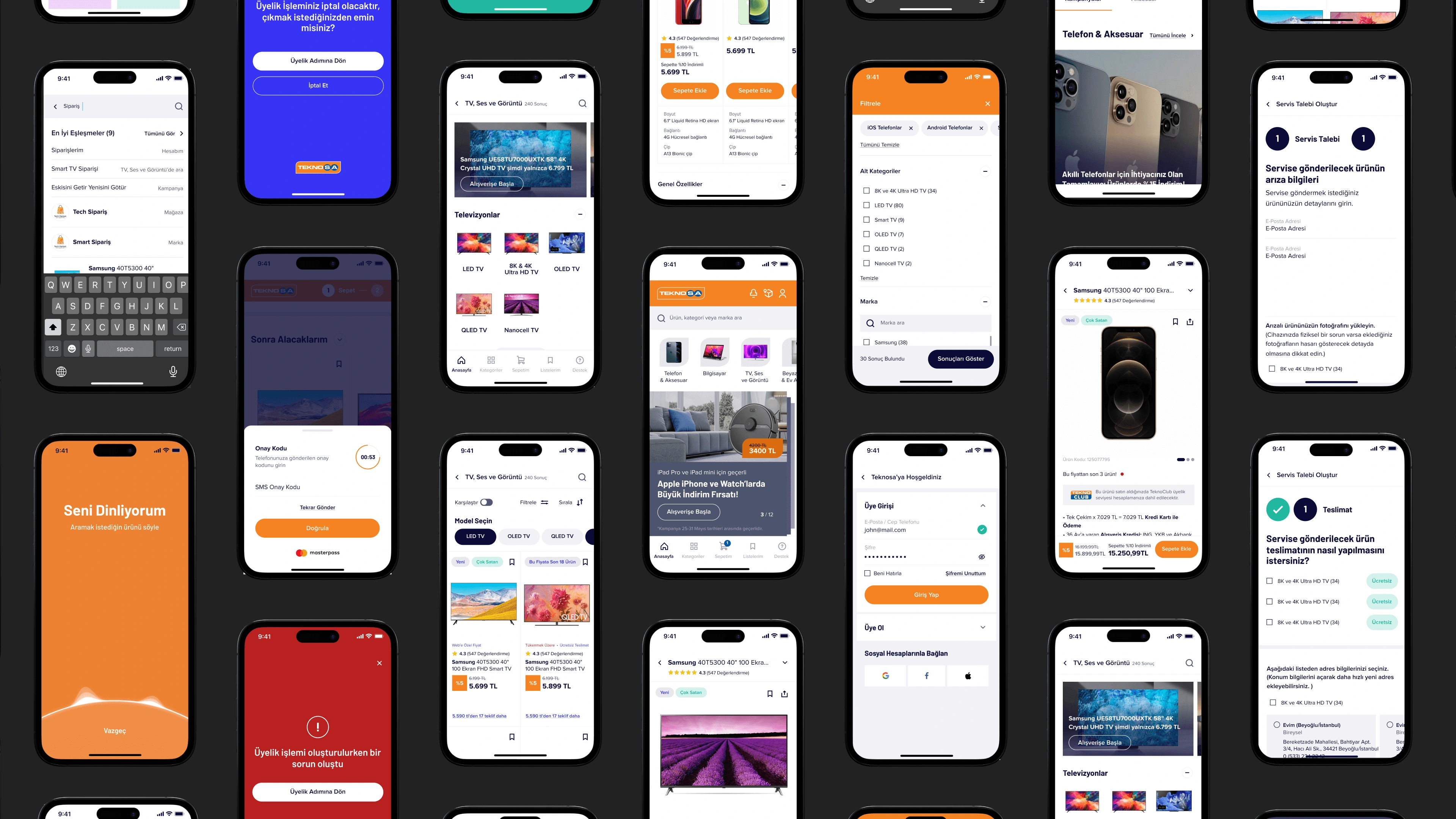 Based on their takeaways, the project began with a comprehensive UX/UI audit of the existing Teknosa website and mobile application. In addition to these, designing the in-store kiosk interfaces, cashier screens, and customer-facing displays from scratch was crucial to ensuring a seamless and consistent omnichannel experience. This project took place during a significant transformation period, where Teknosa evolved from a traditional retailer to a “Phygital” model, aiming to offer a unique customer experience both online and in-store.