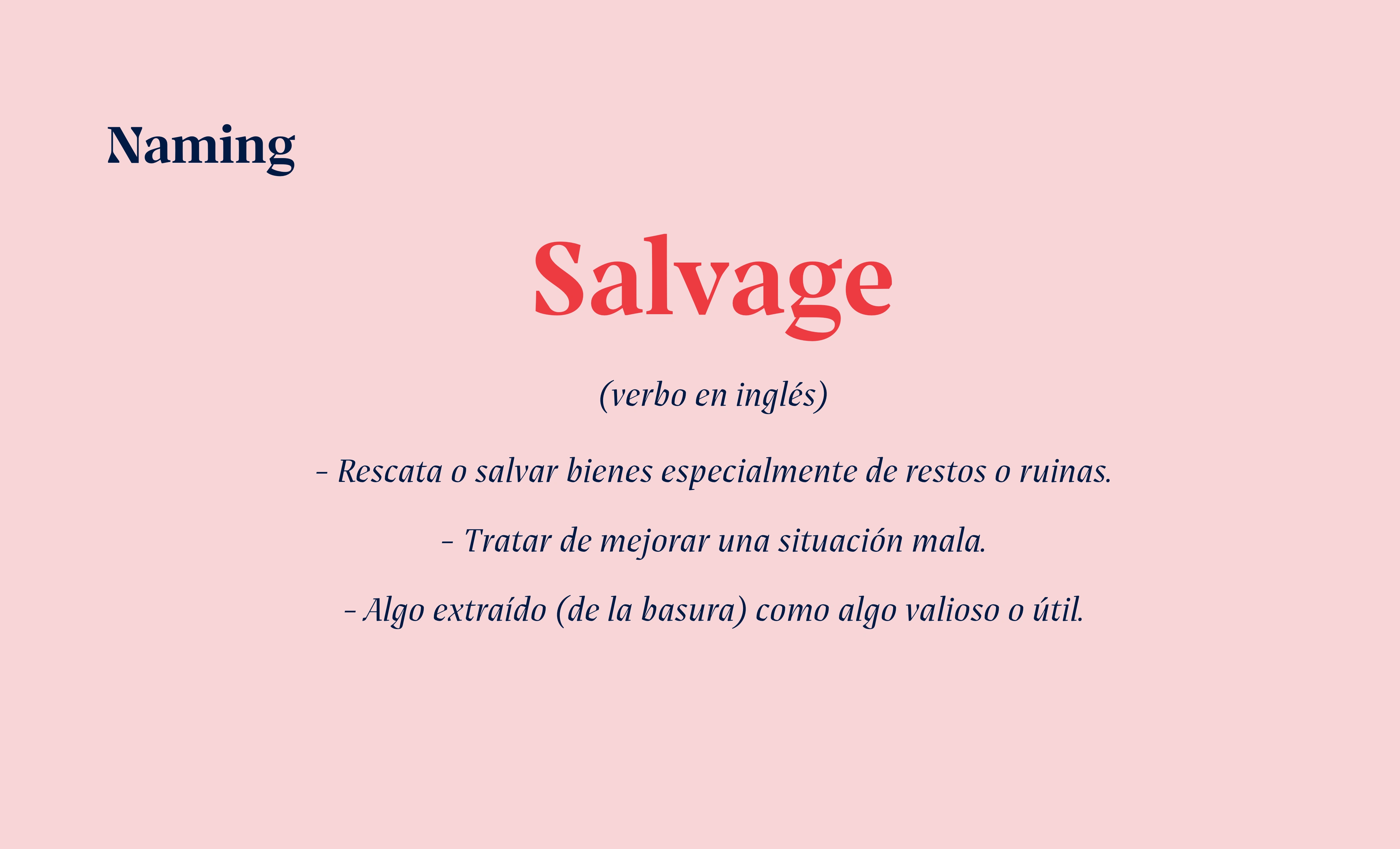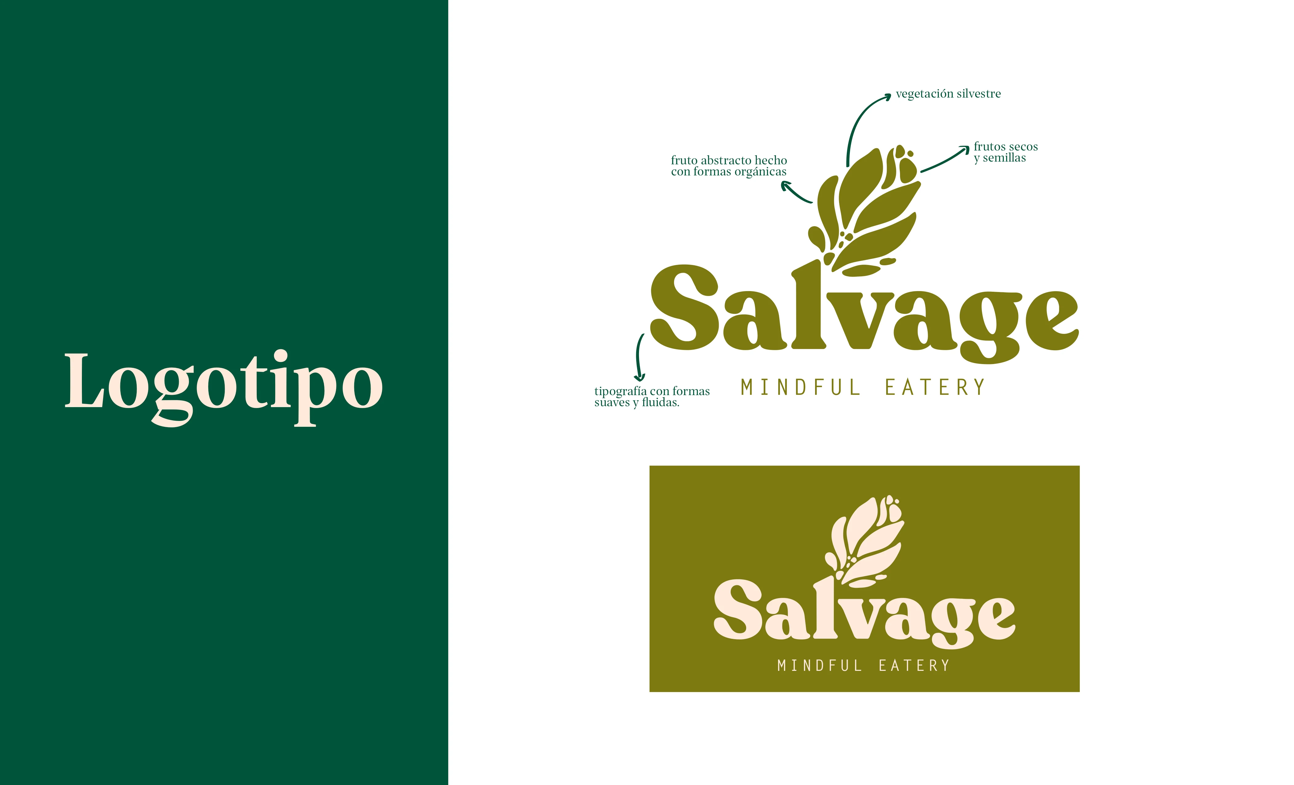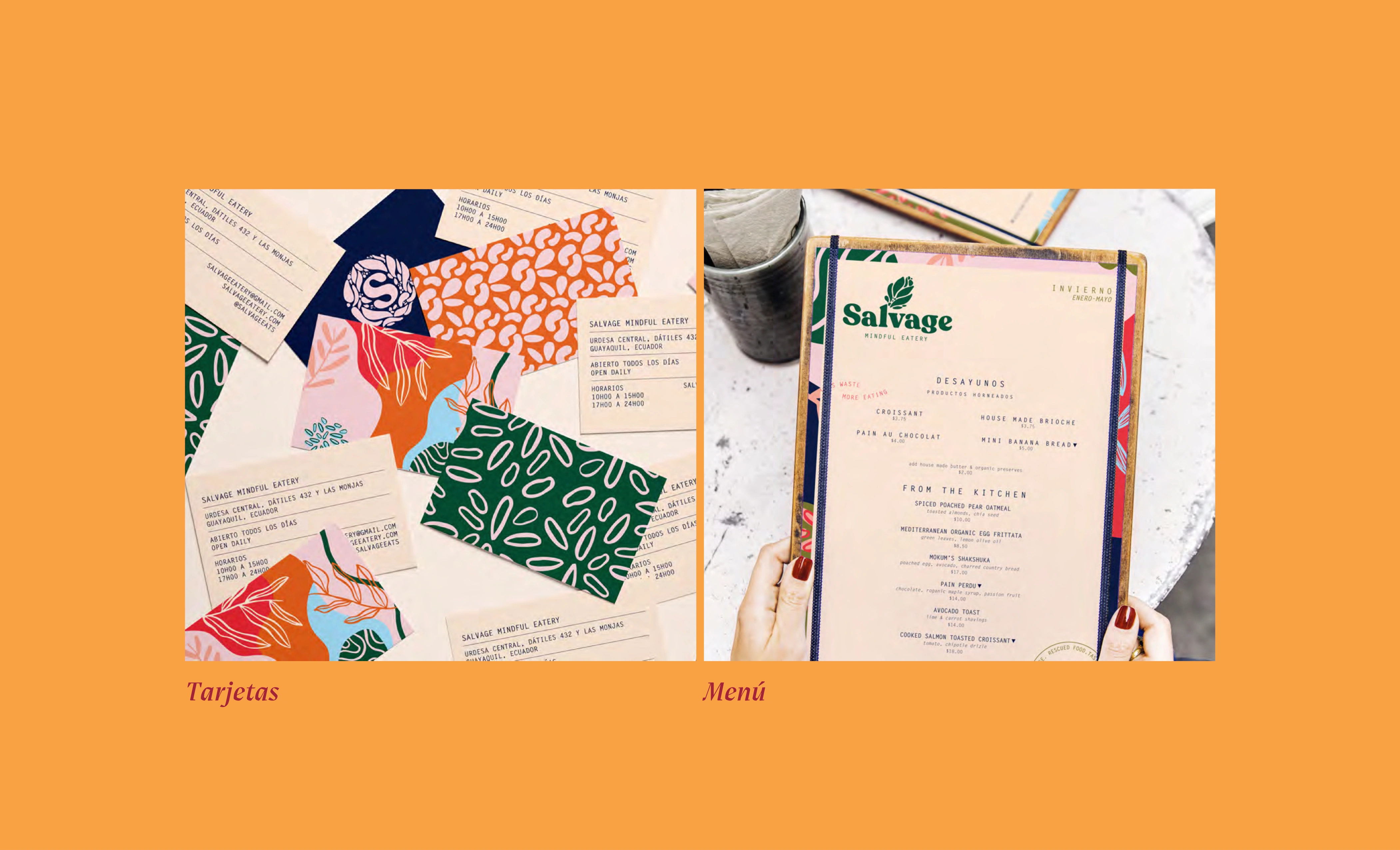 Salvage es un restaurante consciente que busca reducir el desperdicio innecesario de comida en la ciudad de Guayaquil, Ecuador. Se realizó una exploración de las formas que se encuentran en la naturaleza y los ingredientes que vienen de la tierra para crear una identidad colorida, fluida y orgánica que se ve plasmada en todas las áreas del restaurante, desde su logo hasta cada uno de sus platos.