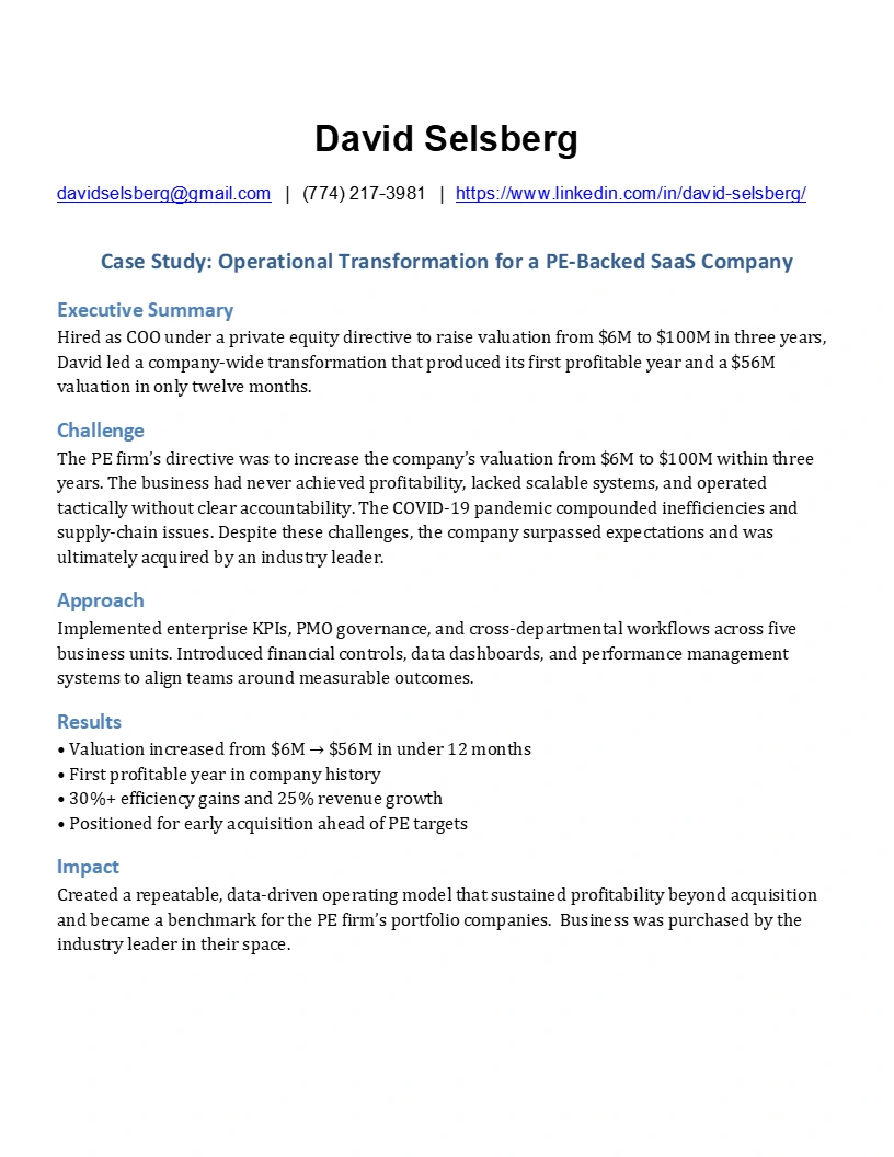 Increased valuation from $6M to $56M in one year, achieved first profitability, and led to early acquisition ahead of PE firm’s $100M target.