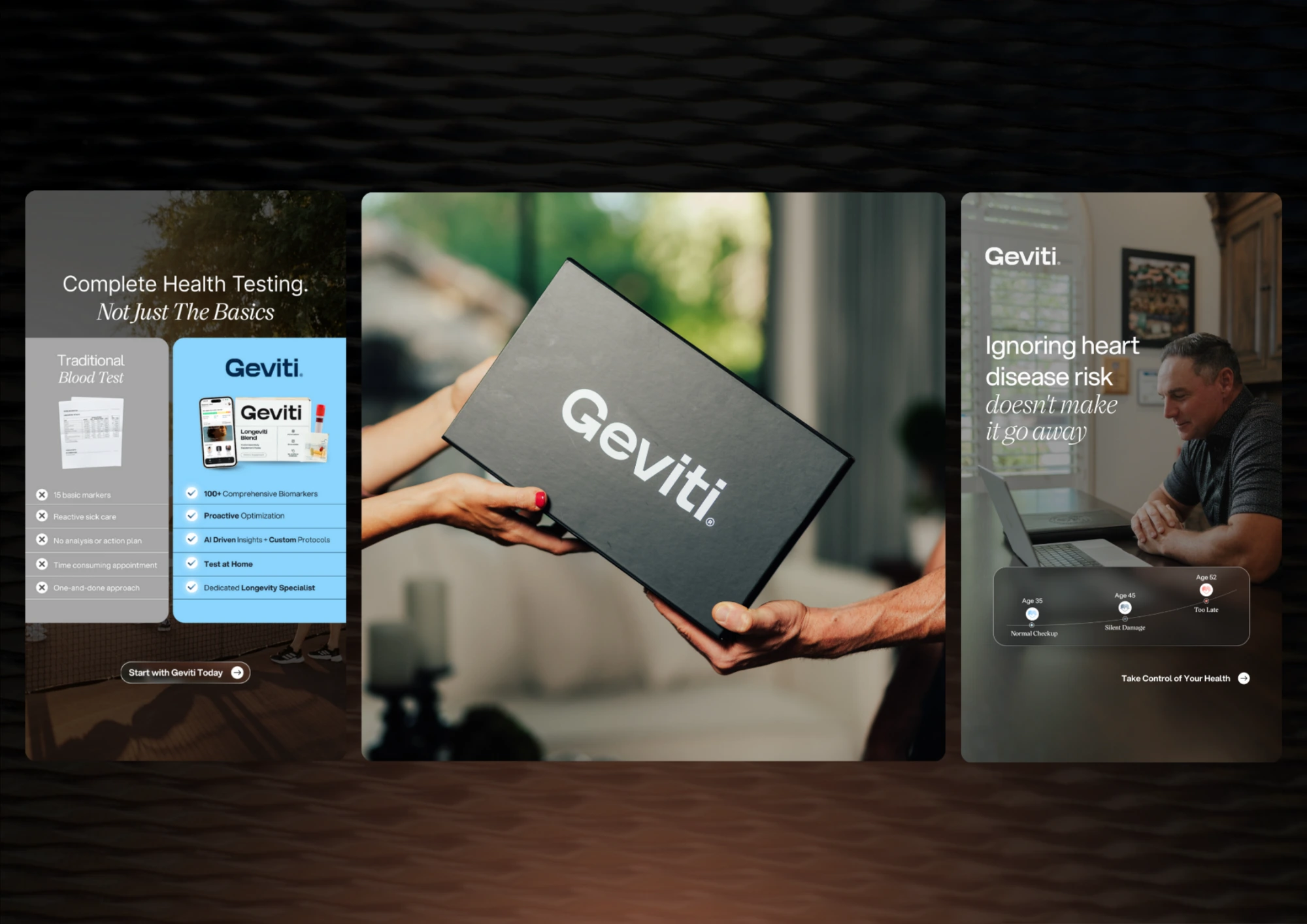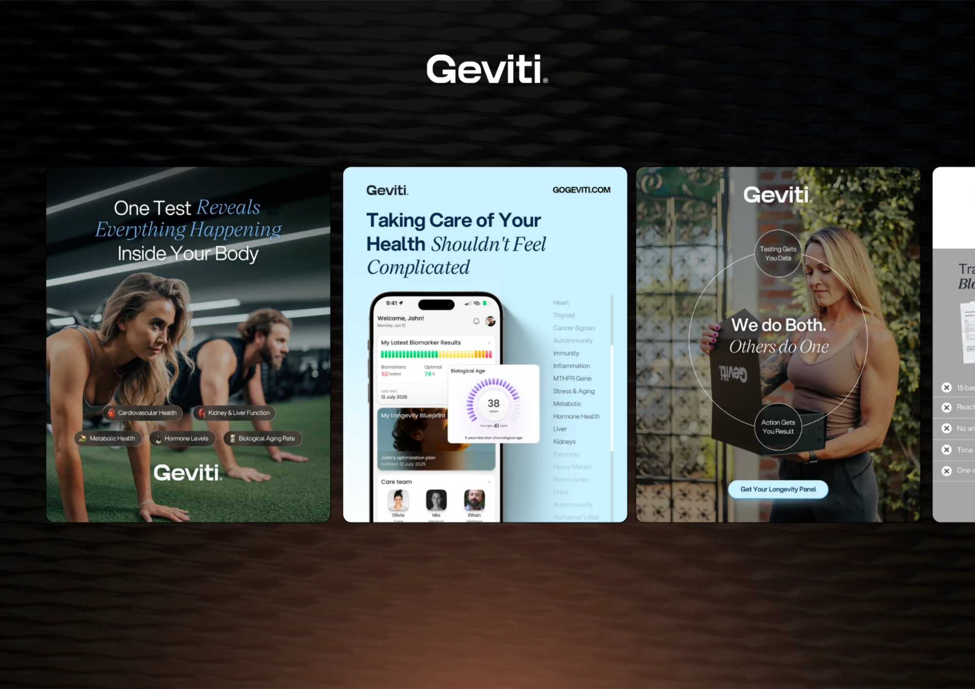 Throughout the campaign, I created a diverse range of visuals that combined lifestyle-driven, education-based, and conversion-focused elements. Each ad highlights a different angle of Geviti’s value: proactive health ownership, data-backed clarity, personalized supplements, and everyday moments improved by better well-being.