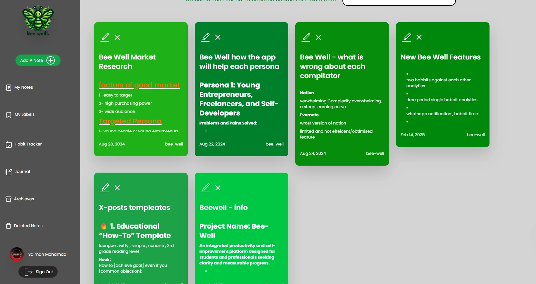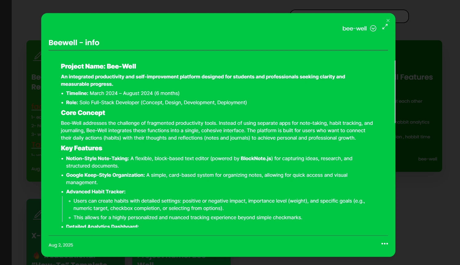 Conceived, designed, and built Bee-Well, a full-stack web application for integrated productivity and self-improvement, managing the entire project lifecycle from concept to deployment.