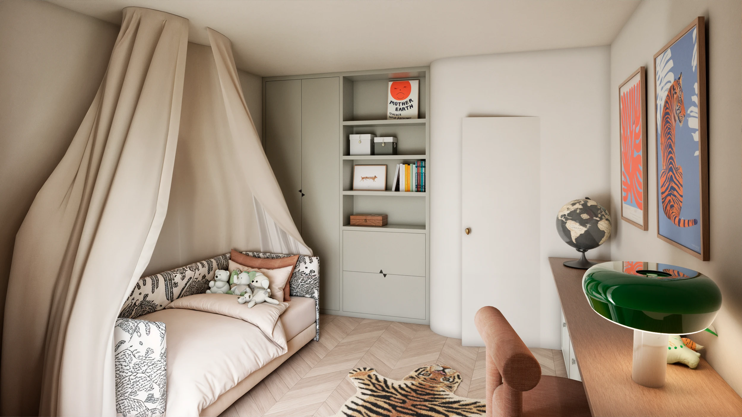 I developed a full interior concept covering the living area, dining space, kitchen, master bedroom with bathtub ensuite, and a child’s bedroom with its own bathroom. The design combined soft textures, neutral tones, and smart furniture choices to create a serene, livable atmosphere.