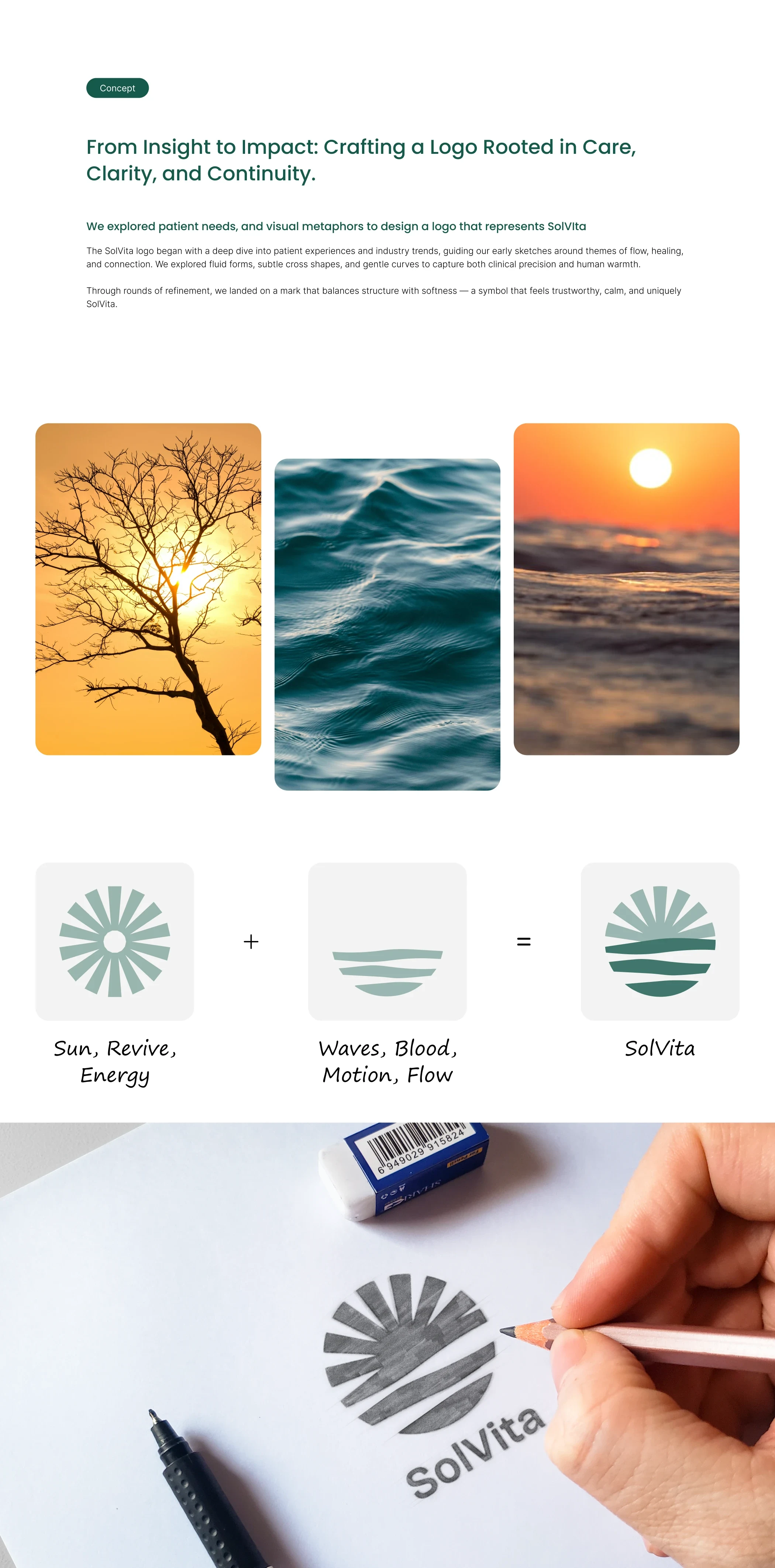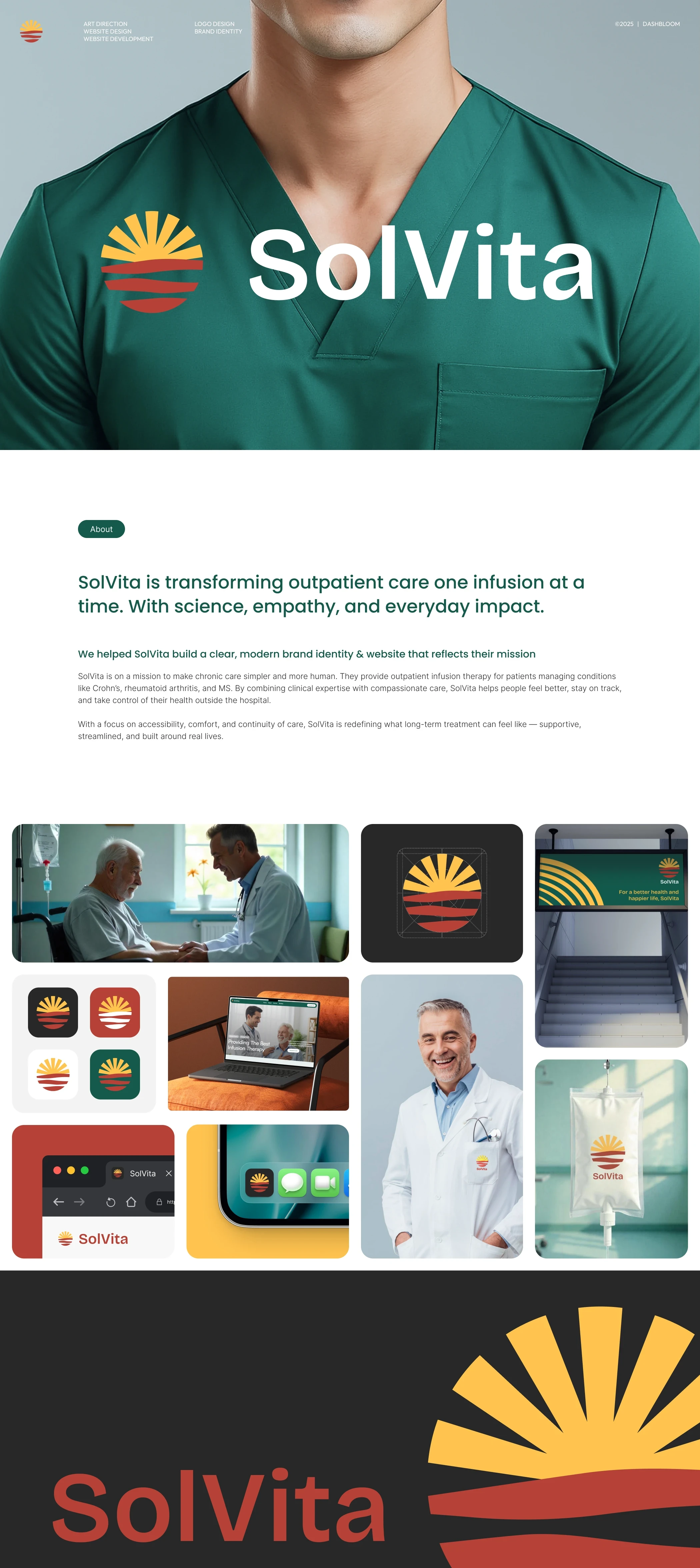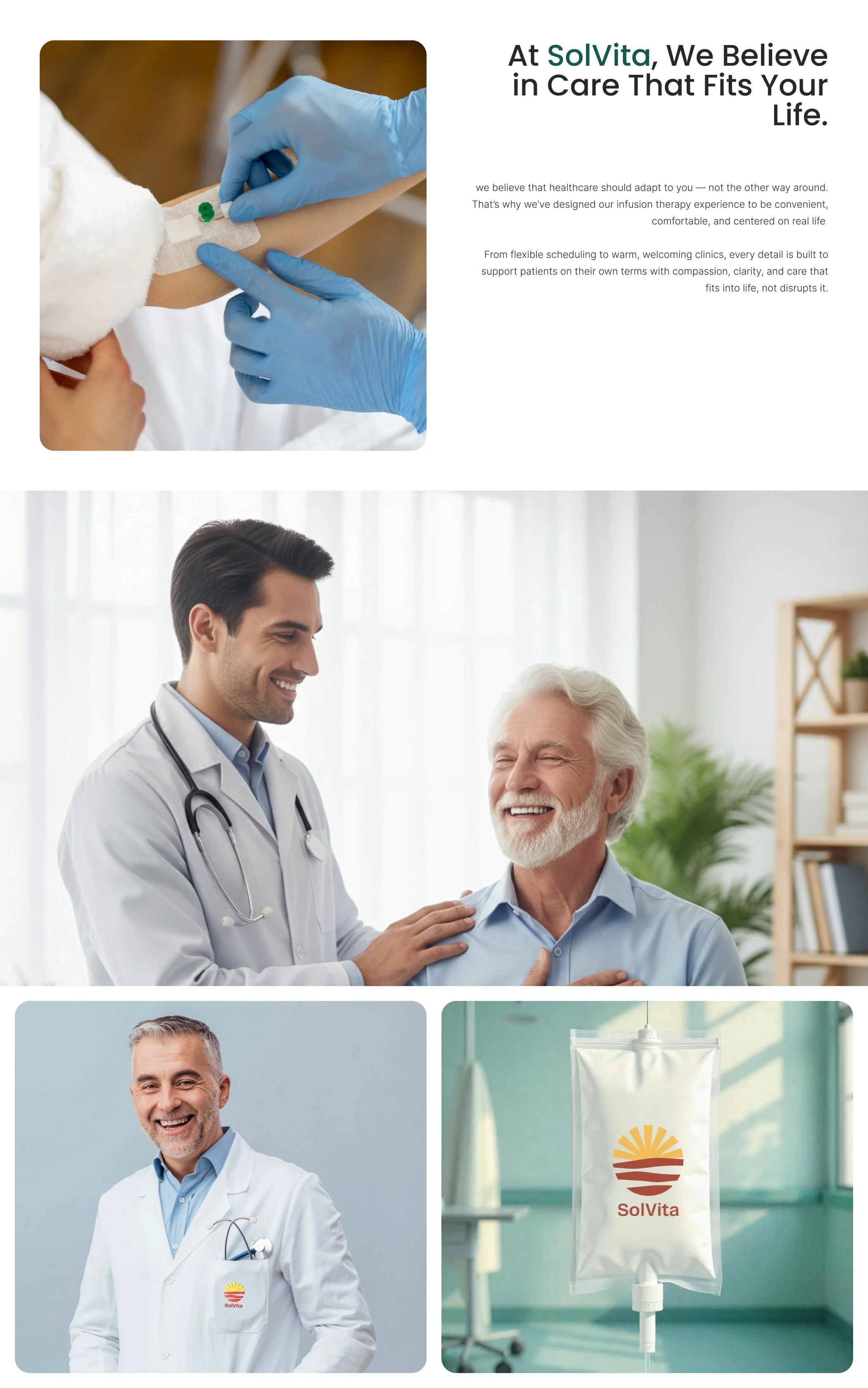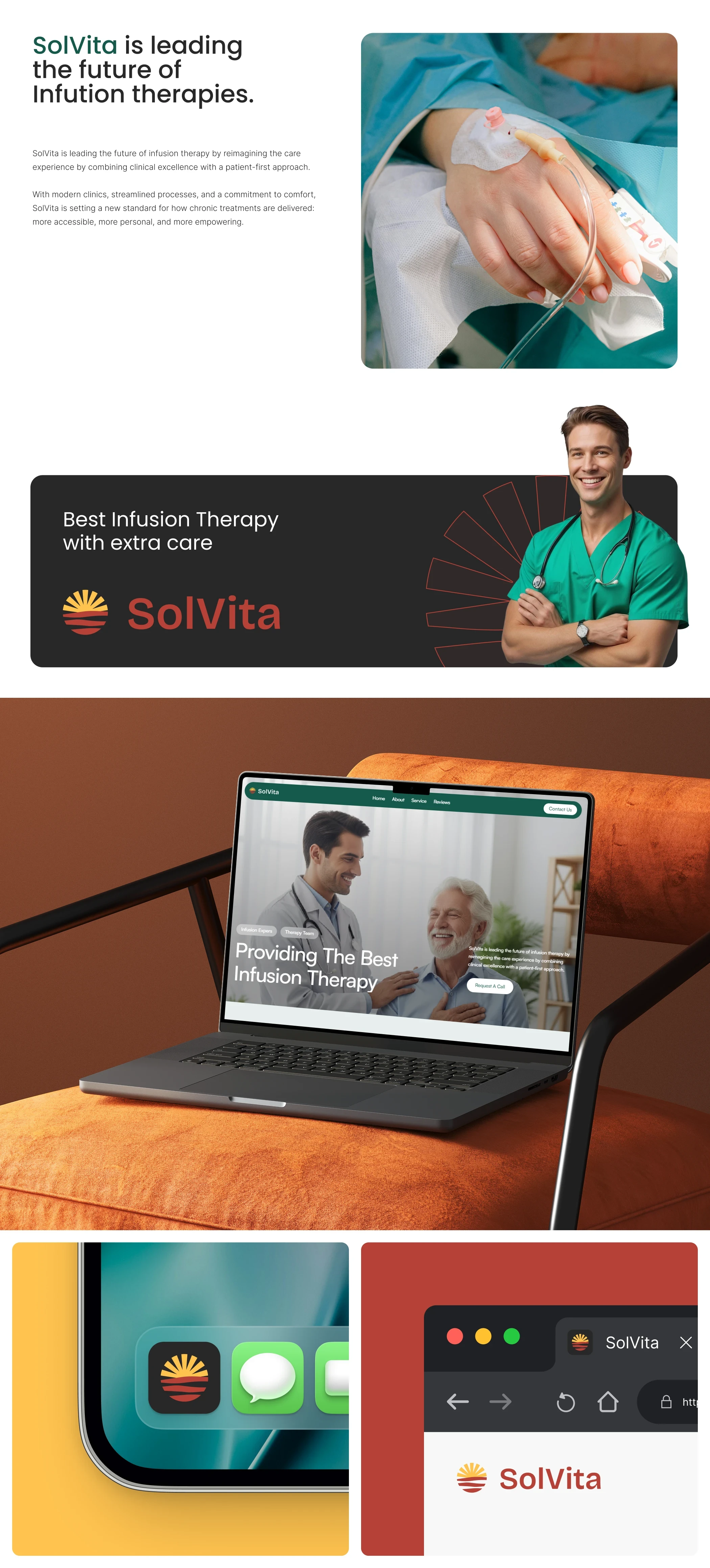 Modern Healthcare branding and Framer website for SolVita, compassionate outpatient infusion care, accessible UI/UX, and fast, manageable web experience.