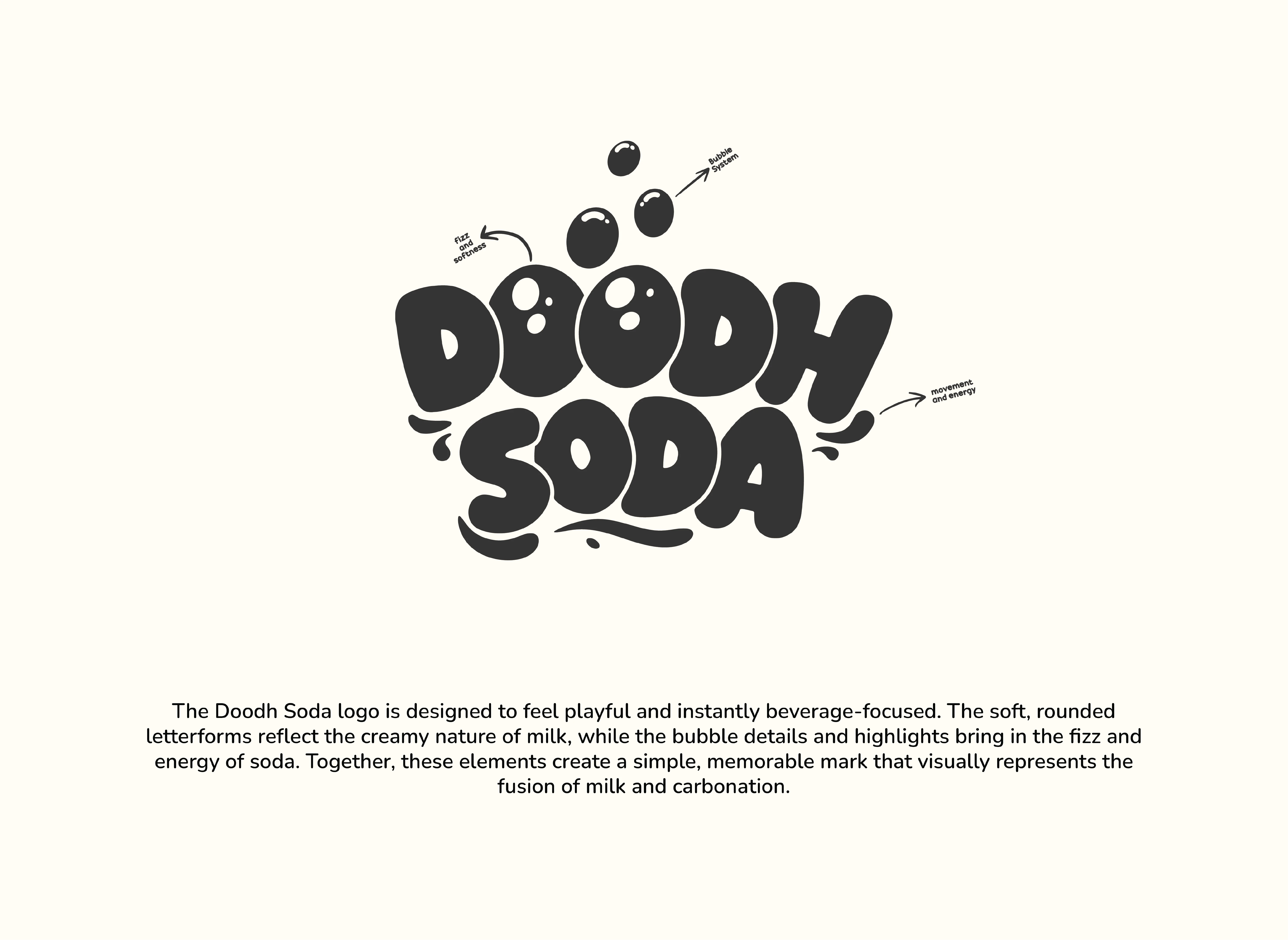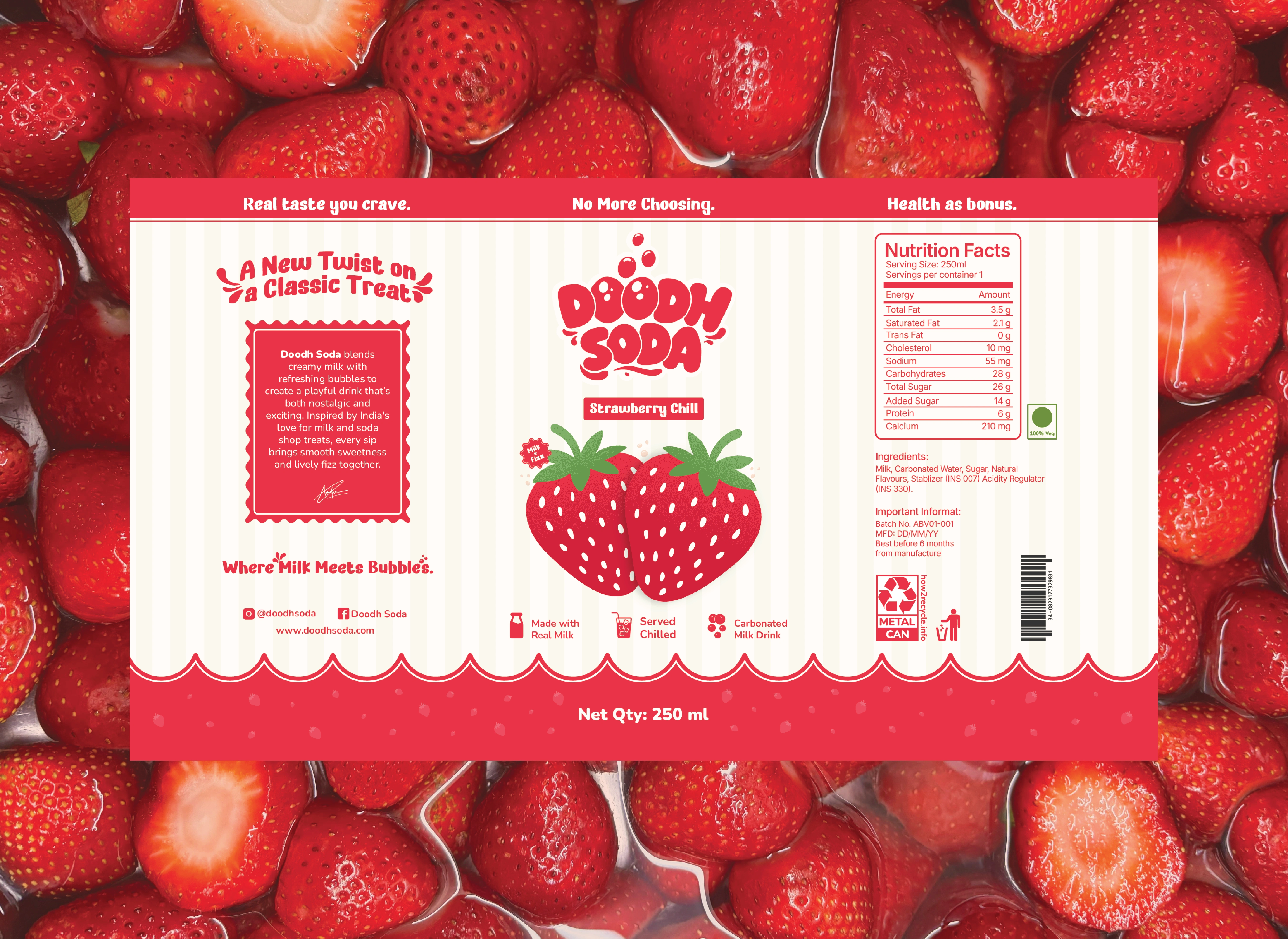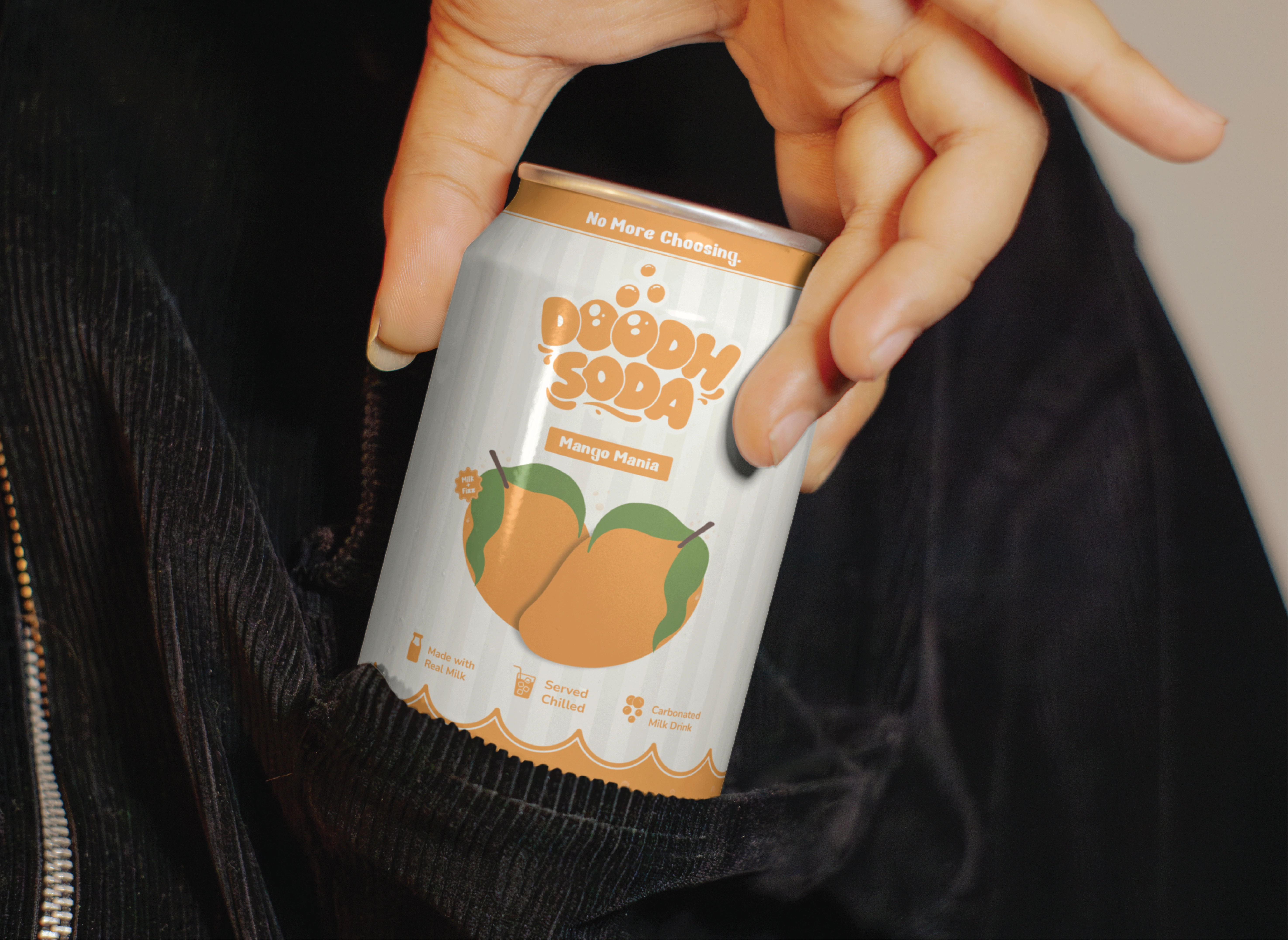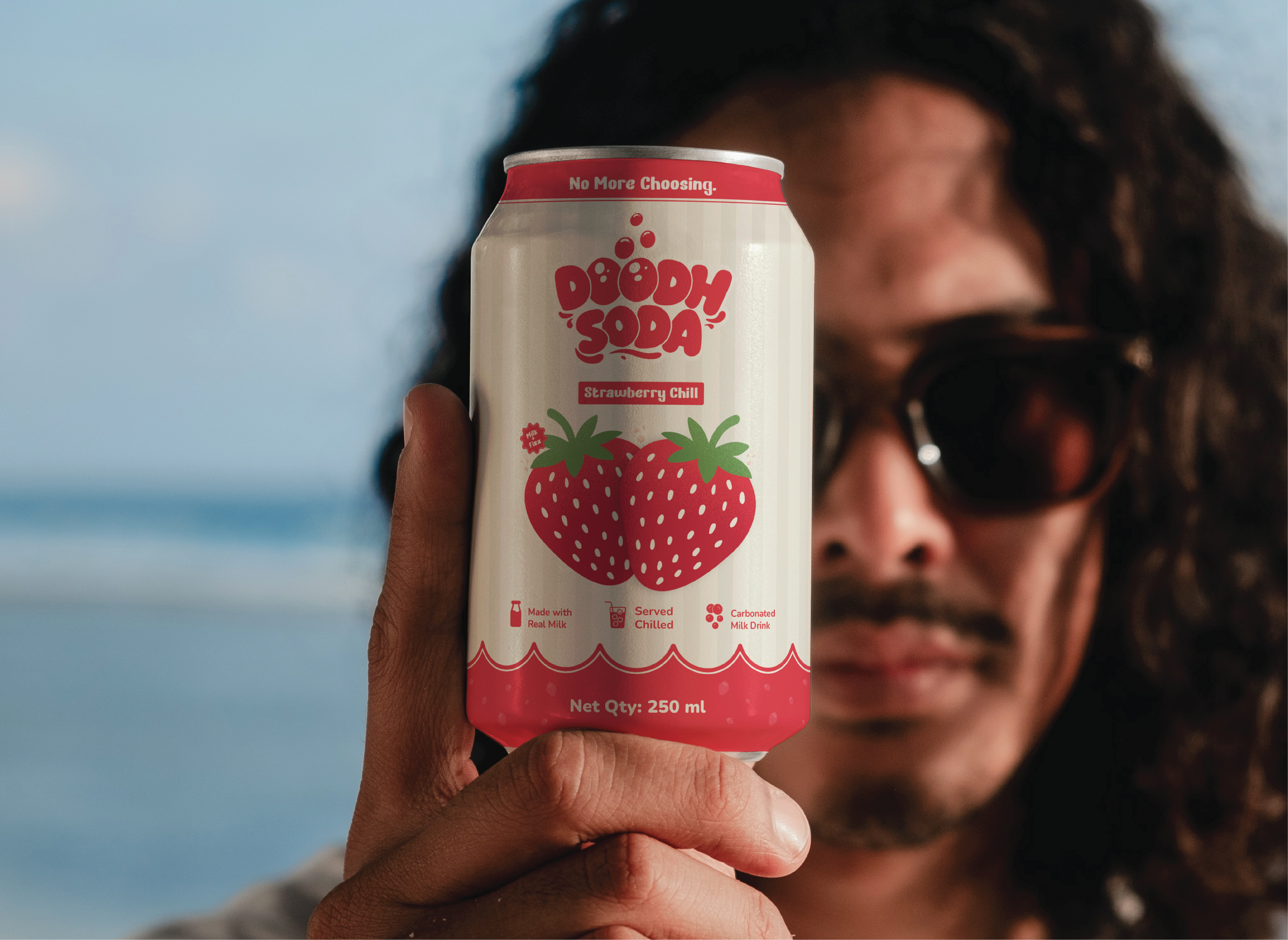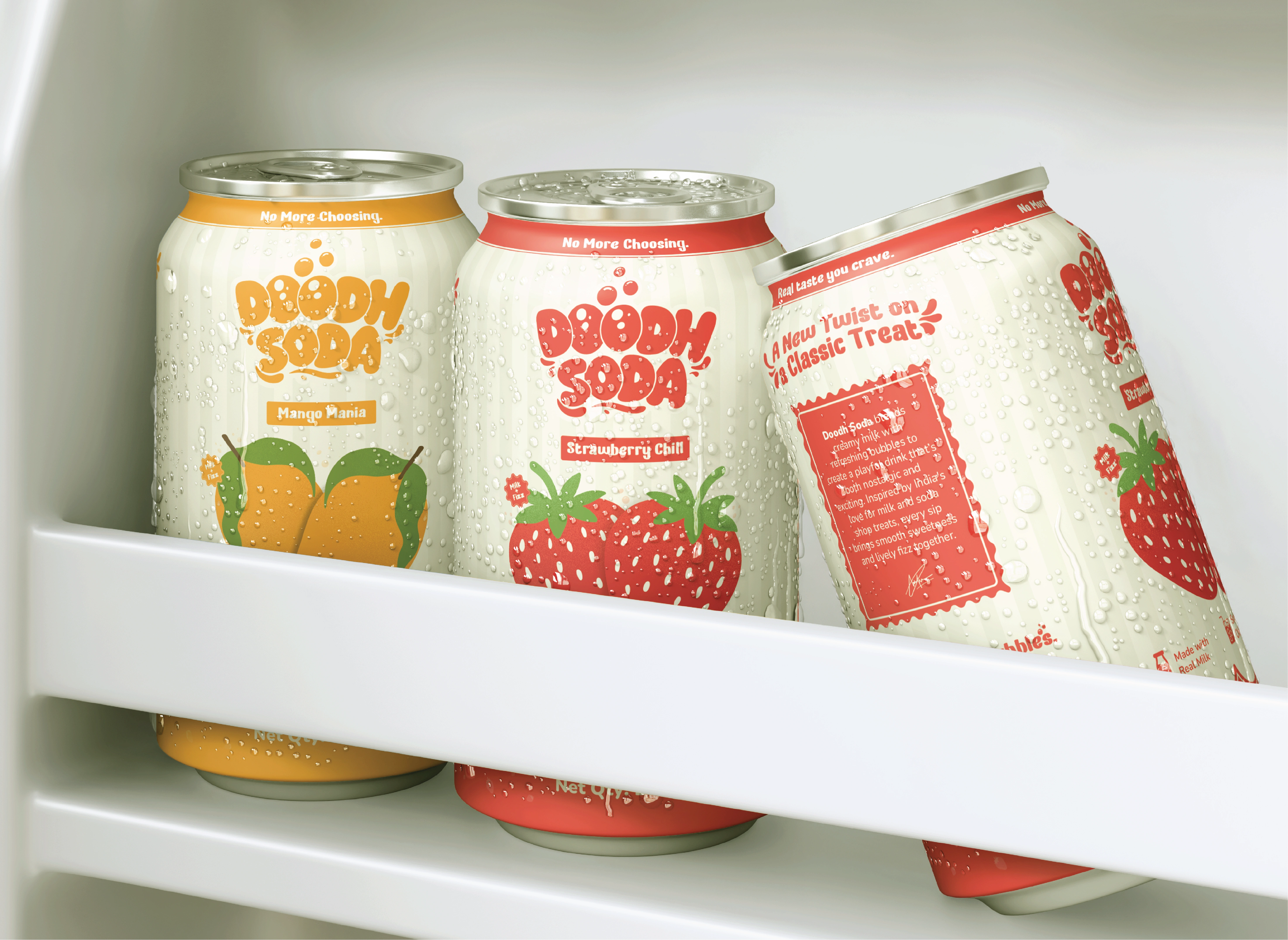 A bold, playful can design for Doodh Soda blending milk's purity with fizzy fun. Clean whites, vibrant pops of color, and a retro twist on a desi classic.