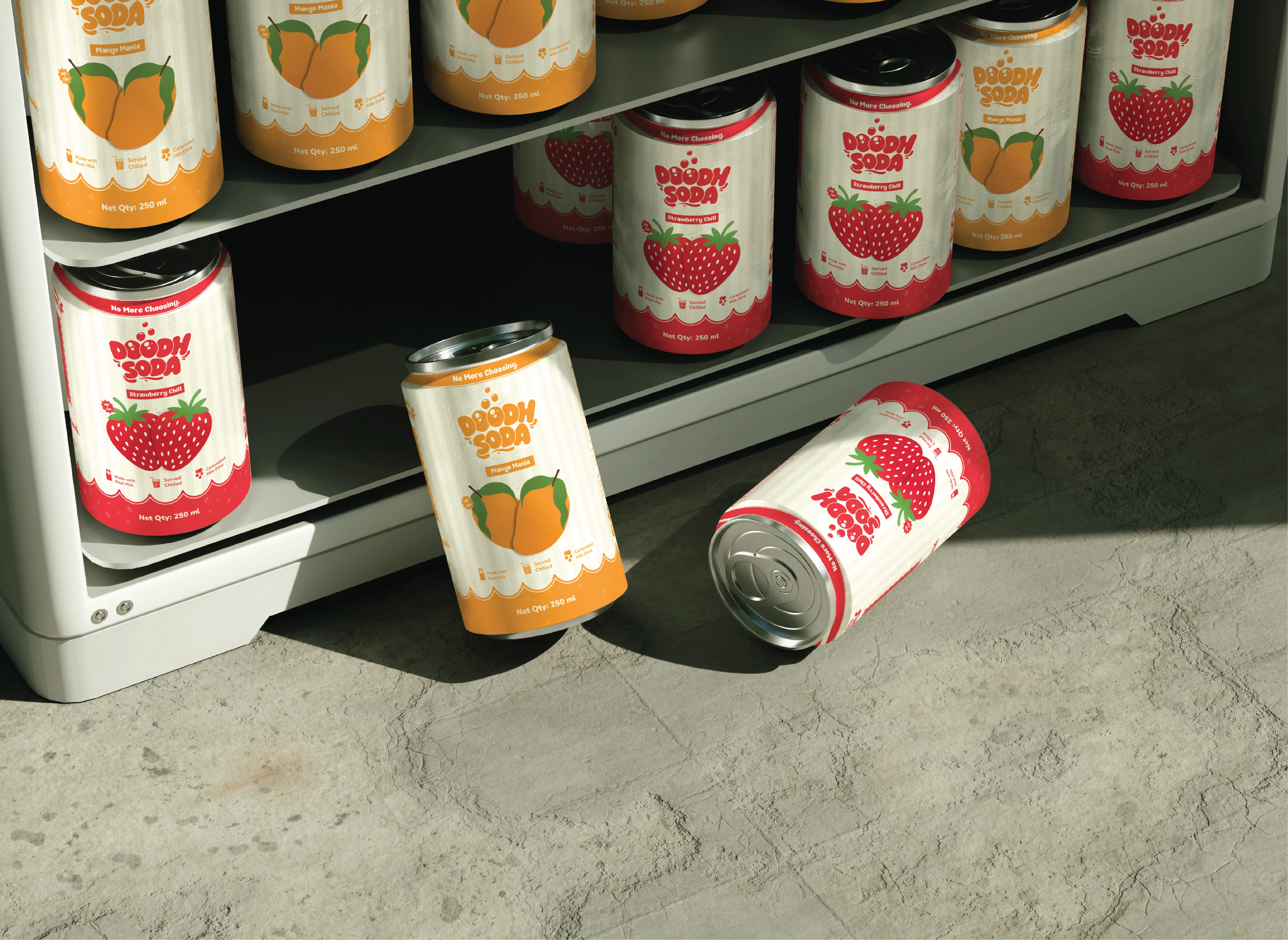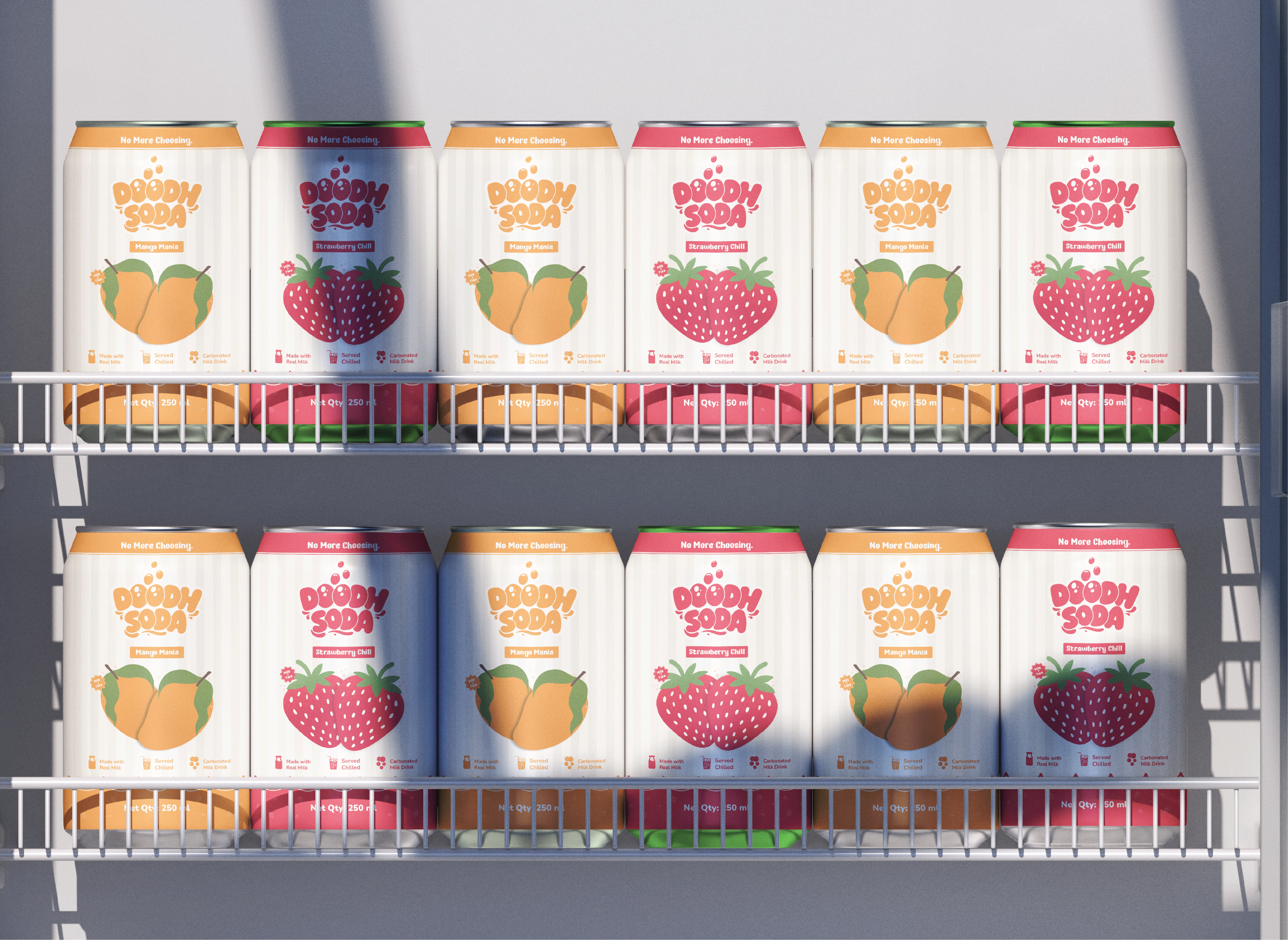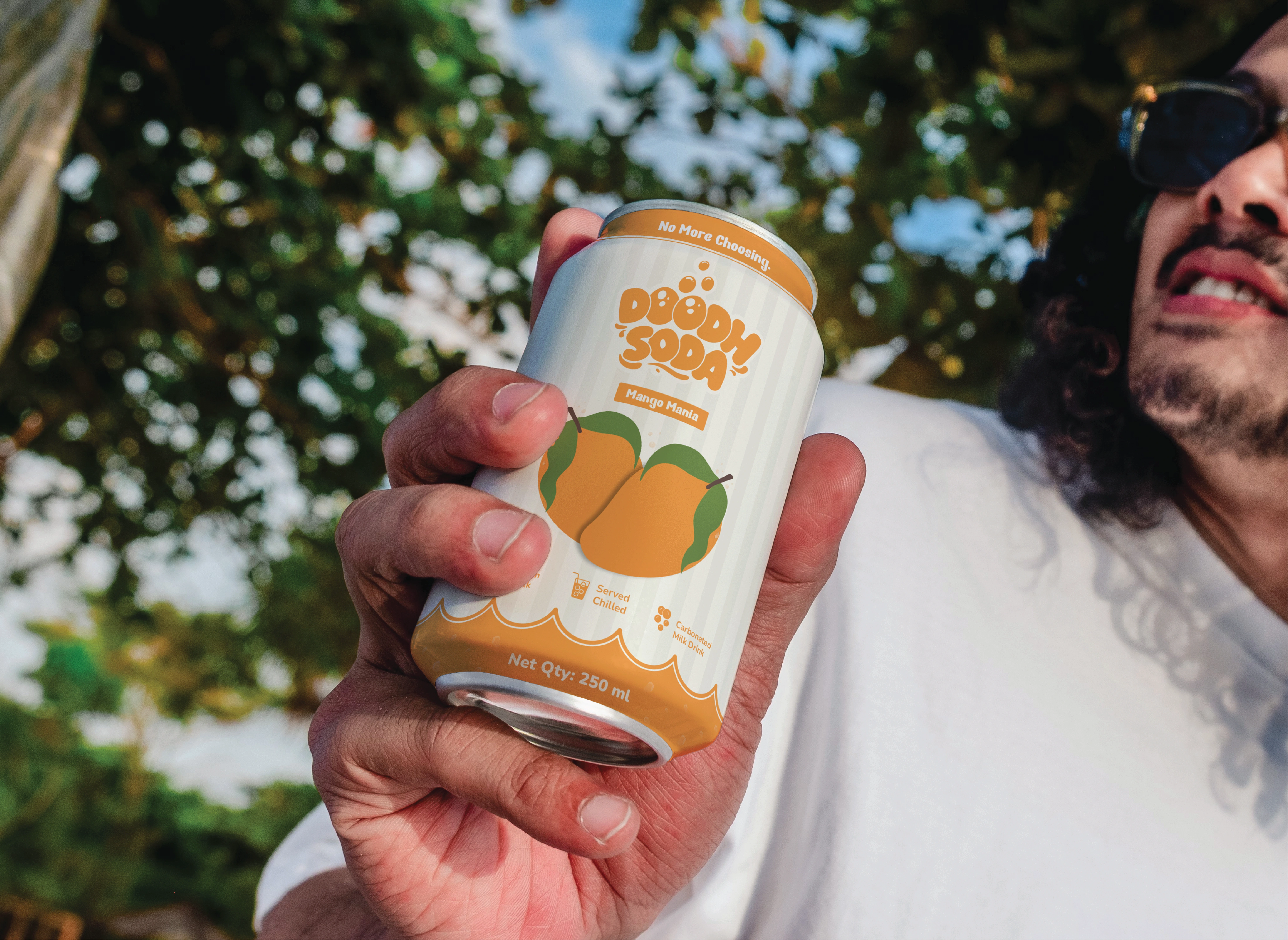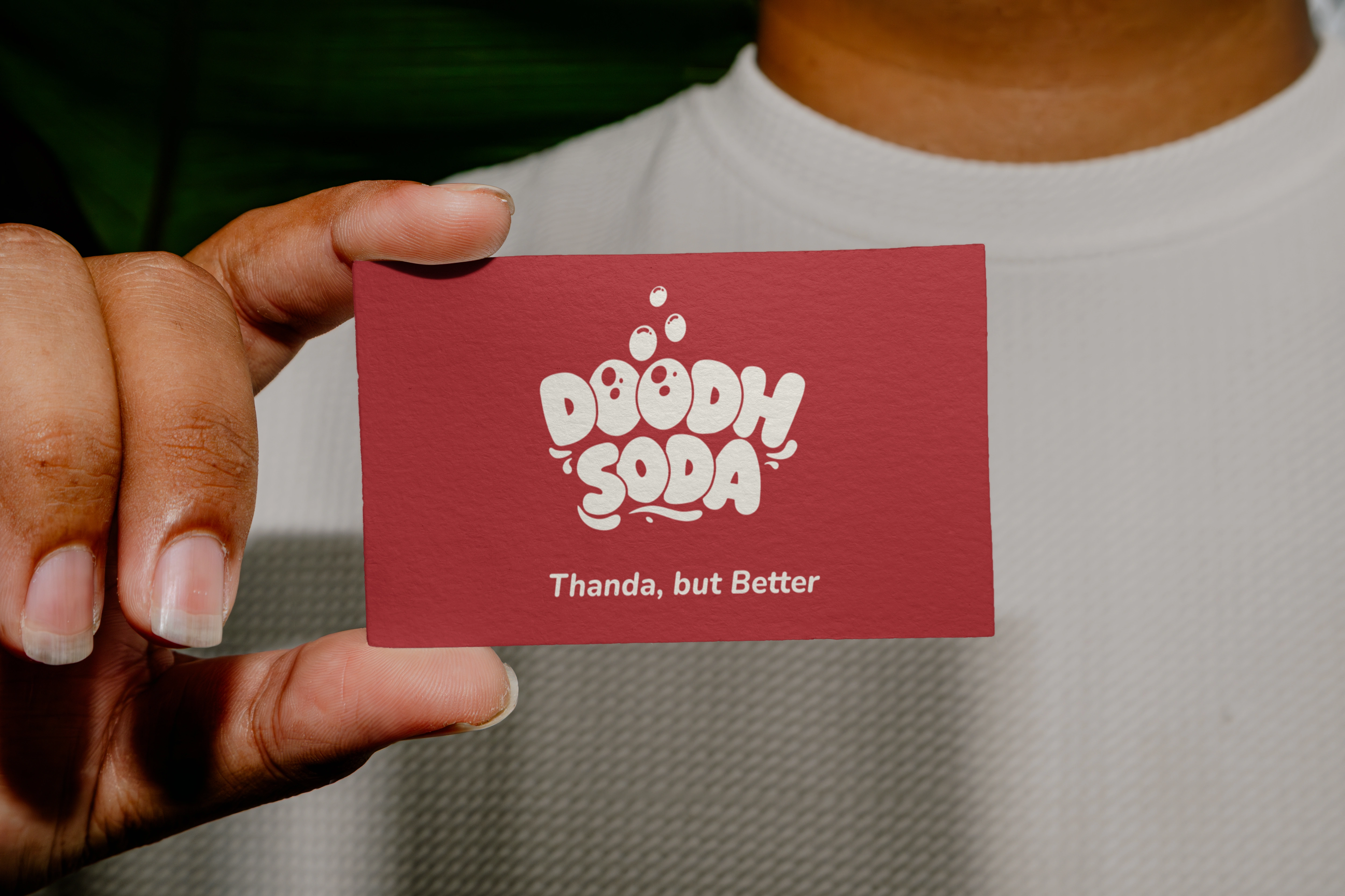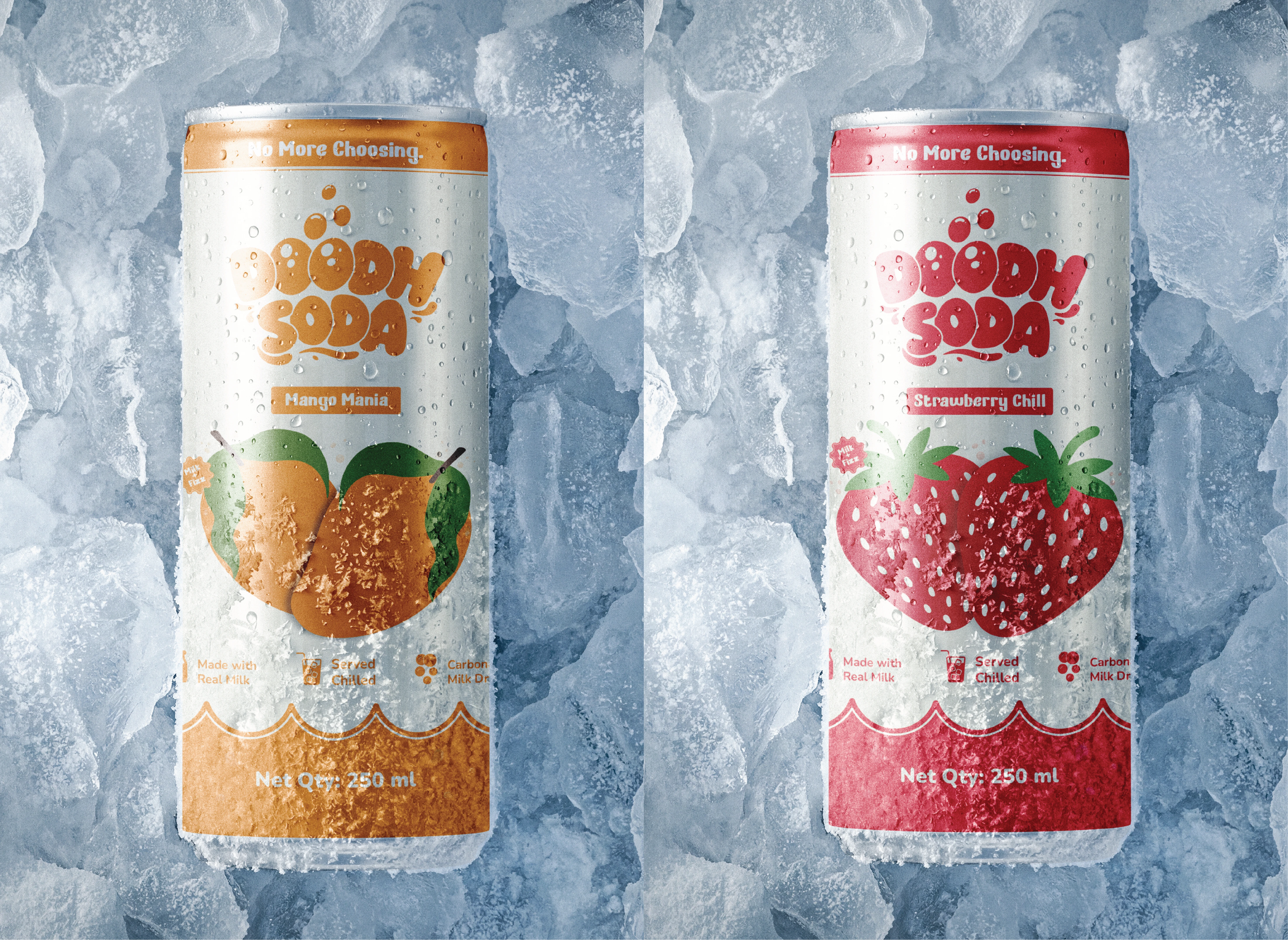 A bold, playful can design for Doodh Soda blending milk's purity with fizzy fun. Clean whites, vibrant pops of color, and a retro twist on a desi classic.