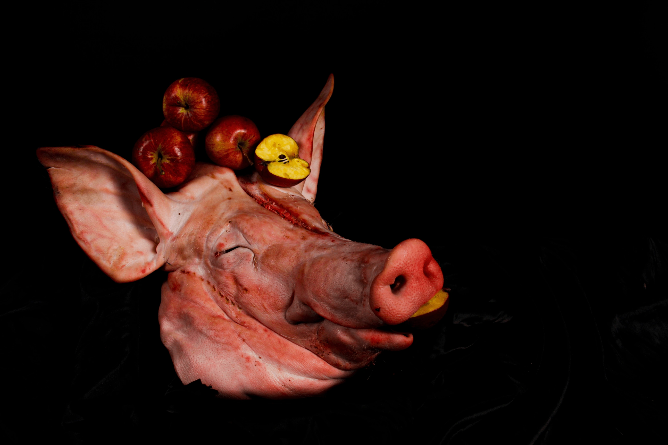A still life photo series confronting animal exploitation using a pig’s head and fruit to echo Vanitas themes and question ethical consumption.