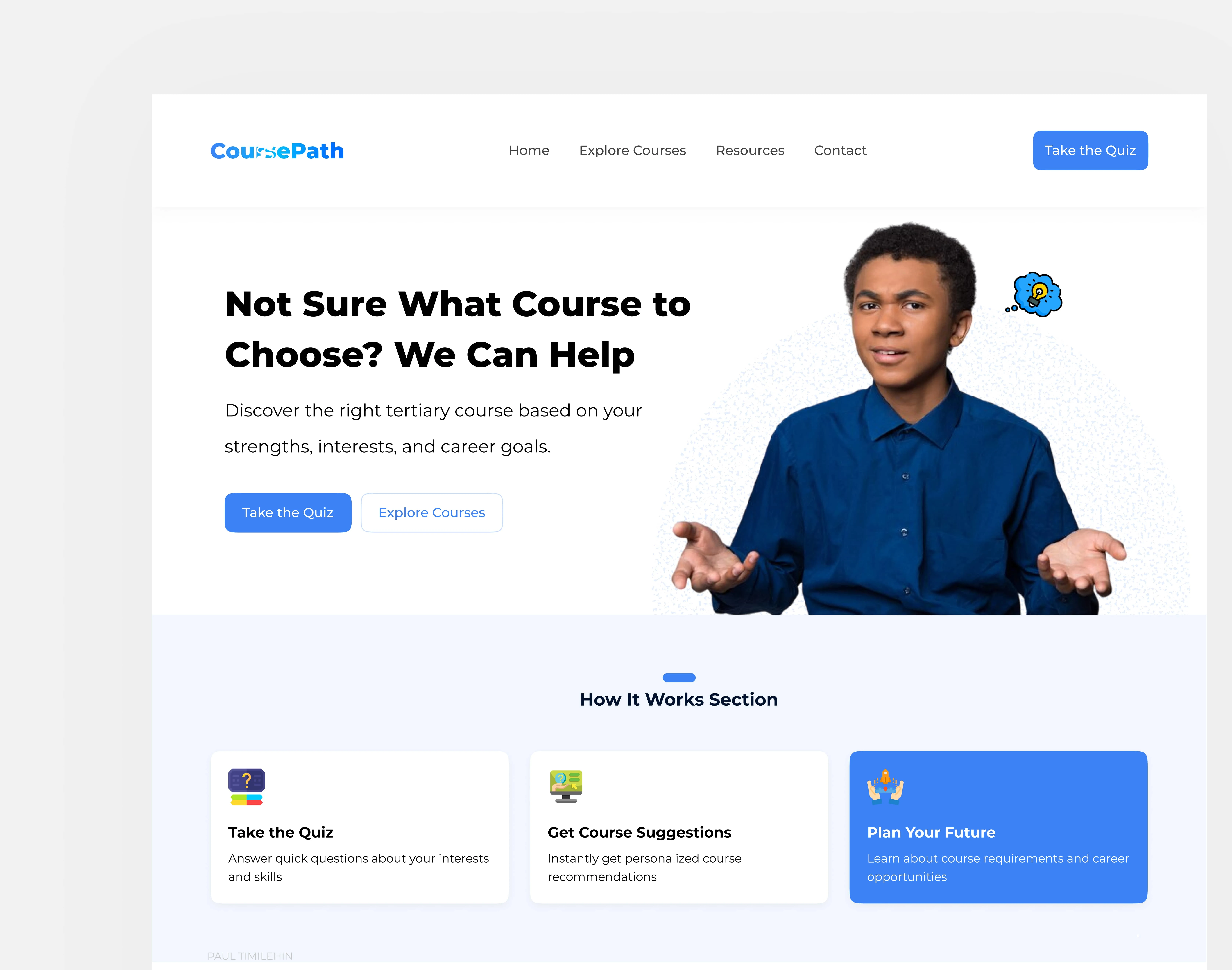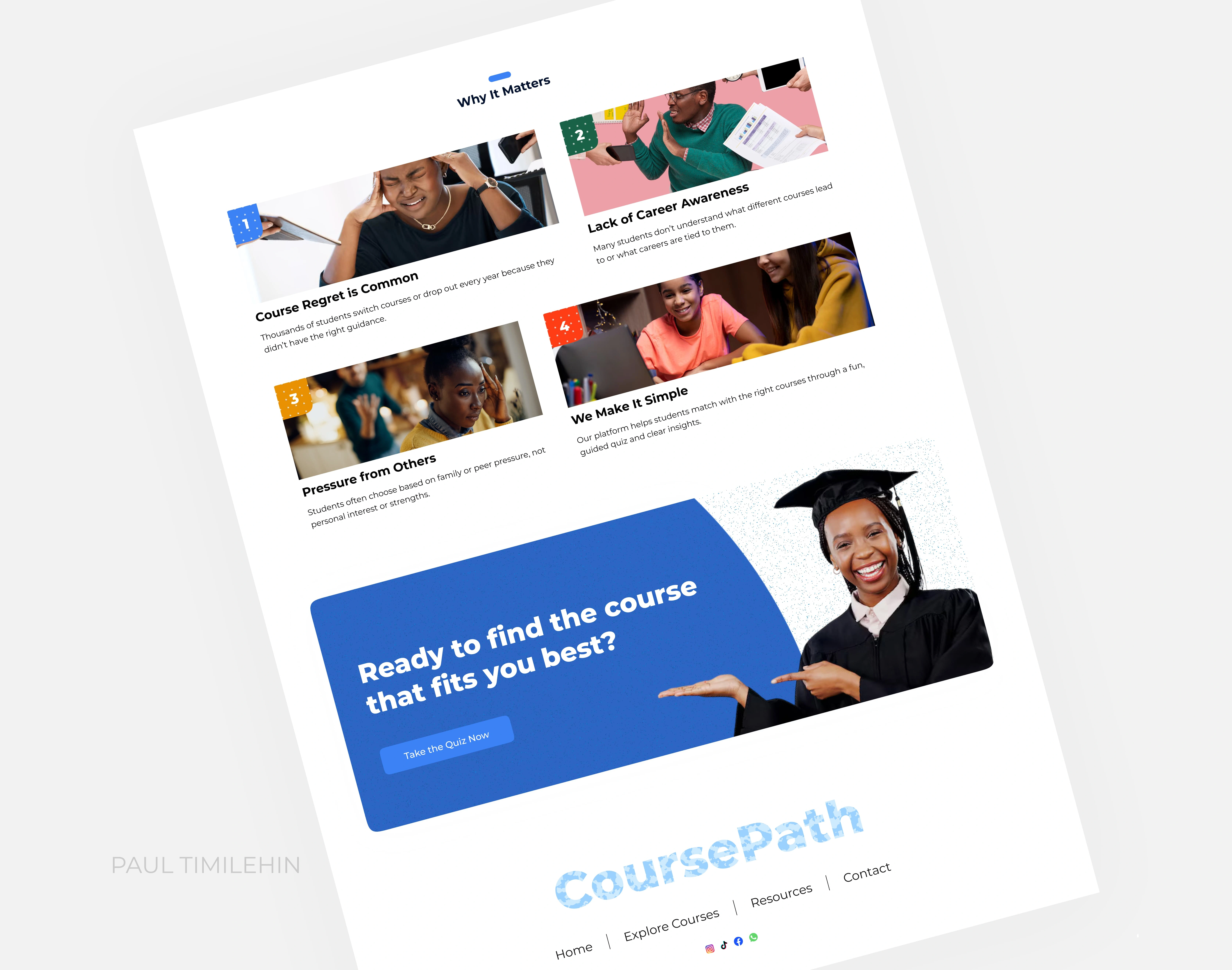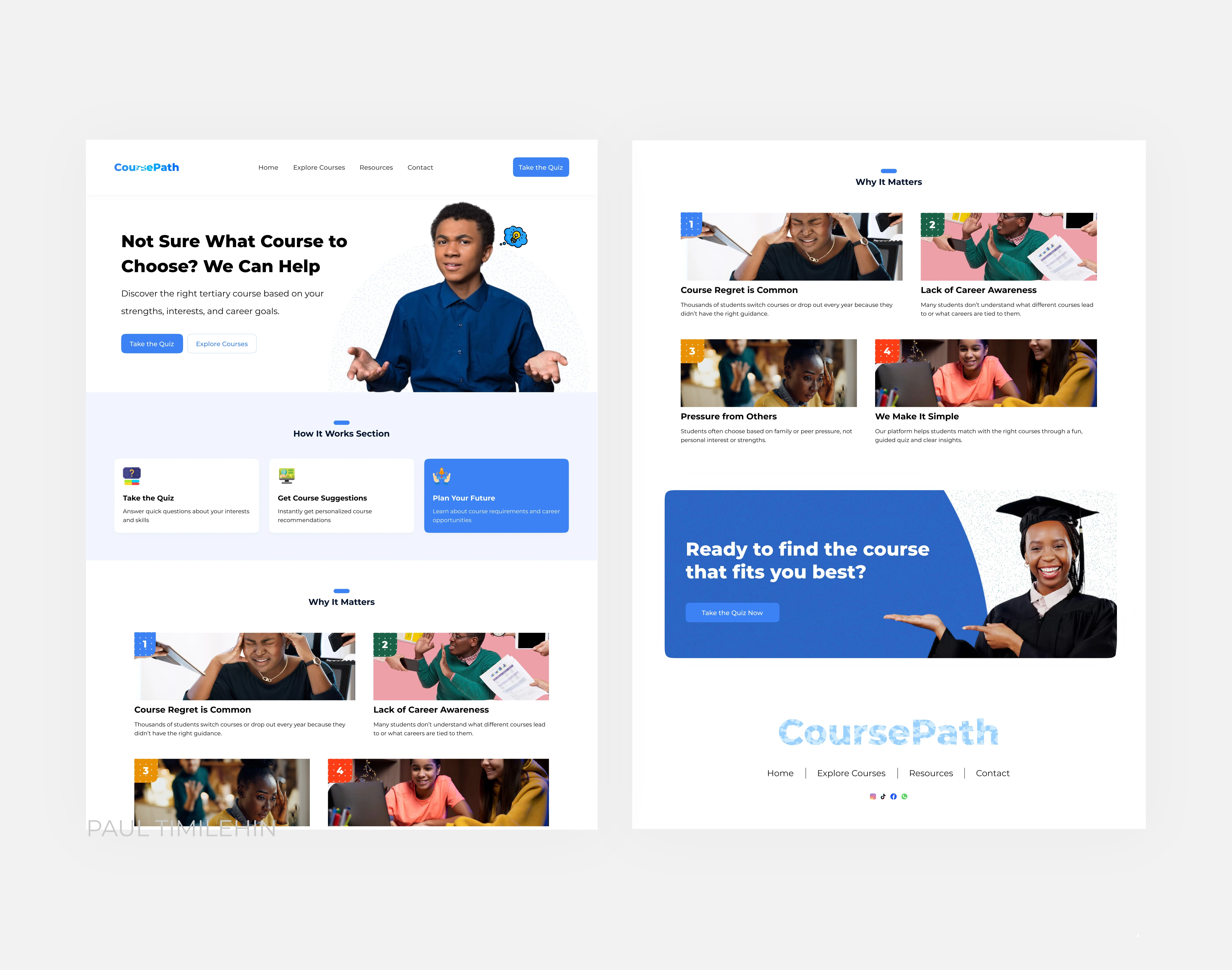 This design helps CoursePath build user trust, increase quiz engagement, and drive lead conversion. By simplifying the decision-making journey and addressing users’ pain points, it encourages more students to complete the quiz — giving CoursePath valuable data to improve recommendations and grow its user base. The approachable UI also boosts brand credibility, making it easier to gain partnerships with schools, sponsors, or institutions aligned with student development.