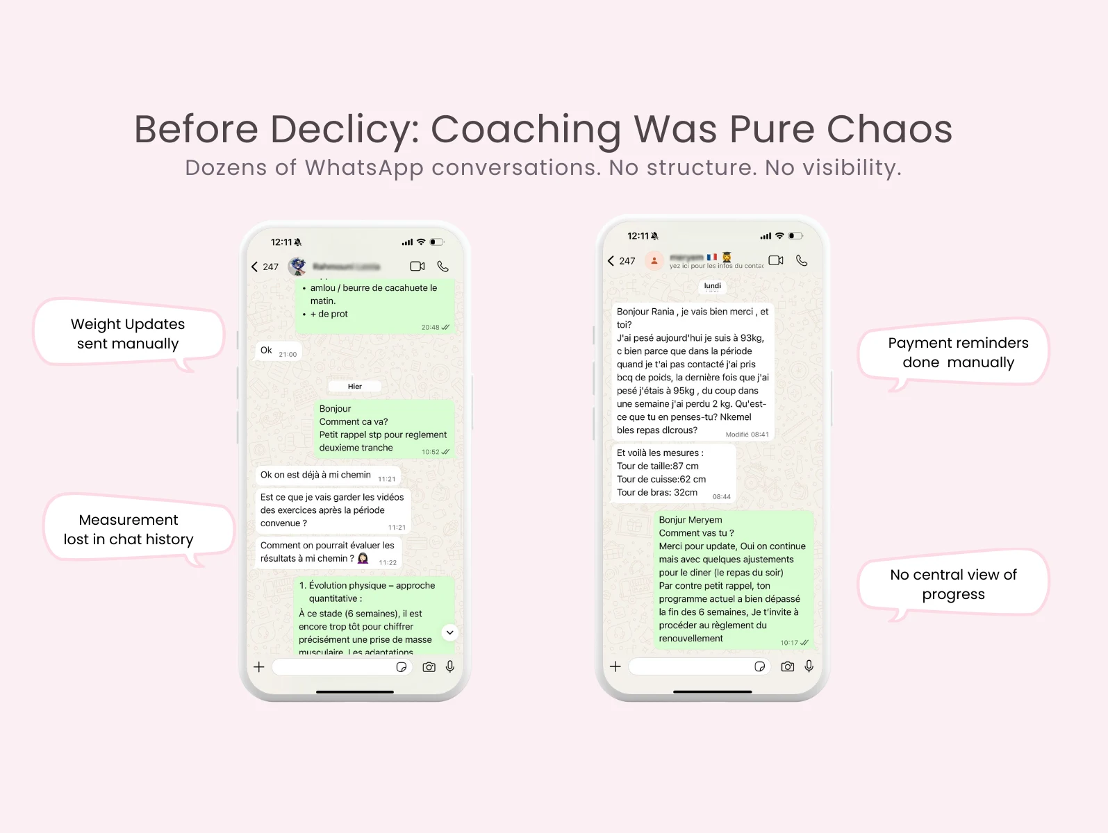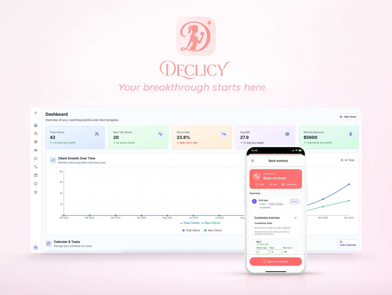 After testing multiple platforms (including MyPTHub), the coach adopted Declicy as a fully tailored solution—allowing her to save over 70% of her time while delivering a premium client experience.