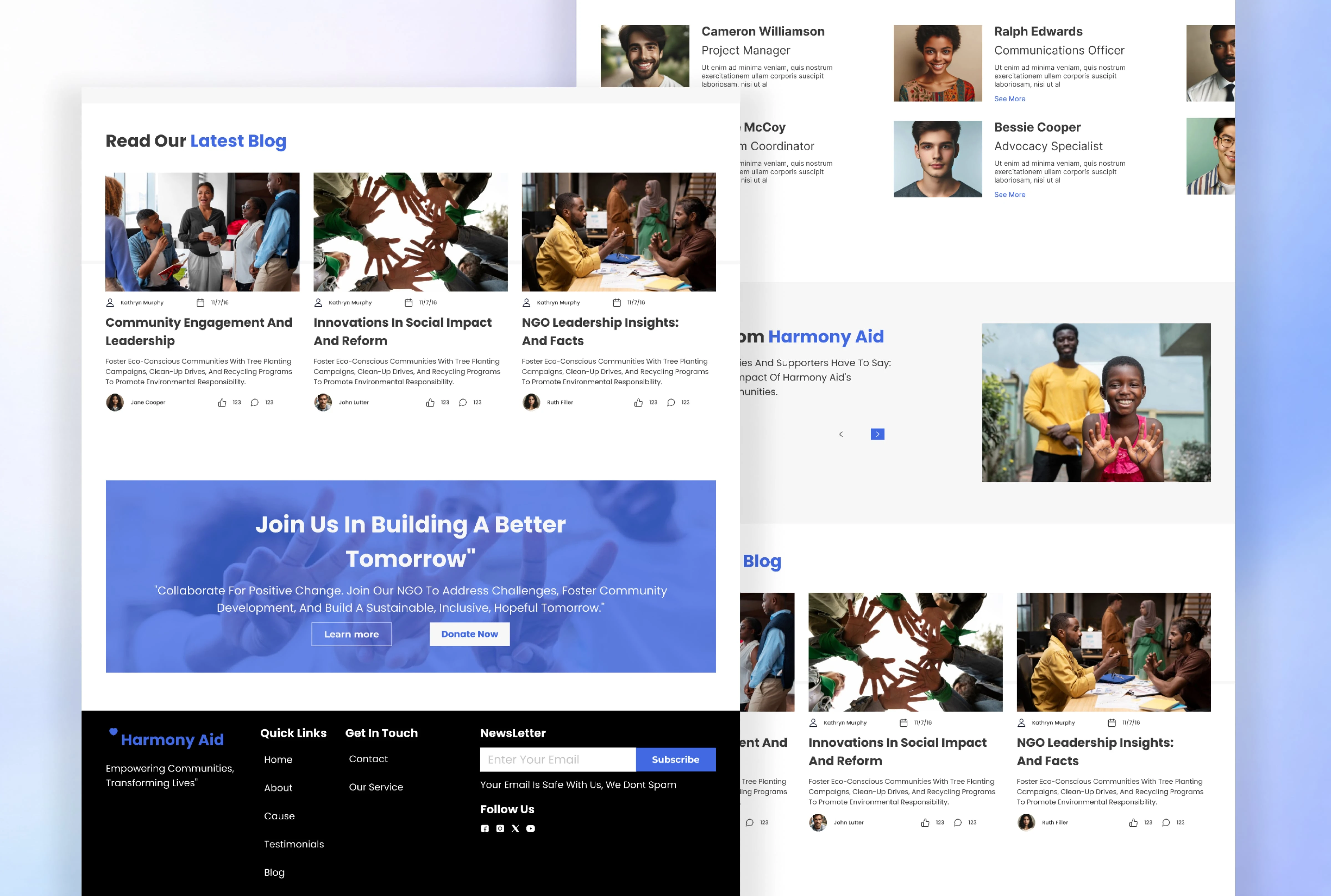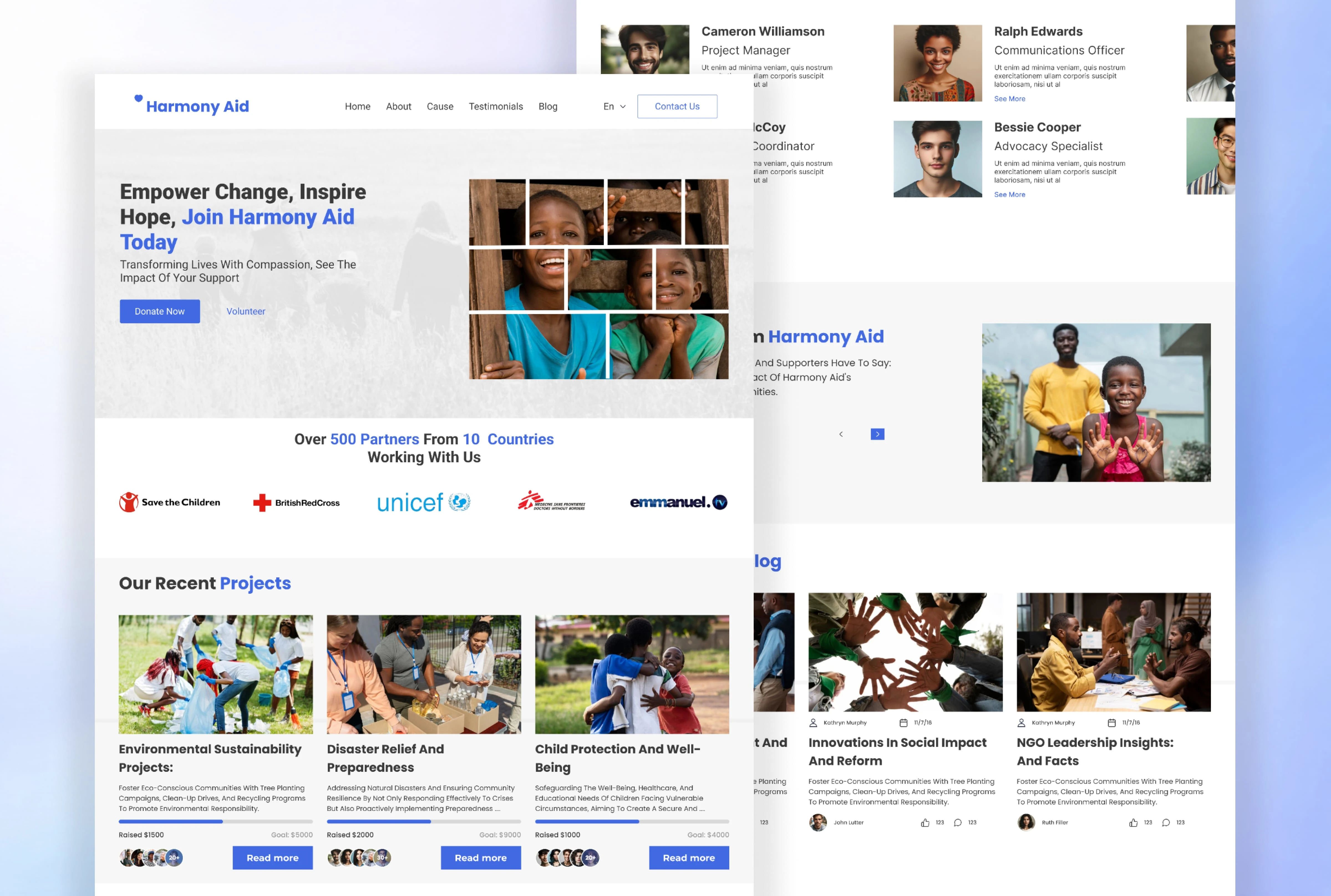 Harmony Aid is a nonprofit focused on providing humanitarian support and community development programs. The organization needed a modern landing page that could clearly communicate its mission, increase donor trust, and guide visitors toward meaningful actions such as donations, volunteering, and partnership inquiries.