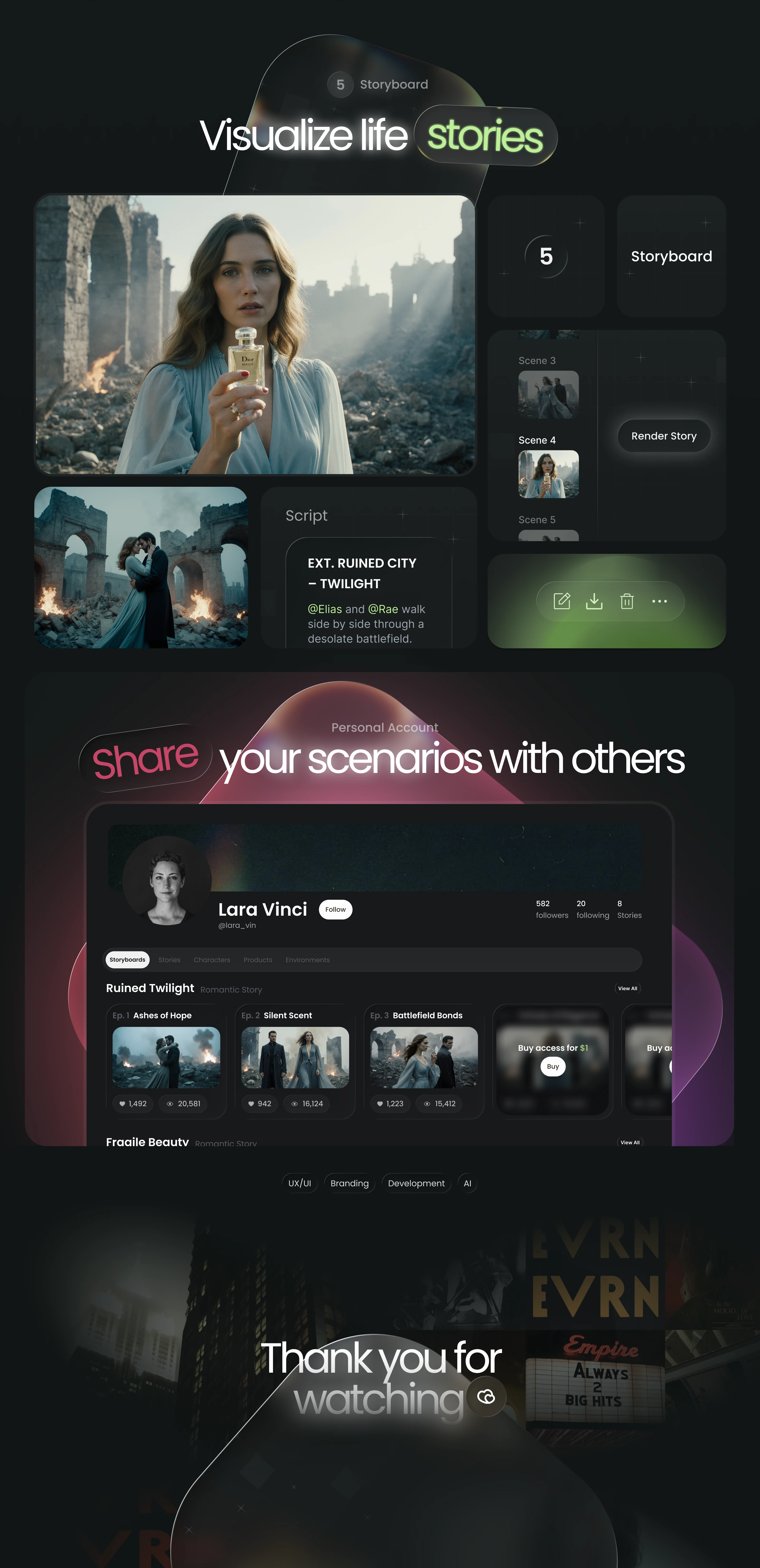 AI-powered platform that turns ideas into cinematic stories through a 6-step creative flow — combining intuitive UX with a bold, filmic style.