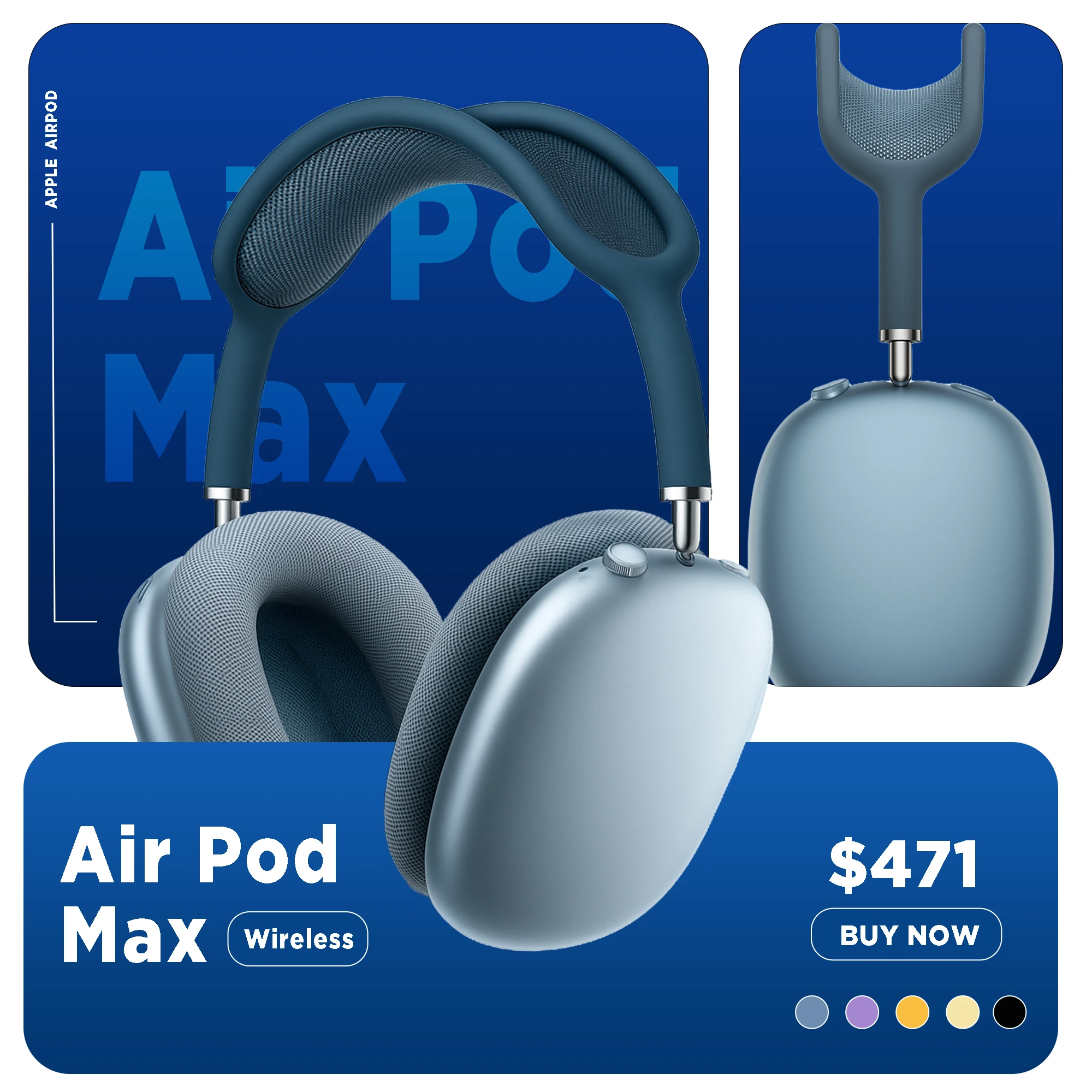 The layout uses a bold color palette to reflect Apple’s sleek branding, paired with detailed product imagery and clear typography to emphasize key selling points like wireless connectivity, price, and color options. Strategic use of gradients, rounded shapes, and spacing ensures a user-friendly and attractive ad layout that can be used for web, social media, or e-commerce platforms.