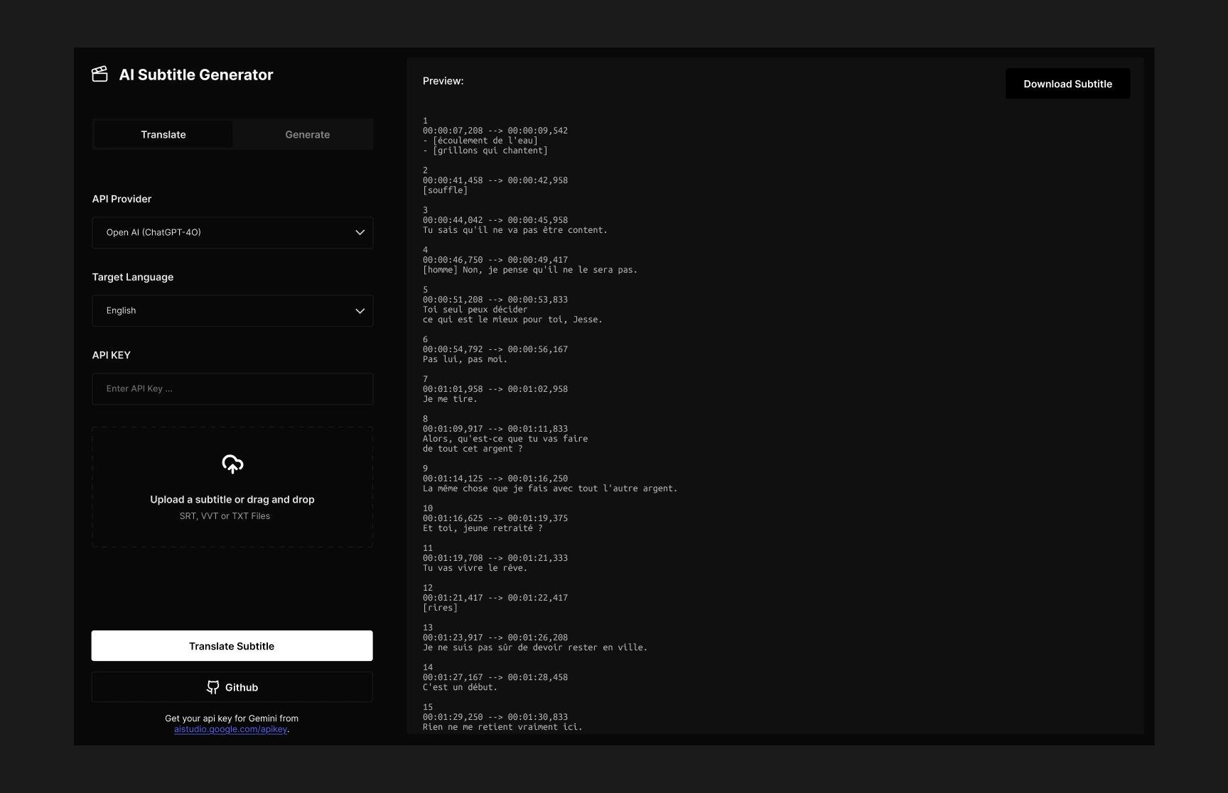 Subtitle Generator (and Translator) is a web application built with Next.js that leverages top AI models—ChatGPT, Claude, and Gemini—to generate and translate subtitles efficiently.