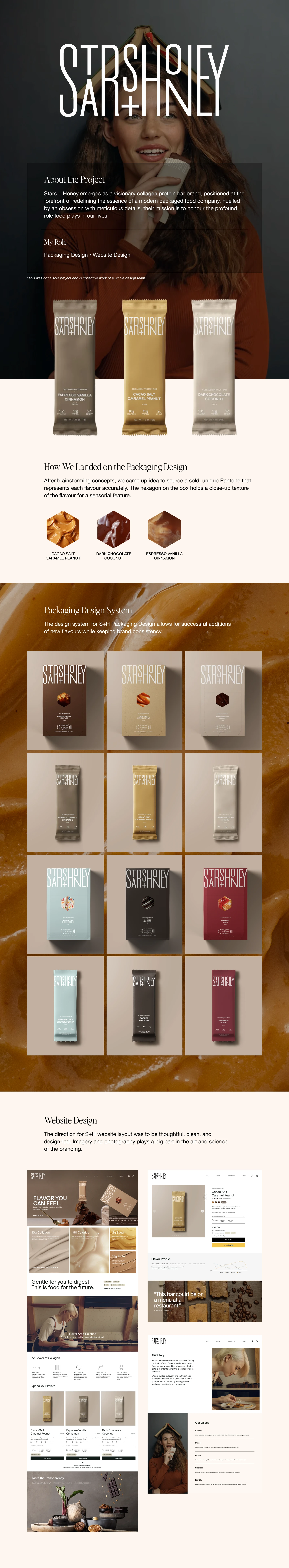 Mood boarding, website design, and packaging design for Stars+Honey, a visionary collagen protein bar brand.