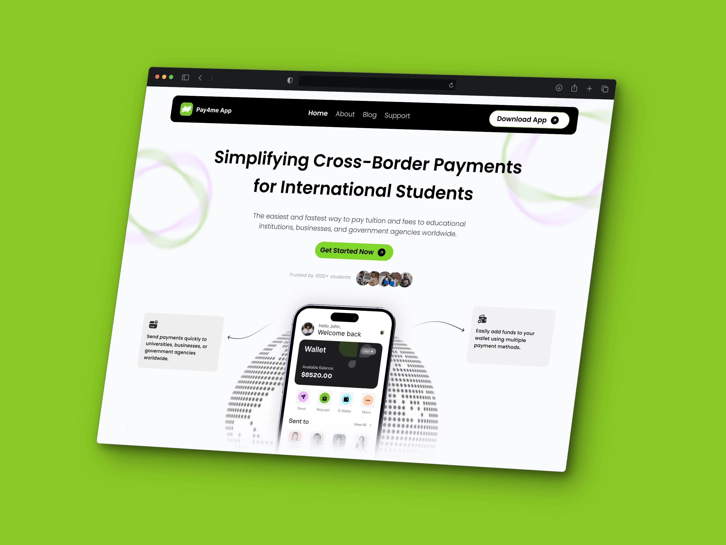 Designed a clean hero section for a cross-border payment app for students, with clear CTAs, sleek UI, and visuals highlighting fast, secure transactions.