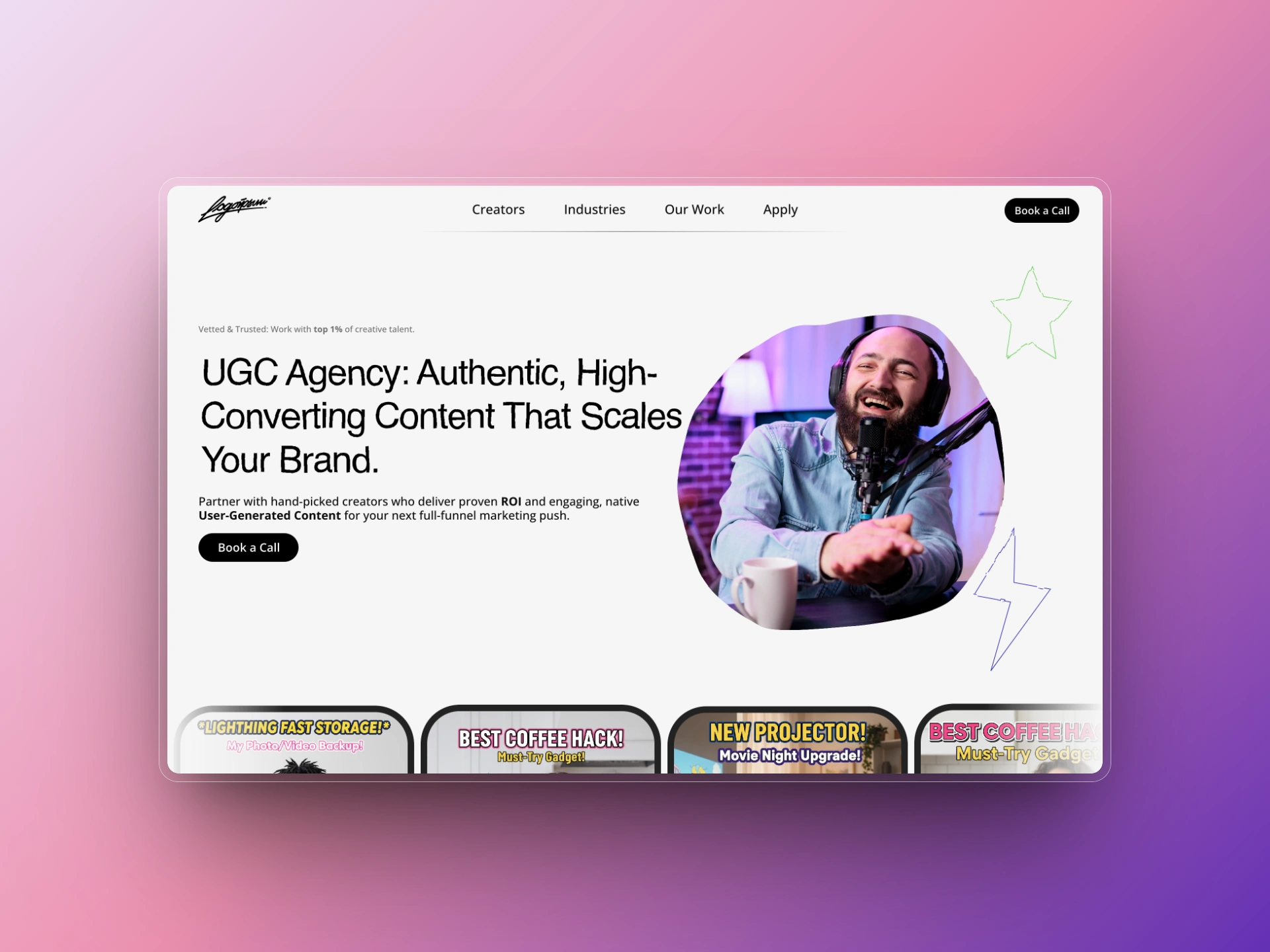 I designed this hero section for a UGC agency. Had a lot of fun experimenting with colors and effects to make the page feel alive and a space for creative people.