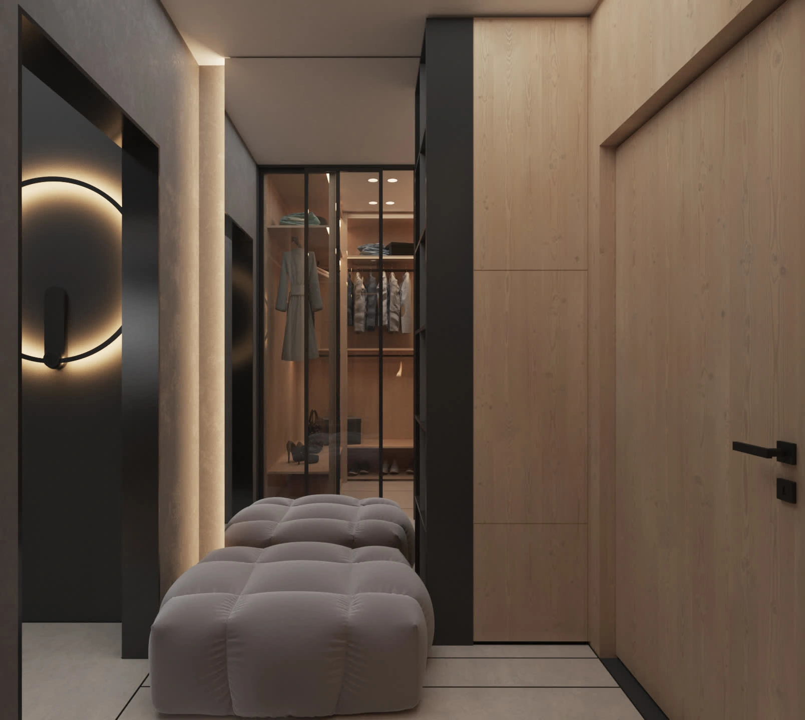 Urban modern and fresh, this South of France apartment features calming tones, chic open spaces, and a harmonizing black and wood semi-luxurious ambiance.