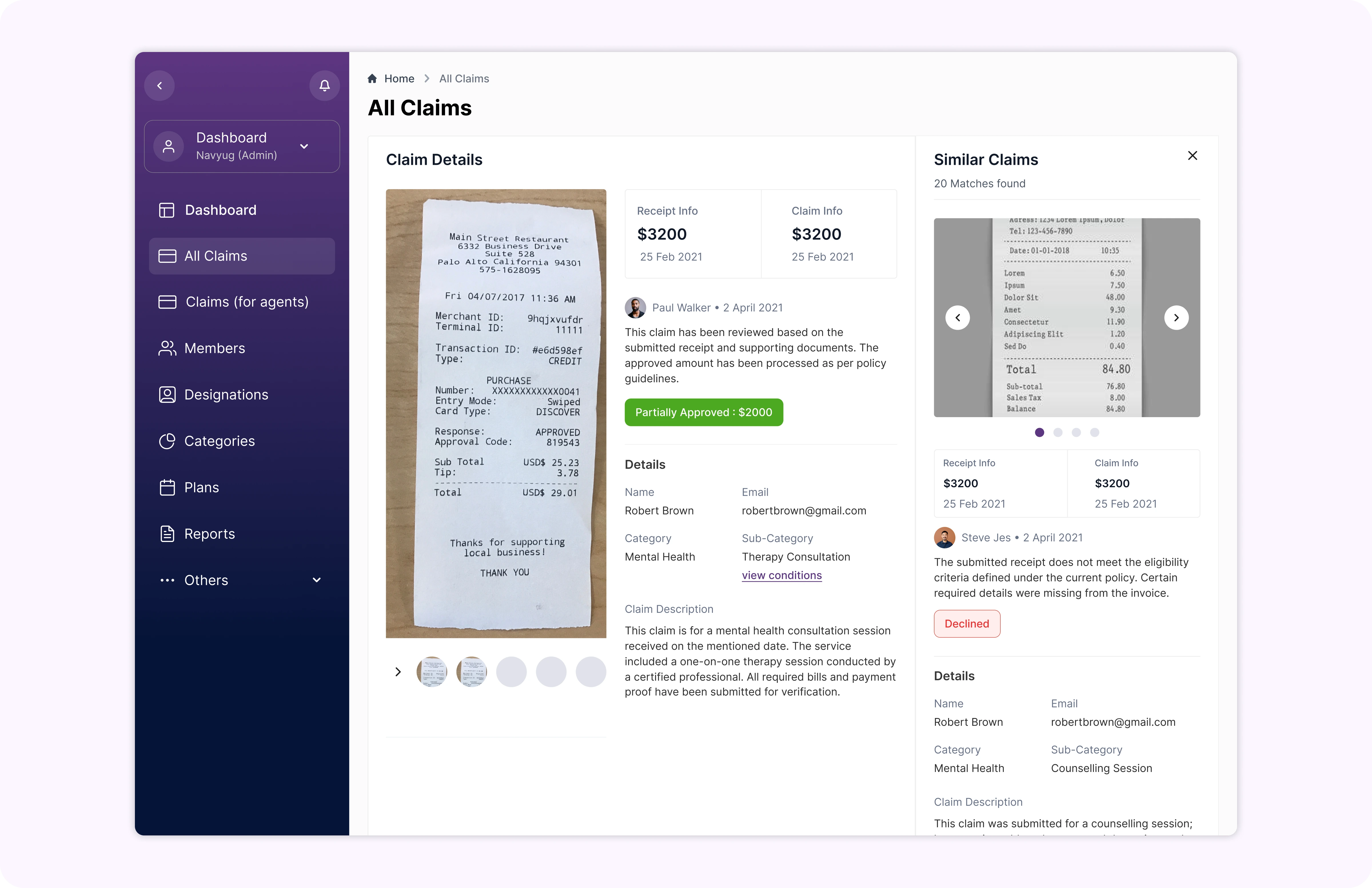 Claim management (Approval, Partial Approval, Decline with reason)