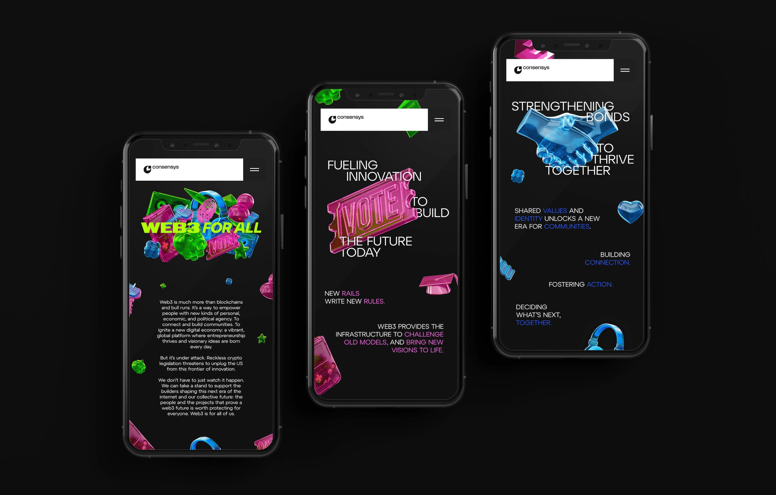 In partnership with Consensys and the creative team at Invisible North, I designed a narrative-driven landing page that brought the Web3 For All campaign to life. This hub became the campaign's digital heartbeat, weaving together its compelling vision through curated interviews, thought-provoking articles, valuable resources, and essential links.