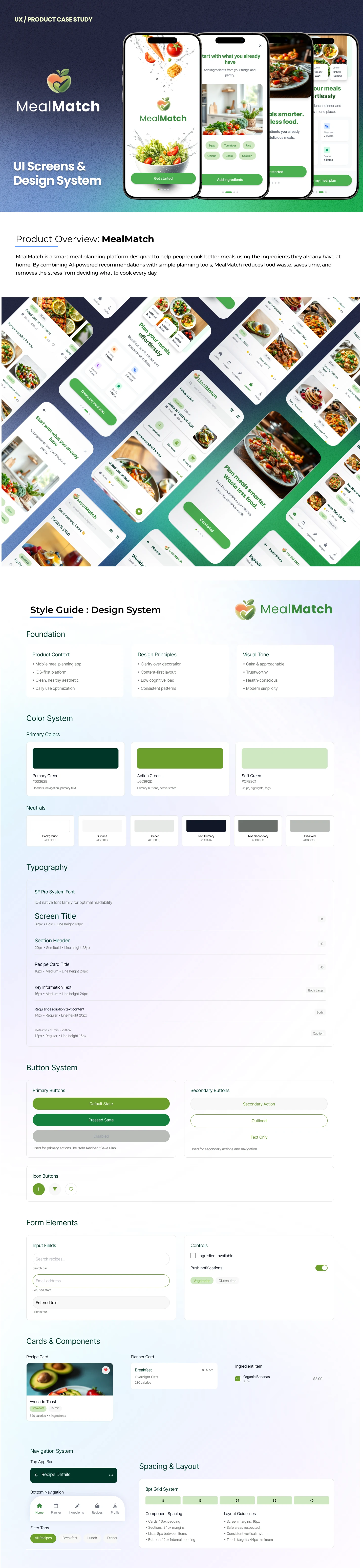 UI-focused case study showcasing mobile screens and a scalable design system for a meal planning app.