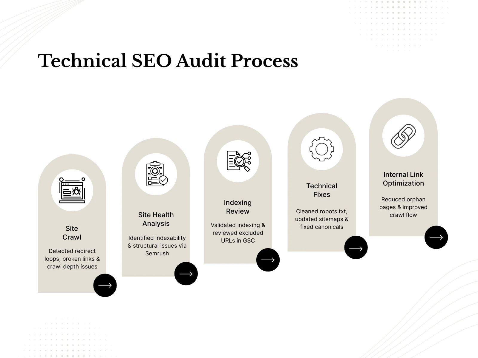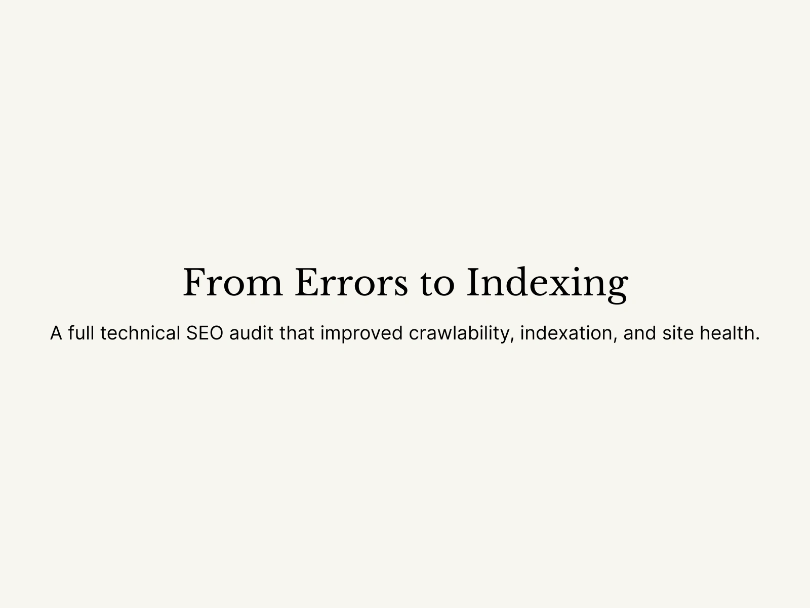 Improved indexing, visibility, and site health by fixing technical errors, optimizing internal links, and boosting crawl efficiency.