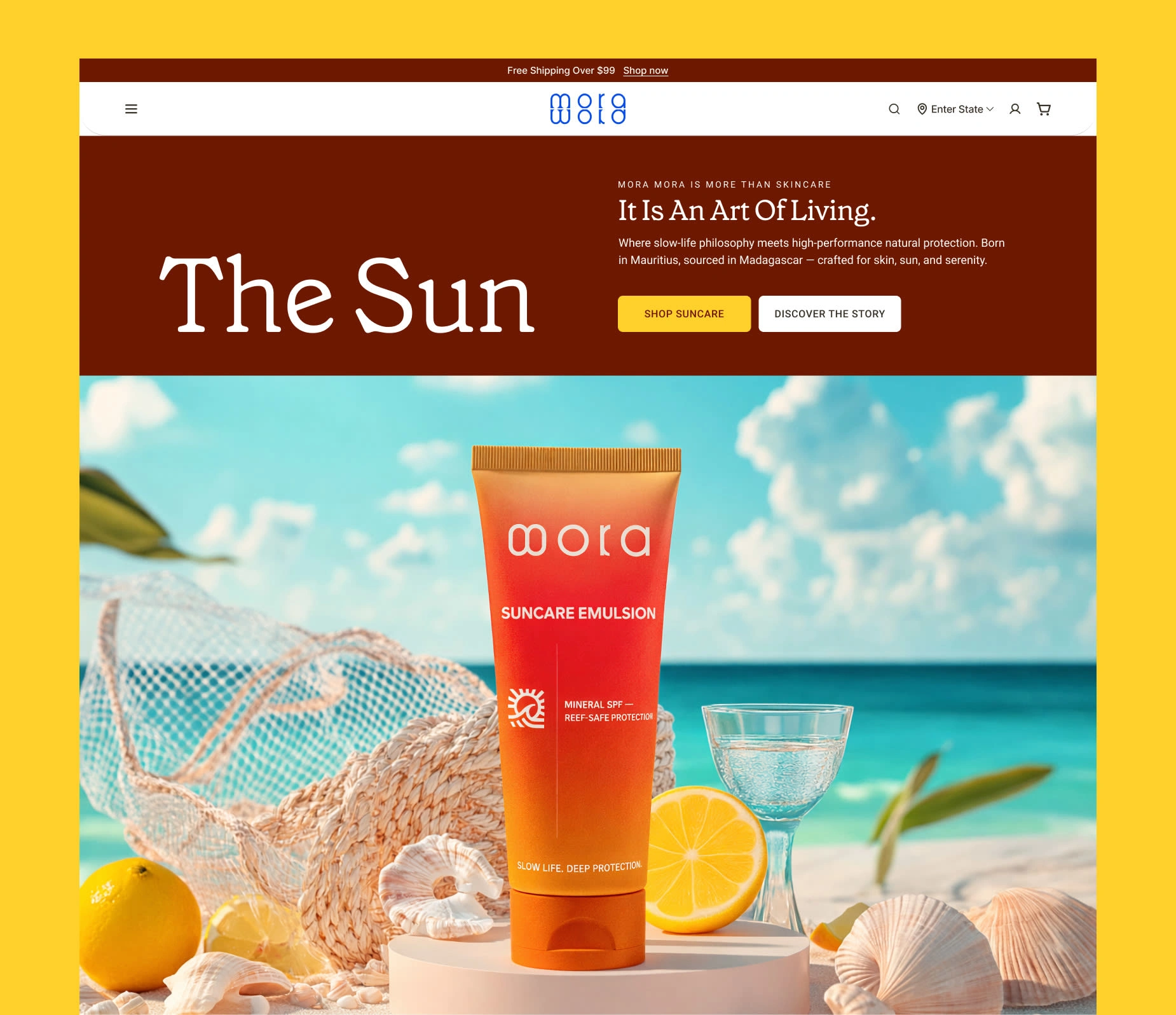 "Mora Mora" is a concept for a premium sunscreen brand focused on natural ingredients, high protection, and a glowing finish. The goal was to design a long-form landing page that functions as a complete sales funnel—taking the user from initial brand discovery to education, trust-building, and finally, conversion.