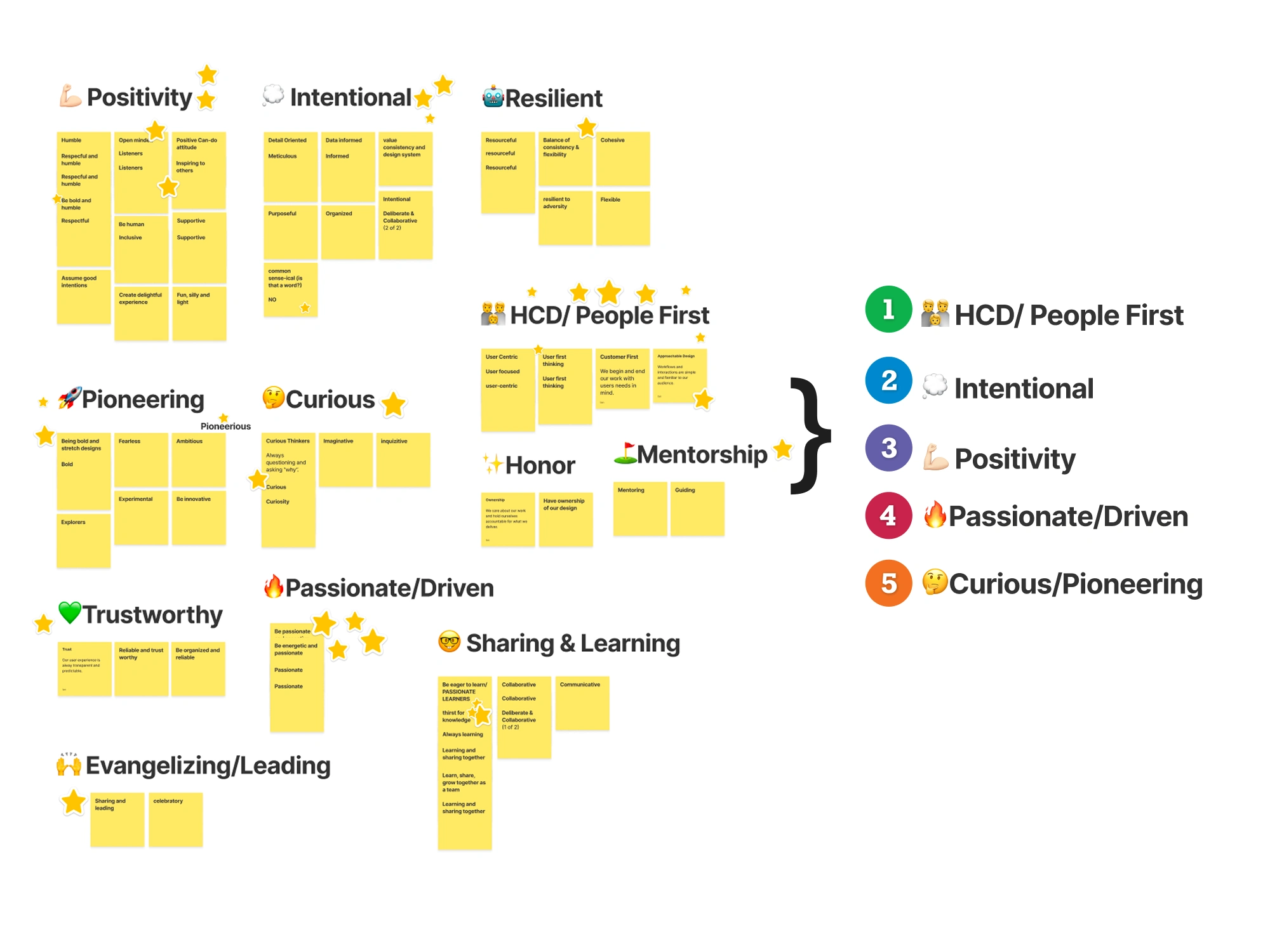 The input from the questionnaire was added to a Figjam, and during the initial session we took 200+ attributes and narrowed them down to 5 key qualities to build from.