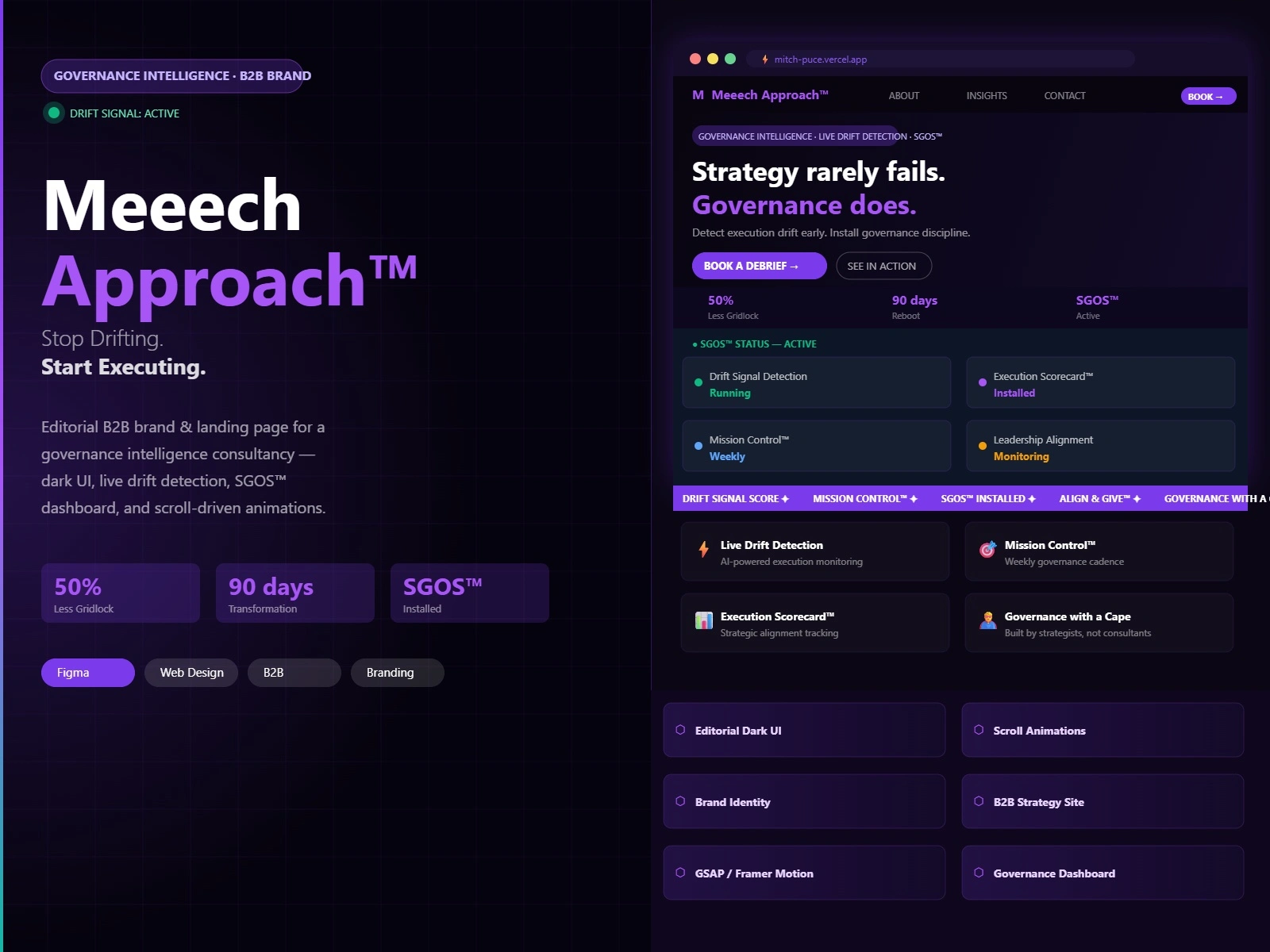 Editorial dark-UI brand site for a governance intelligence consultancy — SGOS™ dashboard, live drift detection, scroll animations & bold B2B identity.