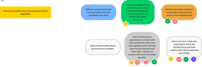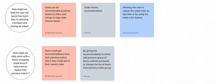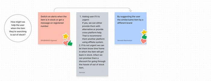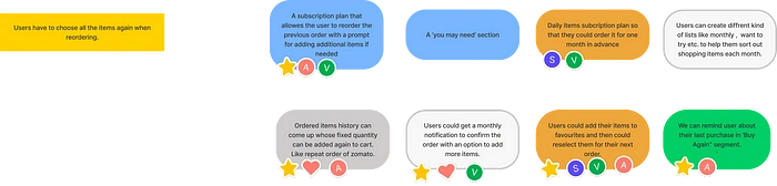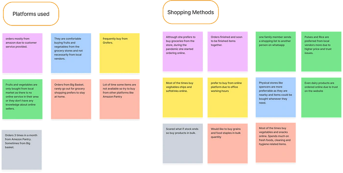 Figjam helped us to keep a track of our individual contribution using the colours of sticky notes and other tools. That also made it easy for us to track back and fourth easily without creating any mess. You can notice that most of my insights are in the grey coloured sticky note with my name at the bottom.
