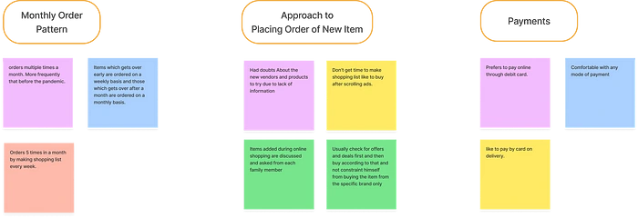 We observed a user pattern based on which I added a few categorries and started segregating the data. But then my other team members felt the need to reframe the user insights and iterated on how to place them under different patterns that were observed. I observered this step understanding their point of view and watched different iterations unfold.