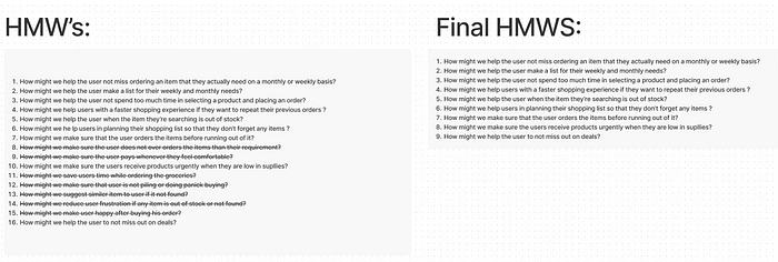 Based on research validations we listed down the following how might we questions. We discussed over them and scoped them down to a final list on the right side.
