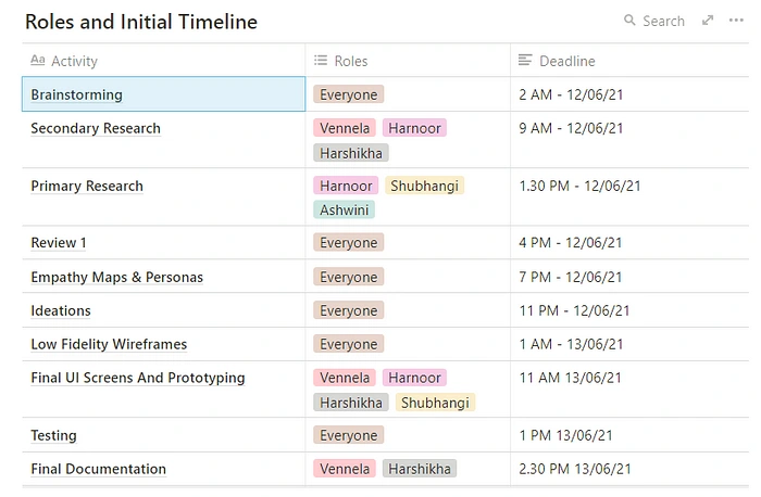 This was our timeline and division of roles yet to tested with how practically things roll out for us once in action.