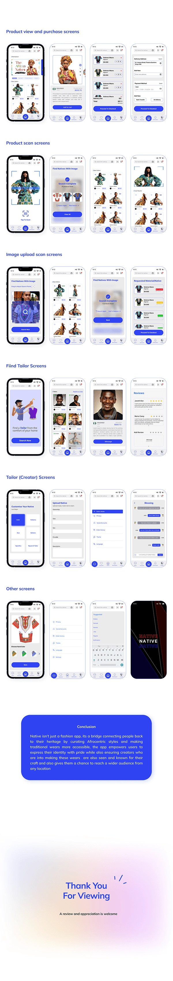I designed NATIVE, an app to easily find, customize, and order African native wears. with features like search, scan, and customization of African native wears.